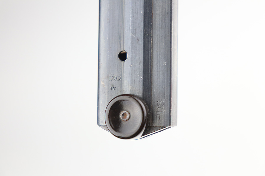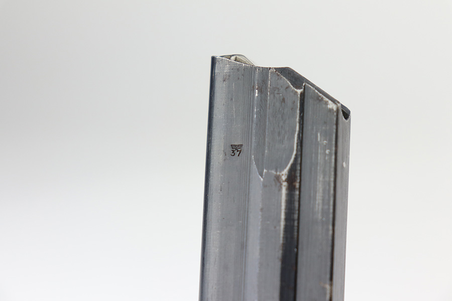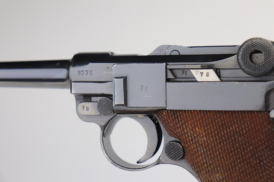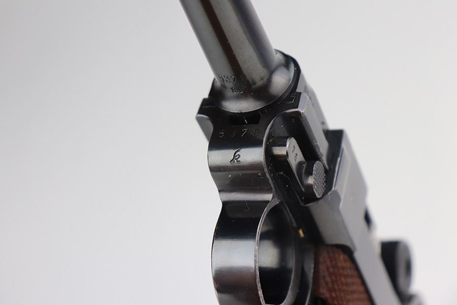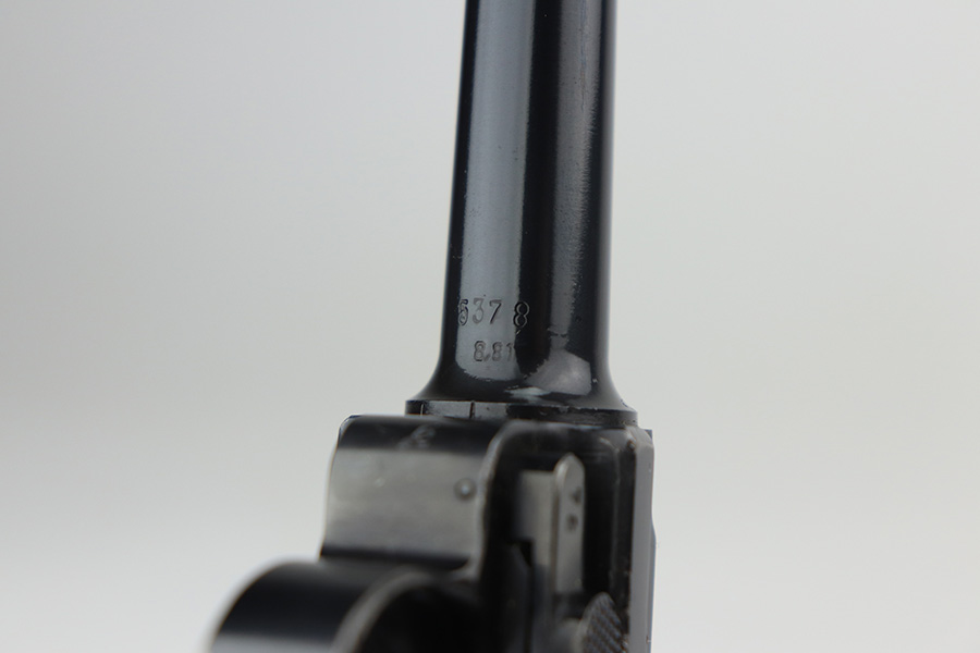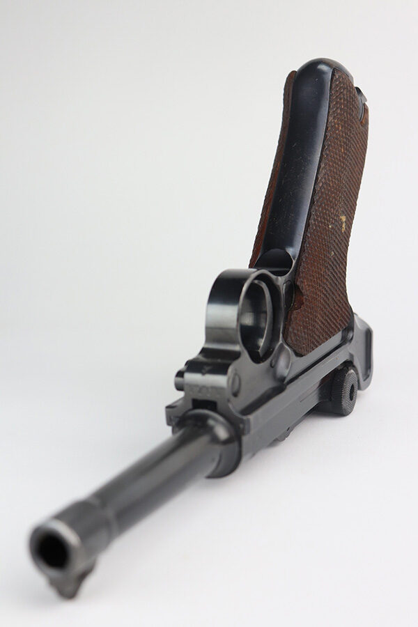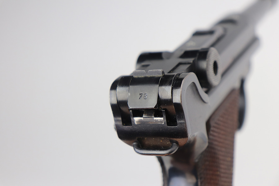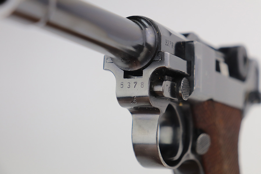 6/17/21 – This is a minty example of a Mauser Luger issued to the Nazi military in 1940. The gun is all matching and has the proper “Eagle 655” military proofs. It has retained about 98% of its finish with just hints of wear on the side rails and around the muzzle. One very small spot on the back strap. There are tiny handling marks on the barrel, side plate, left side of the frame, and on the front strap. Comes with very nice waffen-proofed grips (a few minor bruises) and a black widow magazine. The bore is factory-new.