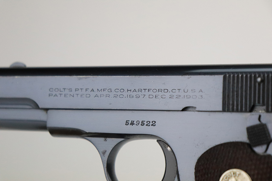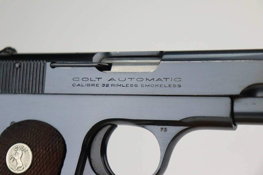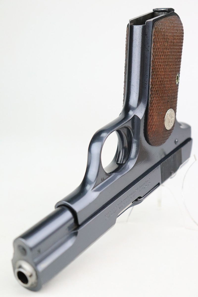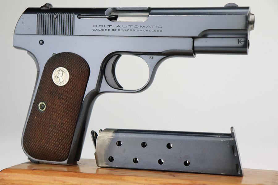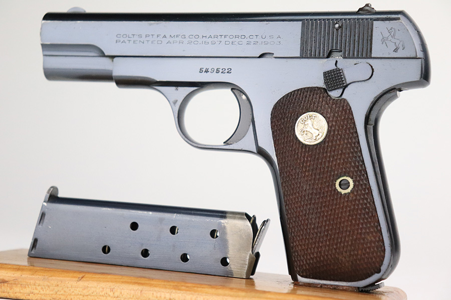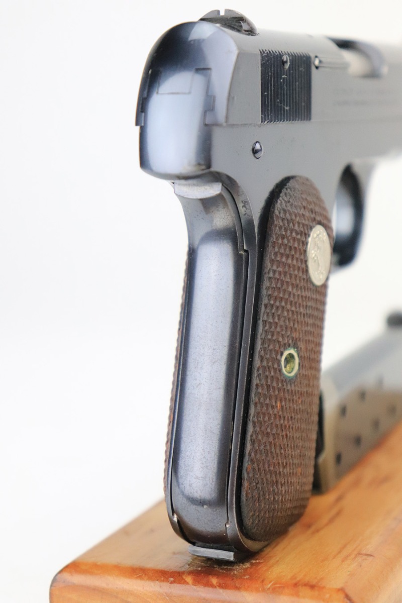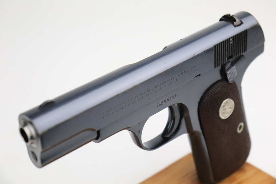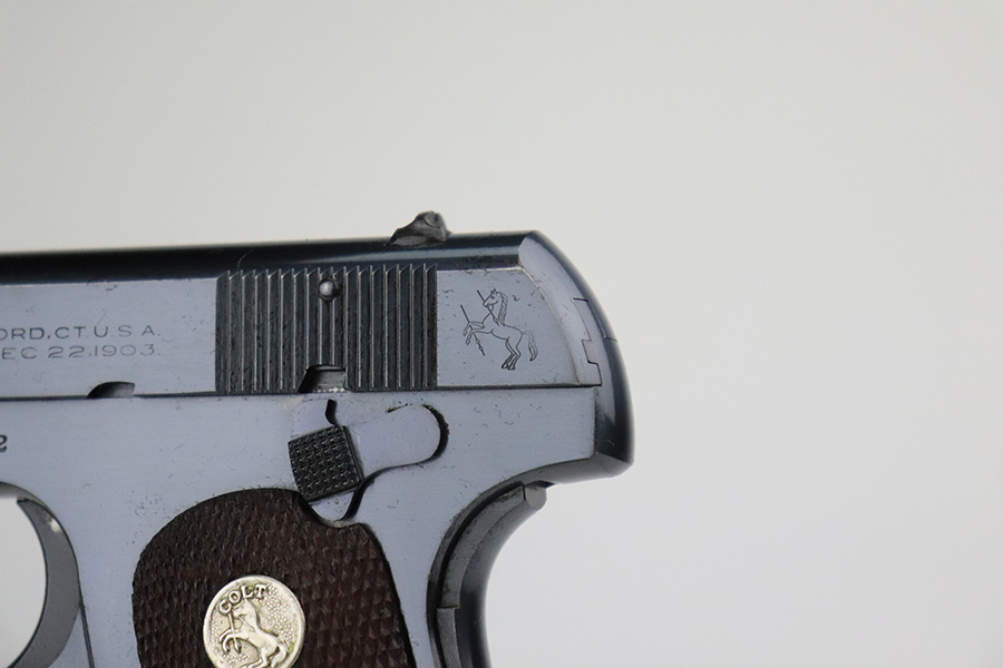 6/17/22 – This is a near-mint example of a Colt Model 1903 Pocket Hammerless manufactured in 1941. It is all matching and has retained about 98% of its original high polish finish. Just very minor wear around the high edges of the slide and some very light freckling on the grip straps. Comes with mint Colt wood grips and one proper magazine. Minty bore.
