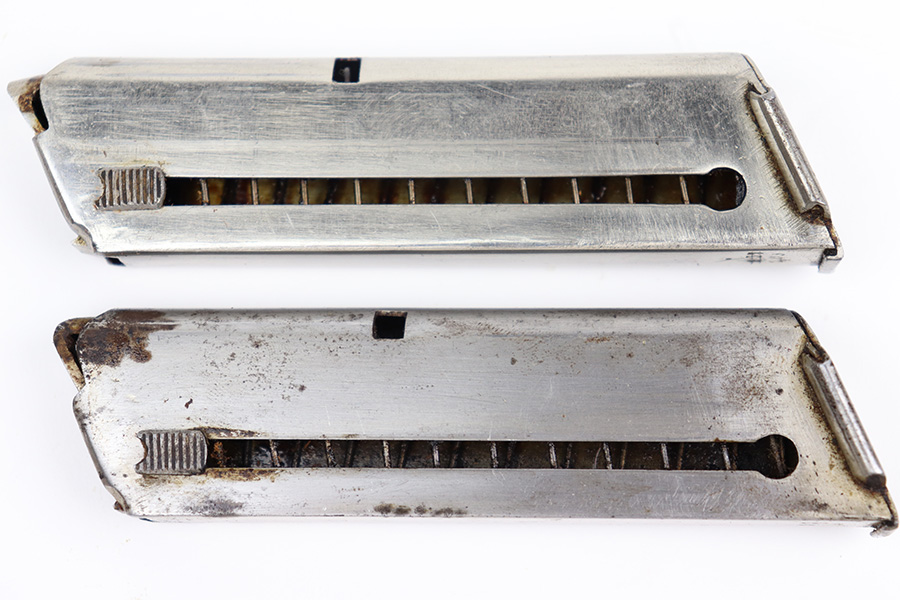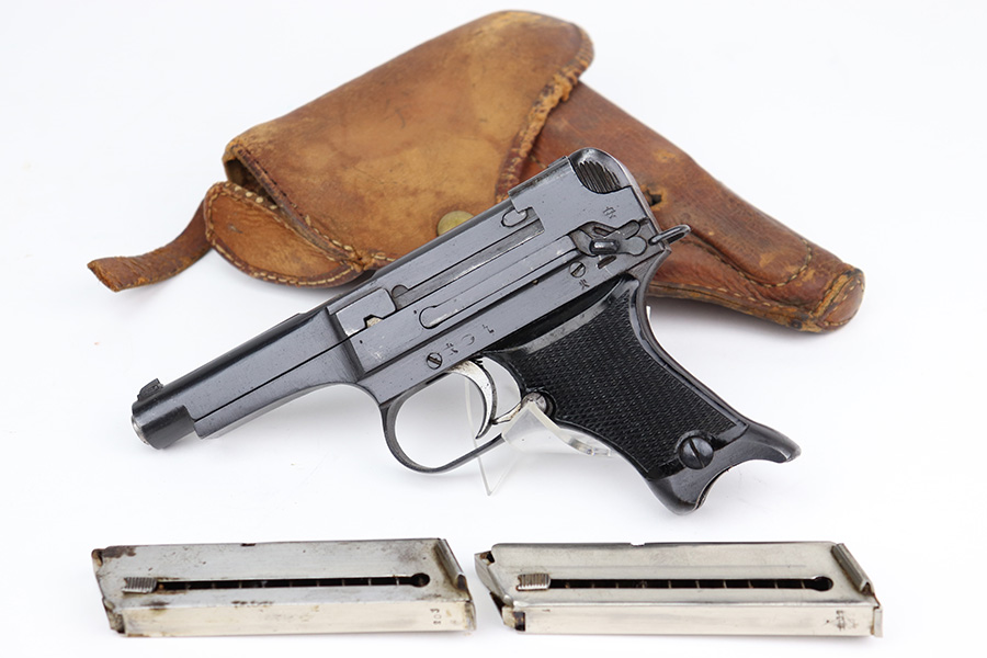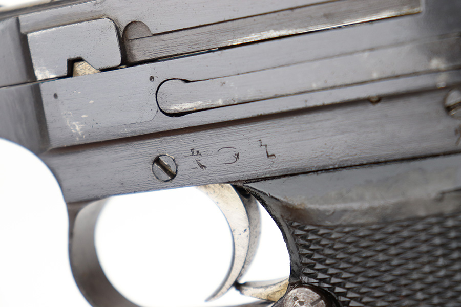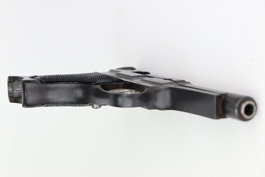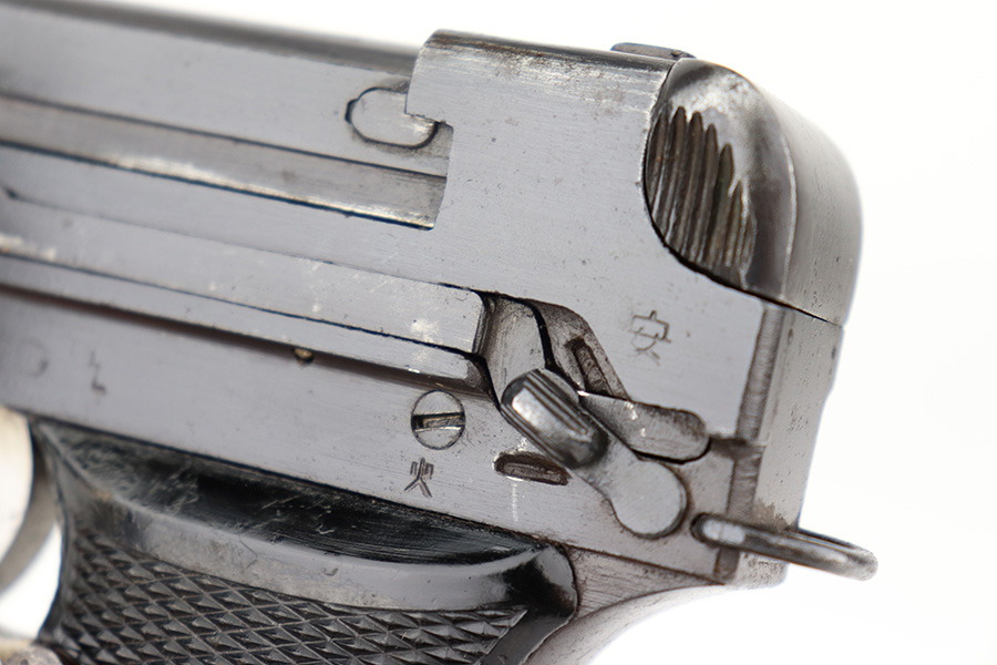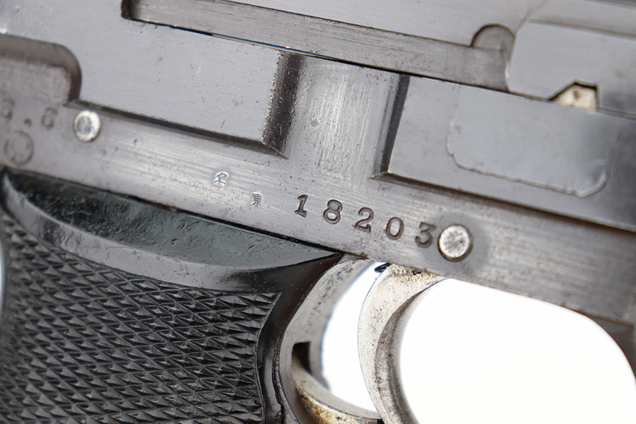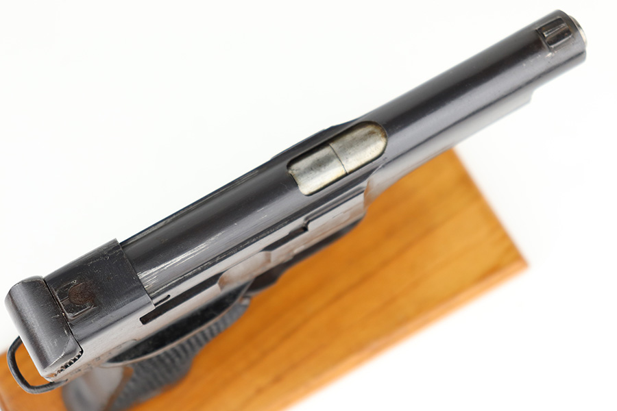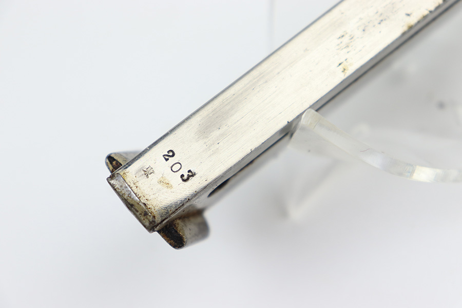 11/21/22 – This is a minty example of a Nambu Type 94 issued to the Japanese military in June of 1941. It is all matching and comes as a rig with a period-correct holster and two matching-numbered magazines. One of the magazines is original to the gun, and the other was period re-numbered at a Japanese arsenal to match the gun. The holster has the remnants of its original shoulder strap, but most of it is missing. The side flap of the holster is missing most of its stitching. The gun itself has retained almost all of its original finish. There are just hints of wear around the muzzle and on some of the high edges. Some minor dulling and pin-pricking on both grip straps. Comes with very nice period-correct black bakelite grips. The bore is shiny with strong rifling, but there are a couple of small areas of minor pin-pricking.