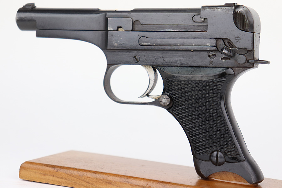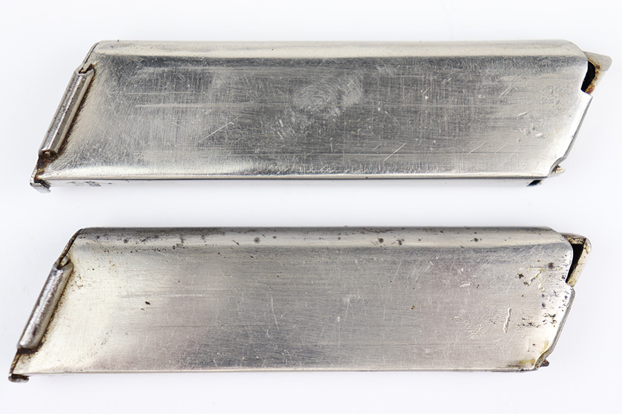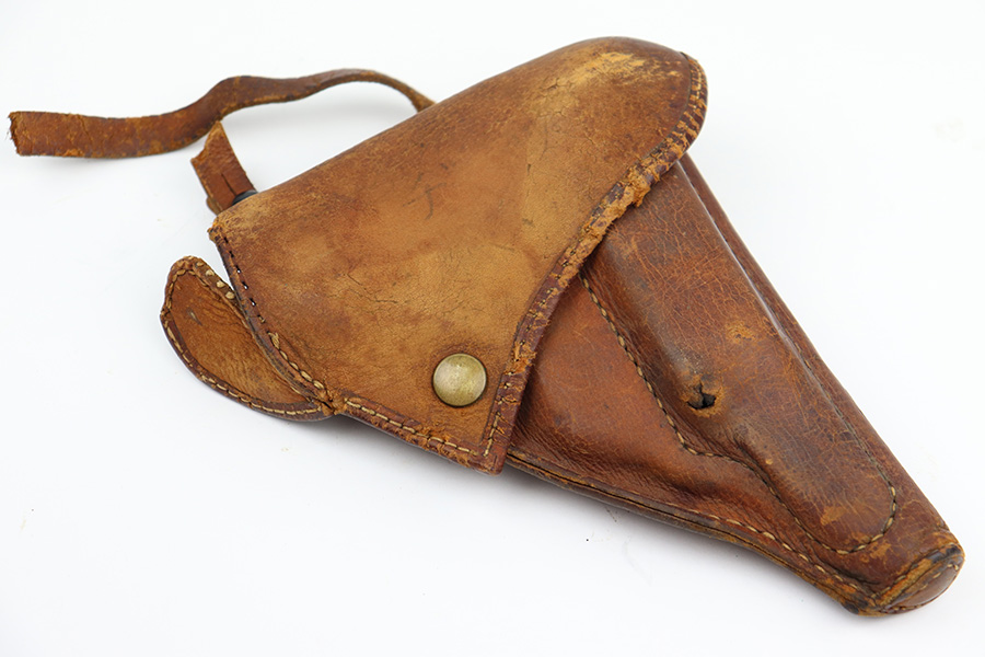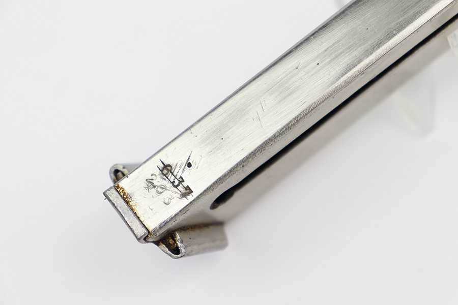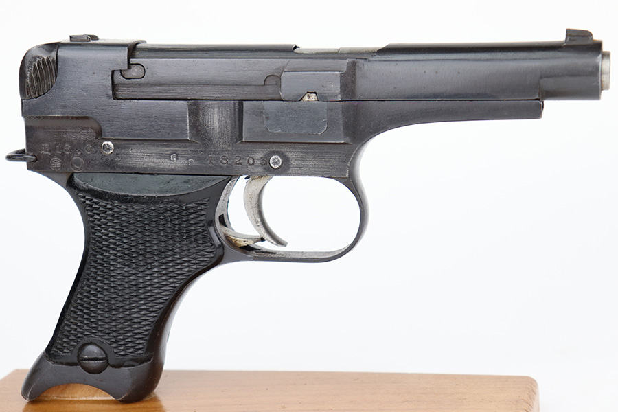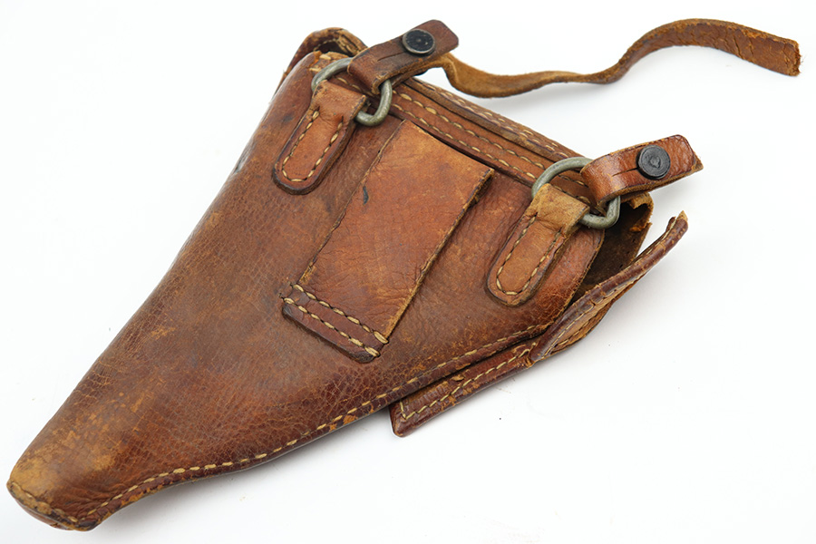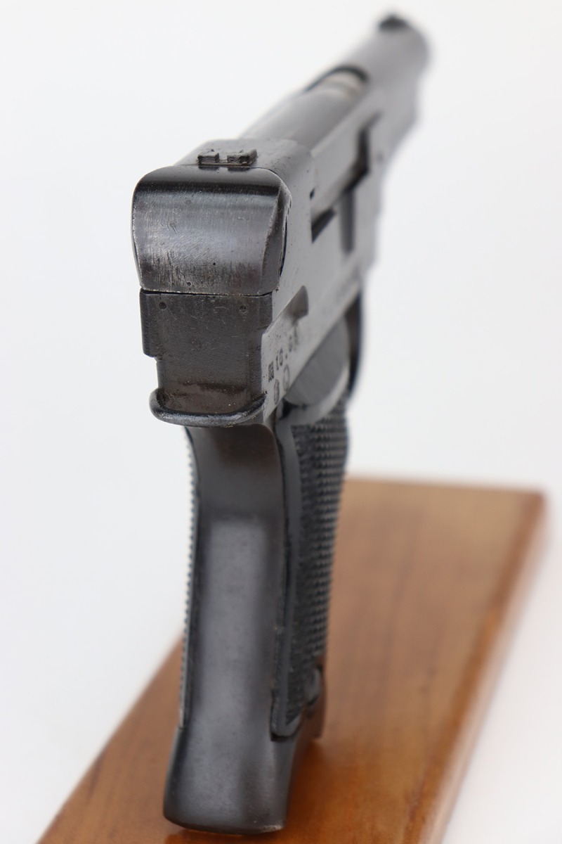 11/21/22 – This is a minty example of a Nambu Type 94 issued to the Japanese military in June of 1941. It is all matching and comes as a rig with a period-correct holster and two matching-numbered magazines. One of the magazines is original to the gun, and the other was period re-numbered at a Japanese arsenal to match the gun. The holster has the remnants of its original shoulder strap, but most of it is missing. The side flap of the holster is missing most of its stitching. The gun itself has retained almost all of its original finish. There are just hints of wear around the muzzle and on some of the high edges. Some minor dulling and pin-pricking on both grip straps. Comes with very nice period-correct black bakelite grips. The bore is shiny with strong rifling, but there are a couple of small areas of minor pin-pricking.