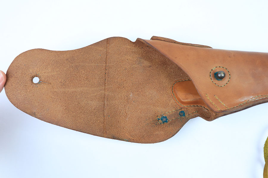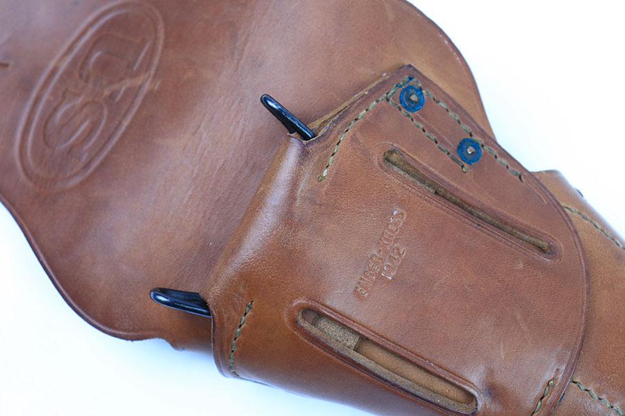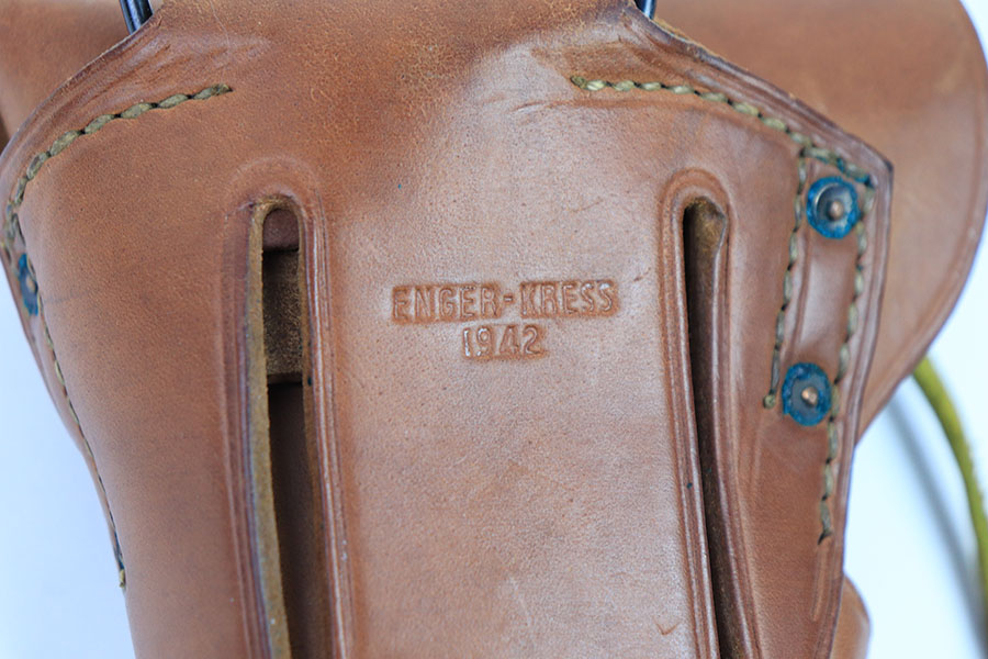 7/19/21 – This is a minty condition 1911A1 holster made in 1942. The holster has beautiful brown leather that’s clean with normal pliability. The stitching is all in tact and original without issue. The back leather is maker stamped and dated, as shown.