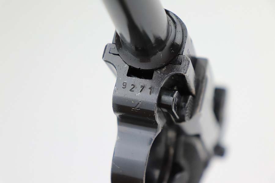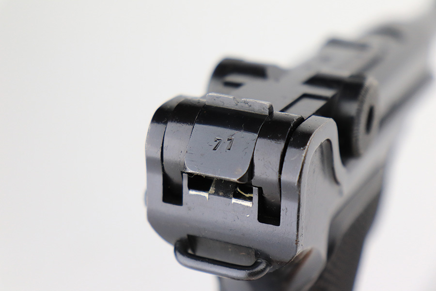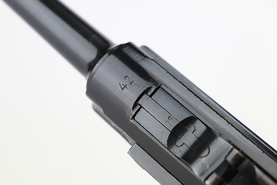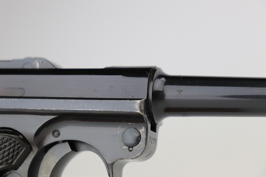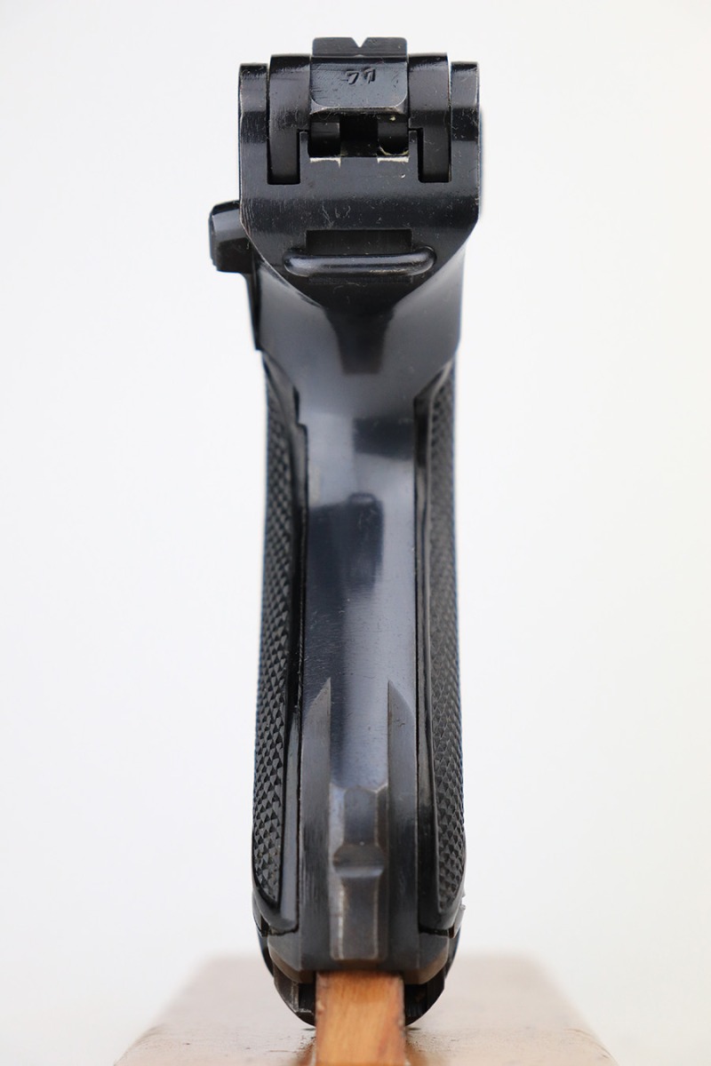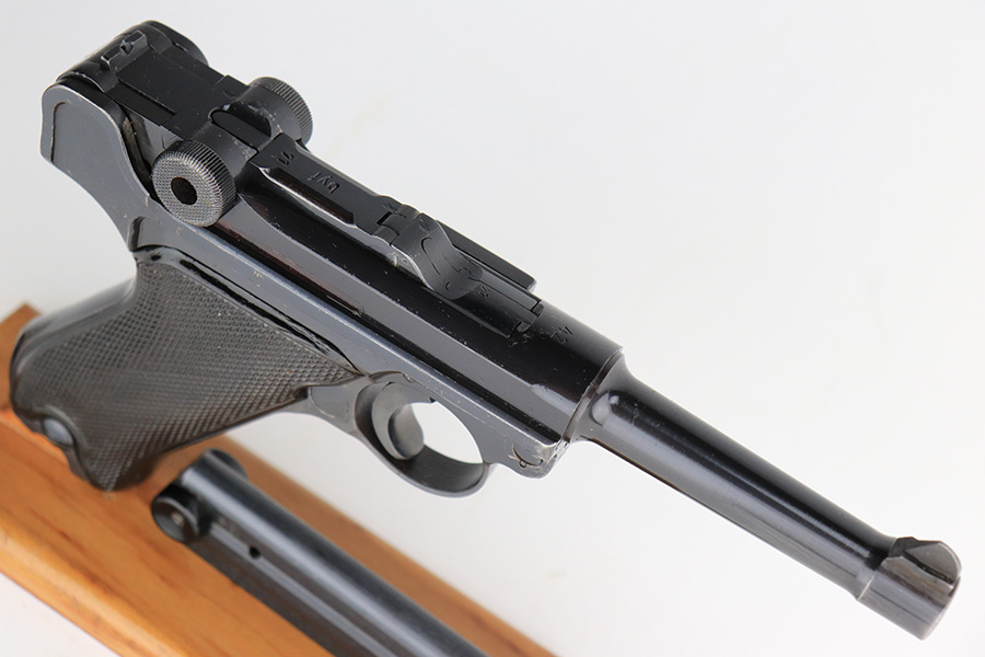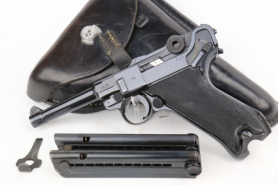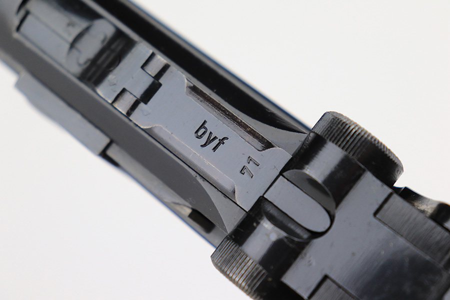 7/20/23 – This is a minty example of a BYF 42 “Black Widow” Mauser Luger issued to the Nazi military in 1942. It is all matching and has the proper “Eagle 135” military acceptance proofs. There are also a few faint, additional proofs on the toggle assembly and right side of receiver but we can’t make them out. It is fitted with a set of original black bakelite “Black Widow” grips – excellent condition. It comes as a complete rig with an excellent 1942-dated holster, an “Eagle 655” Luger tool, and two original Black Widow magazines. There is a tiny chip in one of the magazine bottoms. The holster has been embellished with a deaths head pin, and there is a faint number stamped into the back of the holster that matches the gun. The gun itself has retained about 98% of its finish with just hints of wear around the muzzle and on the high edges. There are some tiny handling marks here and there. The bore is shiny for the most part with strong rifling, but there is light freckling in the grooves.