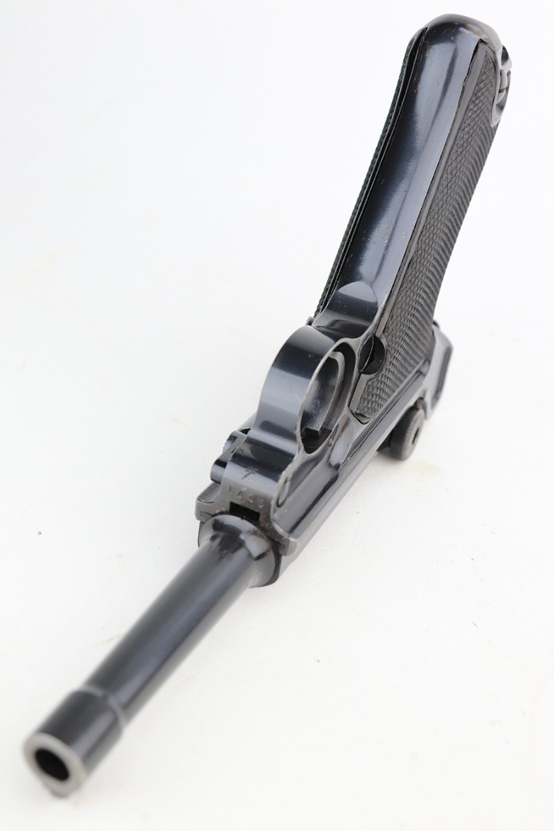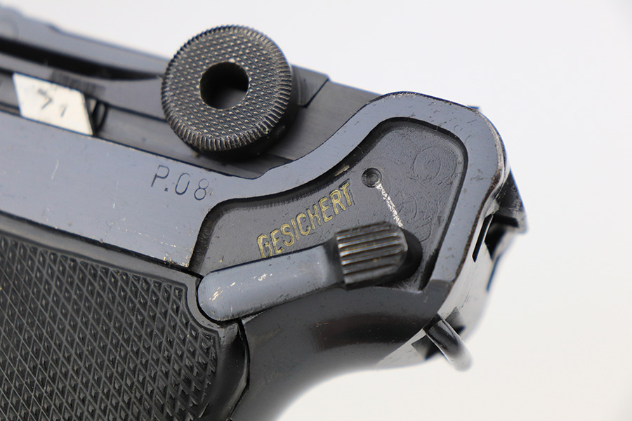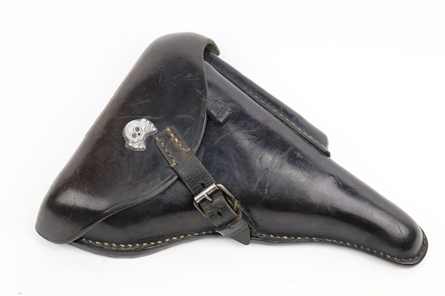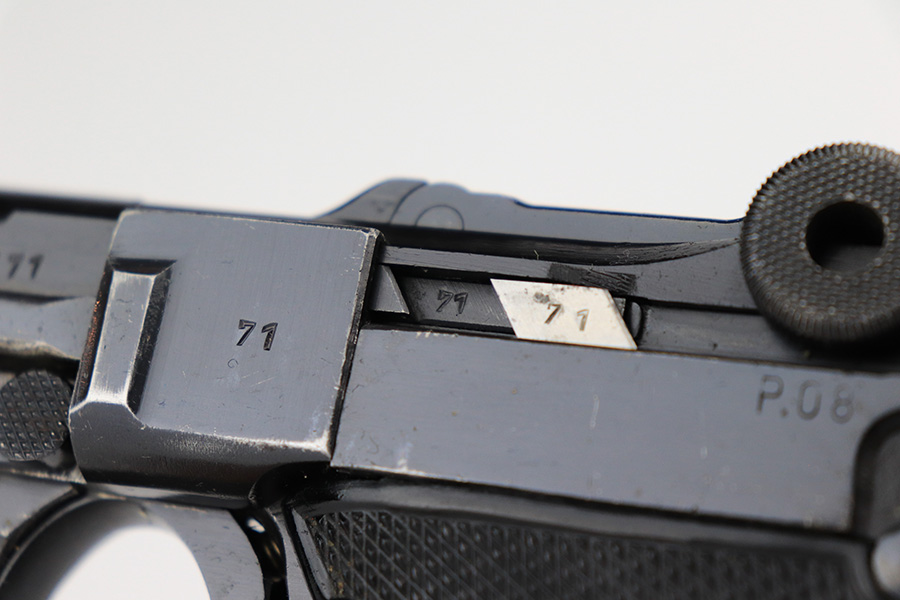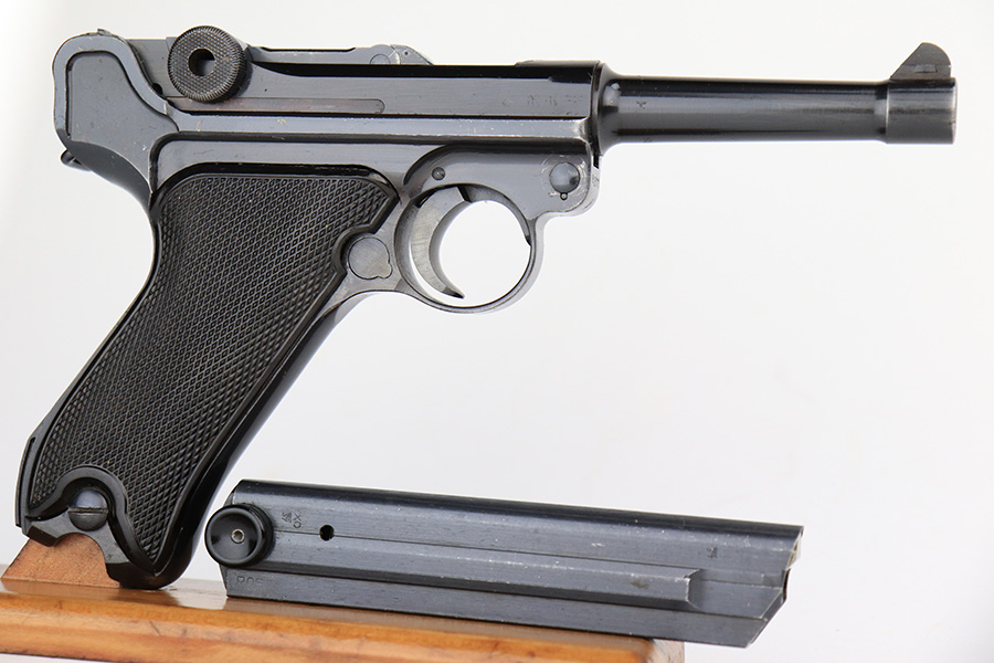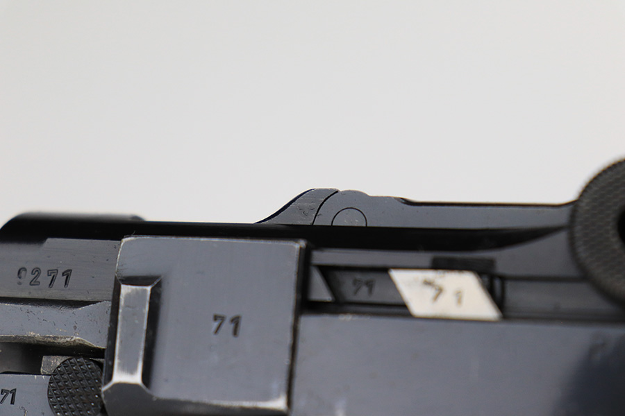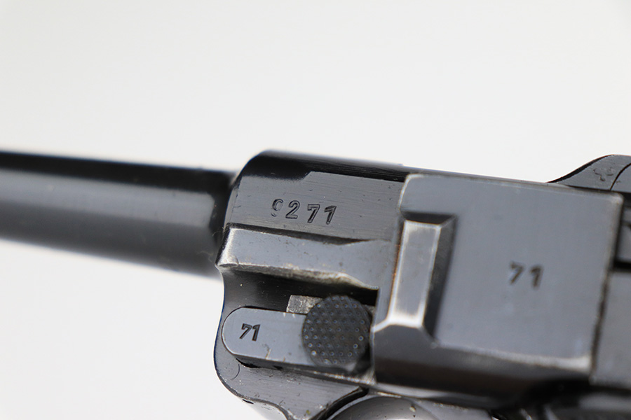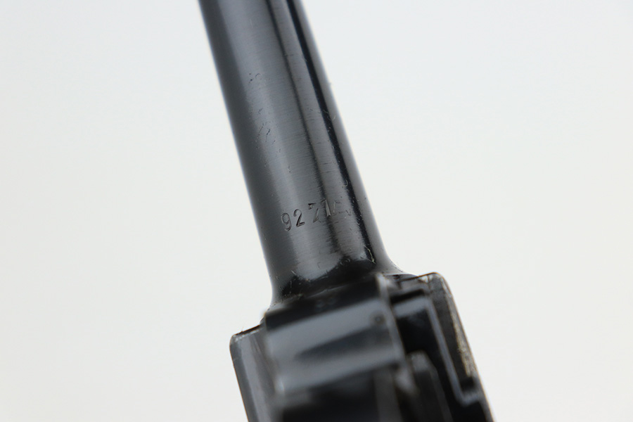 7/20/23 – This is a minty example of a BYF 42 “Black Widow” Mauser Luger issued to the Nazi military in 1942. It is all matching and has the proper “Eagle 135” military acceptance proofs. There are also a few faint, additional proofs on the toggle assembly and right side of receiver but we can’t make them out. It is fitted with a set of original black bakelite “Black Widow” grips – excellent condition. It comes as a complete rig with an excellent 1942-dated holster, an “Eagle 655” Luger tool, and two original Black Widow magazines. There is a tiny chip in one of the magazine bottoms. The holster has been embellished with a deaths head pin, and there is a faint number stamped into the back of the holster that matches the gun. The gun itself has retained about 98% of its finish with just hints of wear around the muzzle and on the high edges. There are some tiny handling marks here and there. The bore is shiny for the most part with strong rifling, but there is light freckling in the grooves.