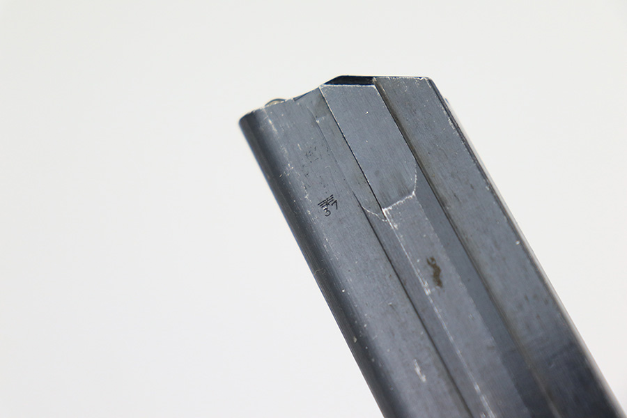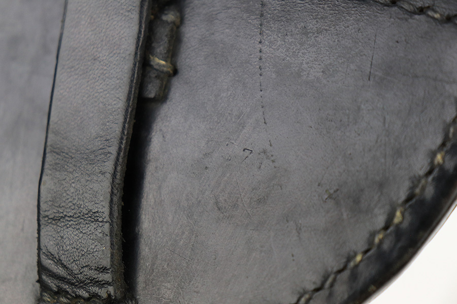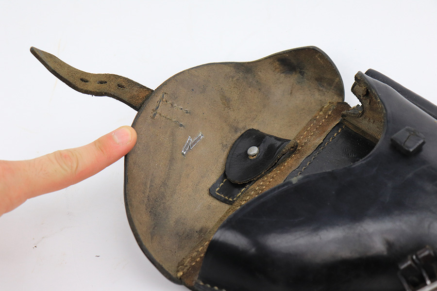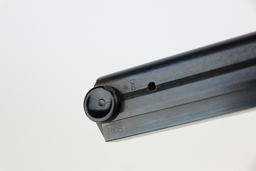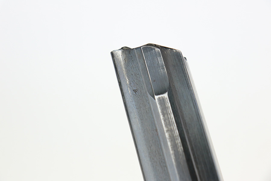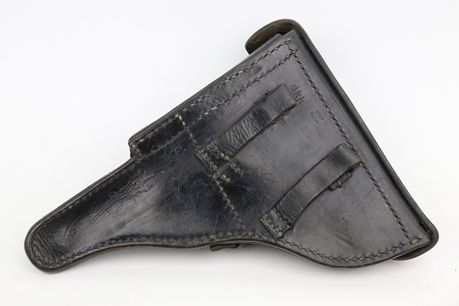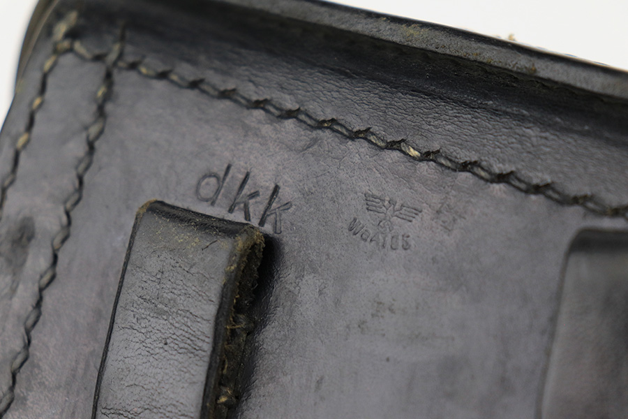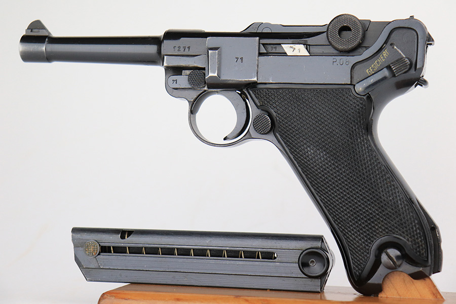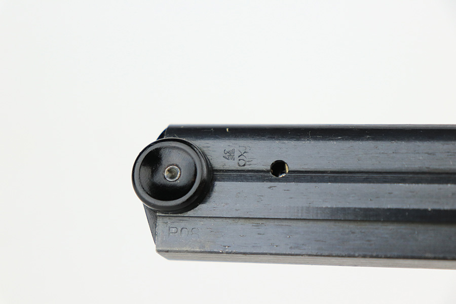 7/20/23 – This is a minty example of a BYF 42 “Black Widow” Mauser Luger issued to the Nazi military in 1942. It is all matching and has the proper “Eagle 135” military acceptance proofs. There are also a few faint, additional proofs on the toggle assembly and right side of receiver but we can’t make them out. It is fitted with a set of original black bakelite “Black Widow” grips – excellent condition. It comes as a complete rig with an excellent 1942-dated holster, an “Eagle 655” Luger tool, and two original Black Widow magazines. There is a tiny chip in one of the magazine bottoms. The holster has been embellished with a deaths head pin, and there is a faint number stamped into the back of the holster that matches the gun. The gun itself has retained about 98% of its finish with just hints of wear around the muzzle and on the high edges. There are some tiny handling marks here and there. The bore is shiny for the most part with strong rifling, but there is light freckling in the grooves.