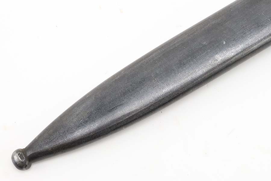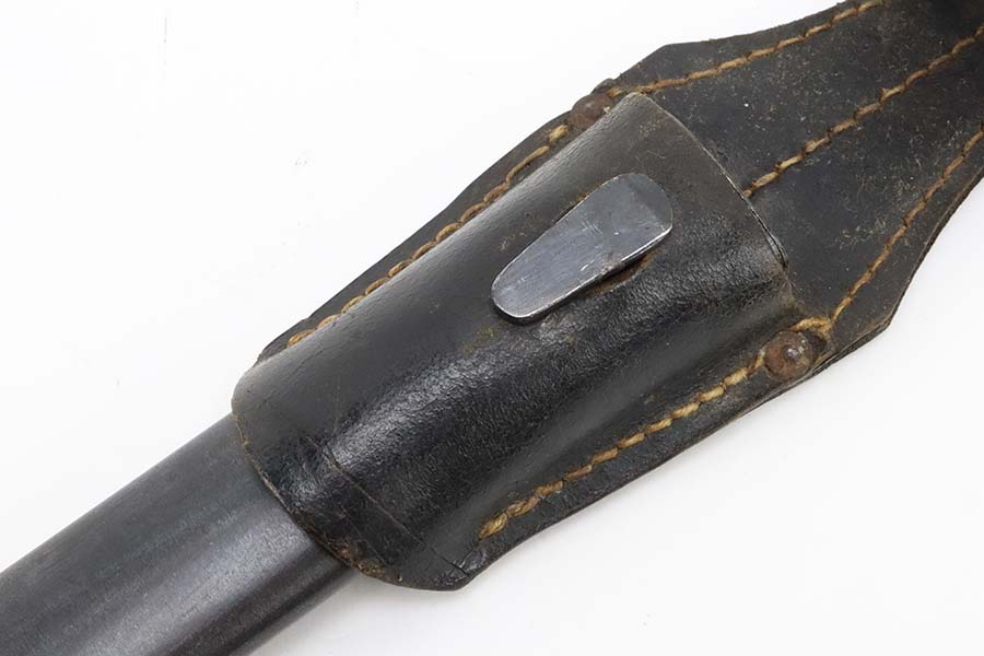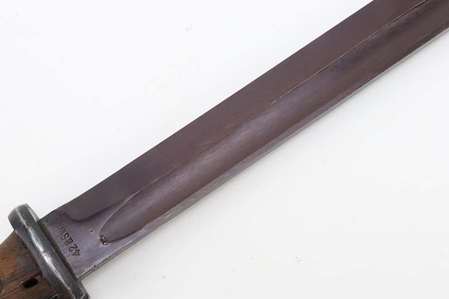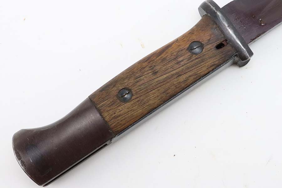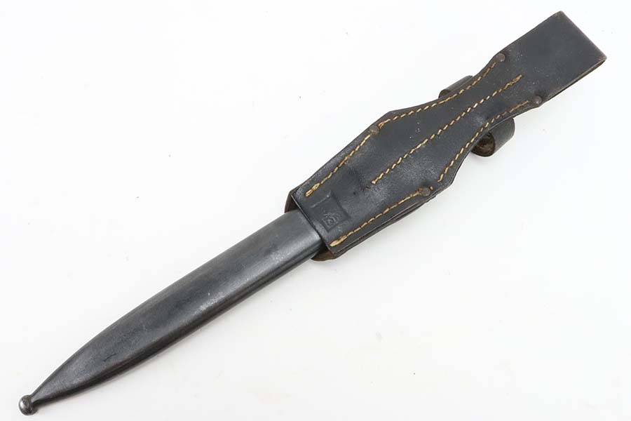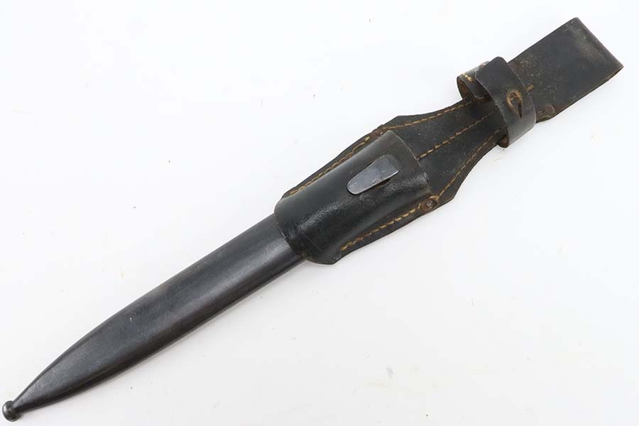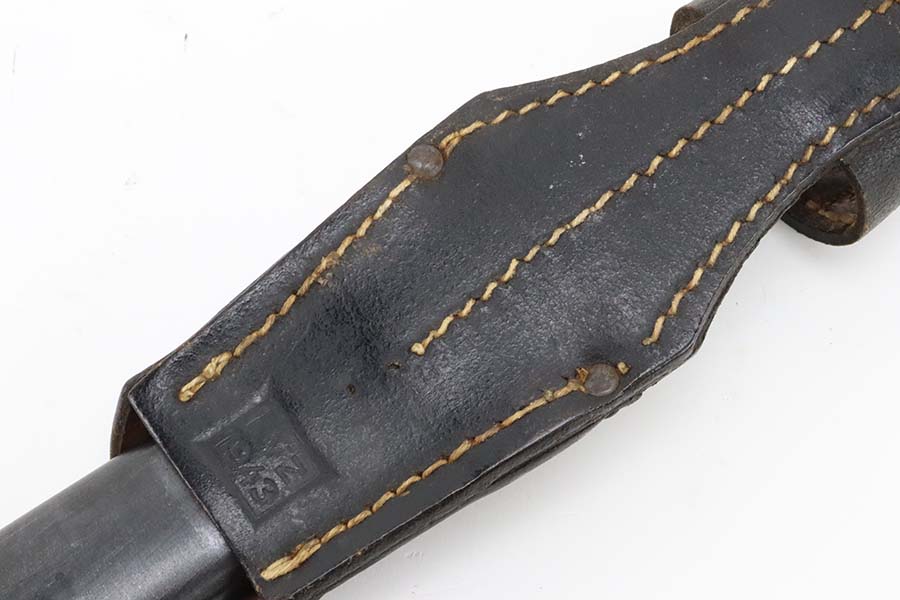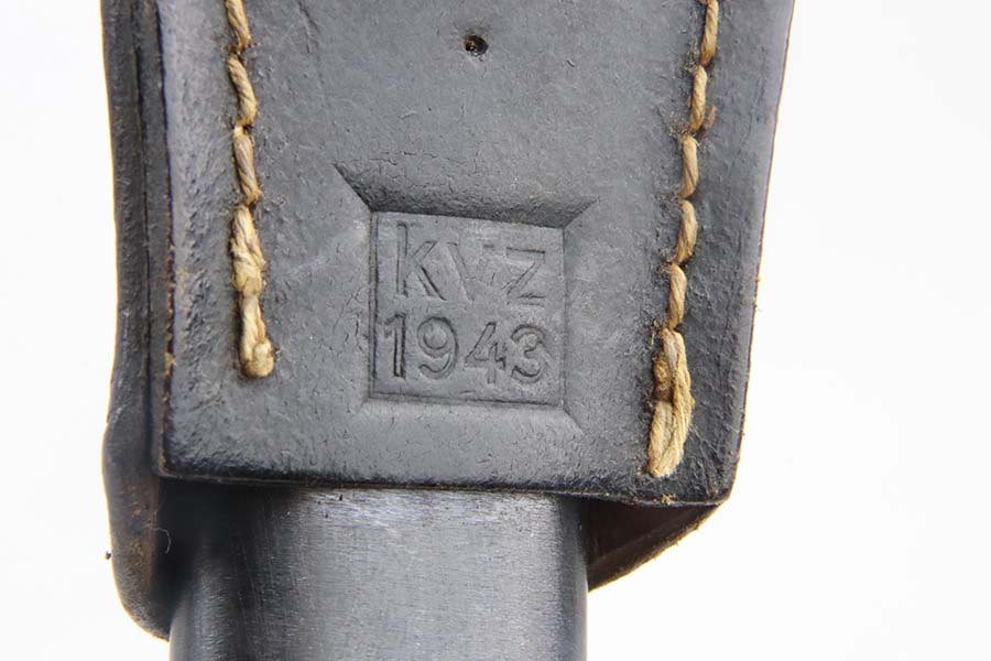 3/12/24 – This is a minty example of a WW2 German K98 Bayonet made by E&F Horster in 1942. Scabbard is matching-numbered to the blade. Excellent wood grips. Also comes with an excellent black leather frog (1943 dated) – very nice leather throughout. The blade has retained essentially all of its bluing and has a beautiful plum color.
