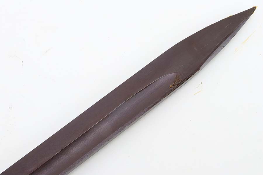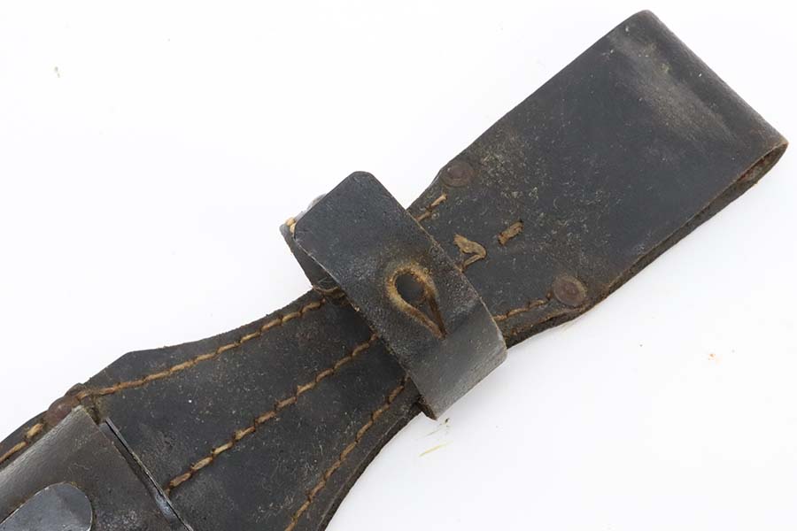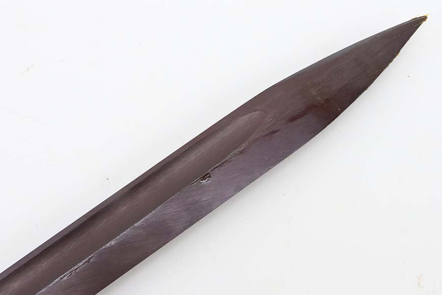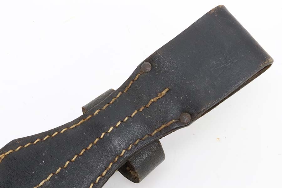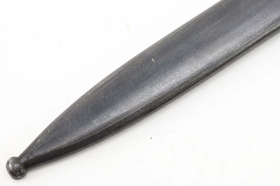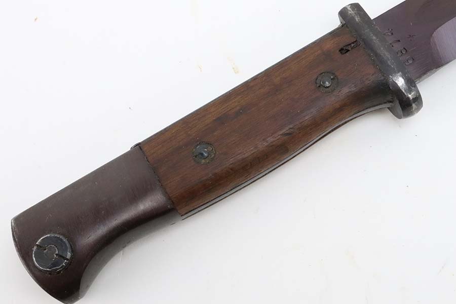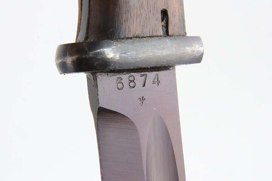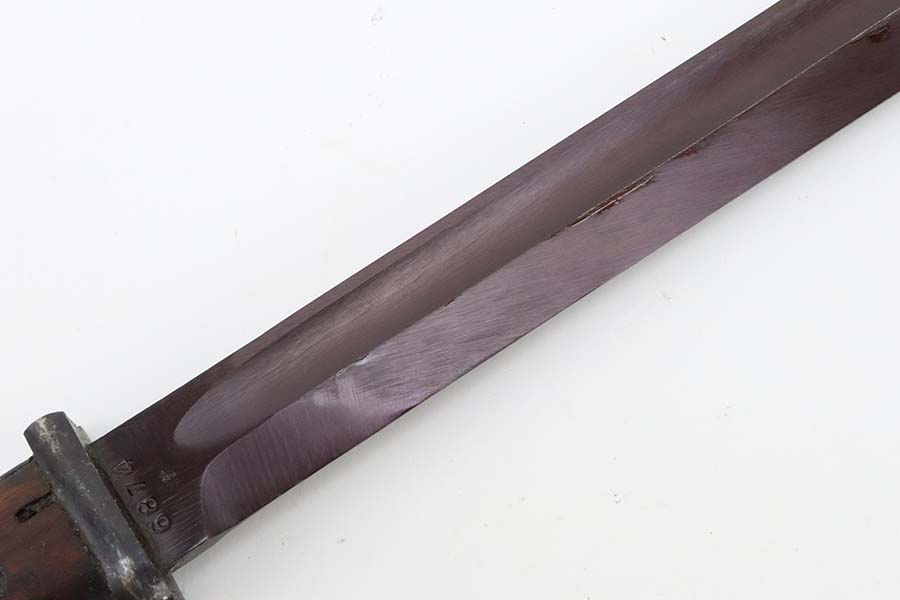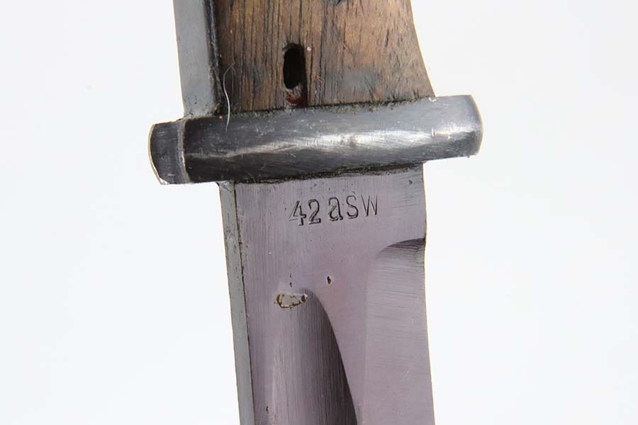3/12/24 – This is a minty example of a WW2 German K98 Bayonet made by E&F Horster in 1942. Scabbard is matching-numbered to the blade. Excellent wood grips. Also comes with an excellent black leather frog (1943 dated) – very nice leather throughout. The blade has retained essentially all of its bluing and has a beautiful plum color.