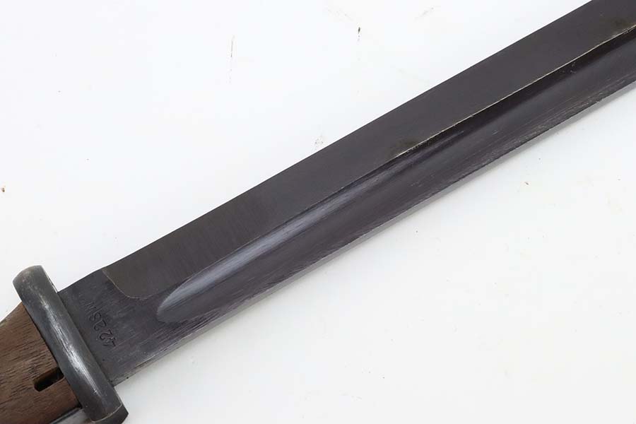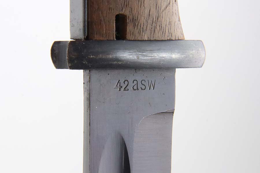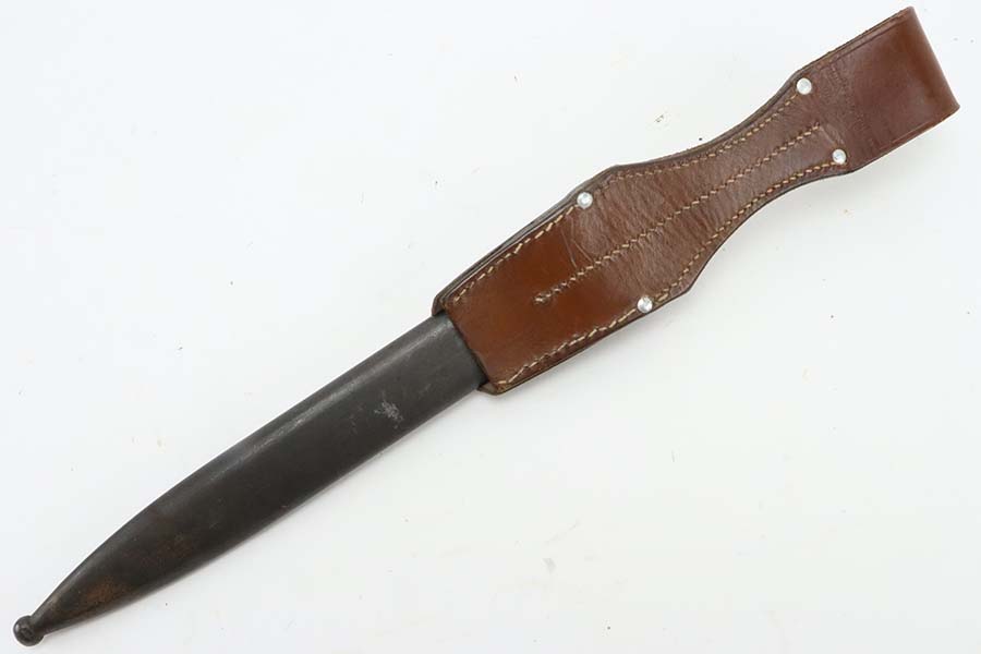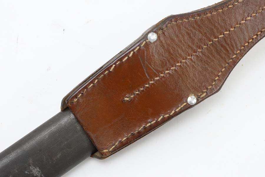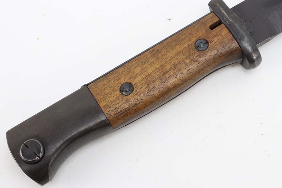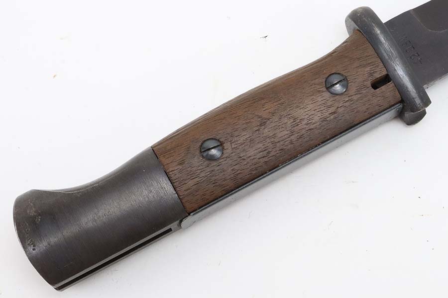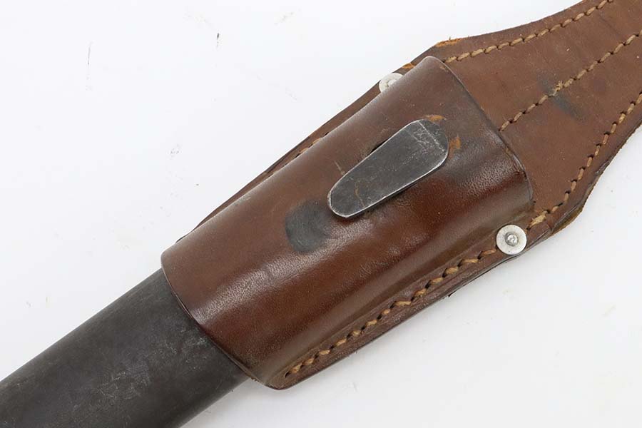 3/14/24 – This is a minty example of a WW2 German K98 Bayonet made by E&F Horster in 1942. Scabbard is matching-numbered to the blade. Excellent wood grips. Also comes with an excellent tan leather frog- excellent leather throughout. The blade has retained nearly all of its bluing and has a slight plum tint to it.