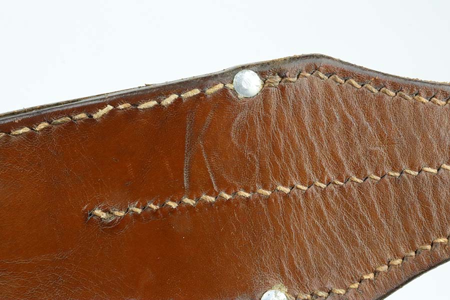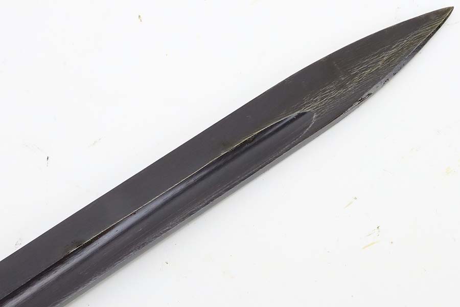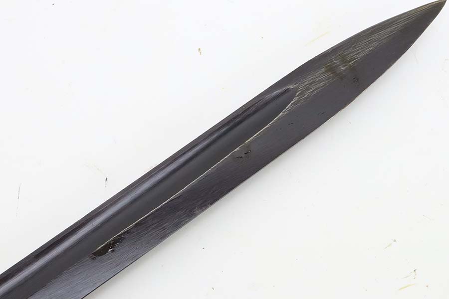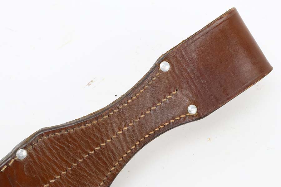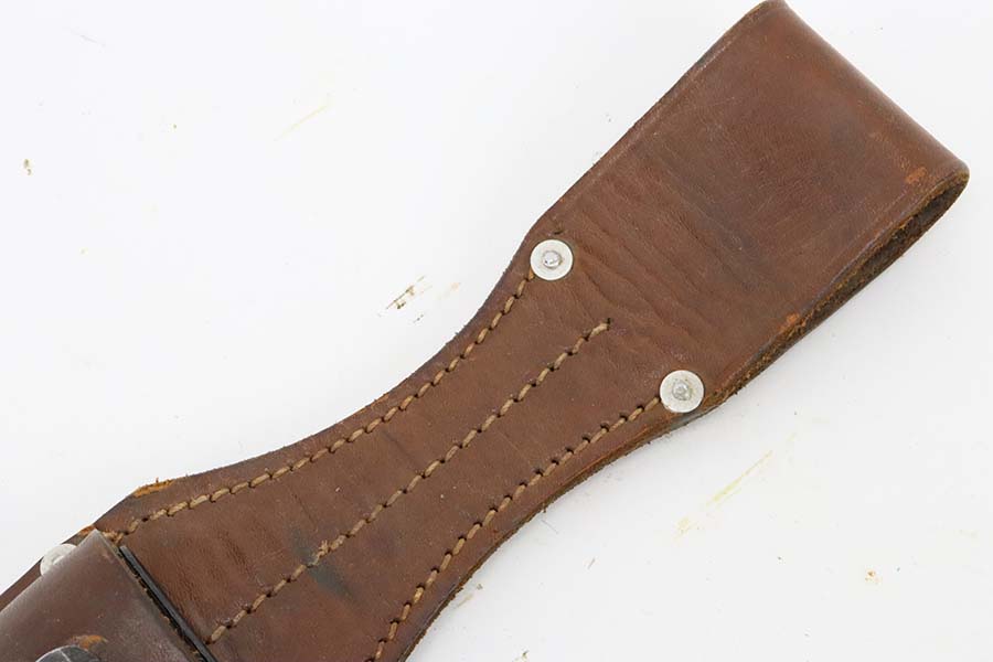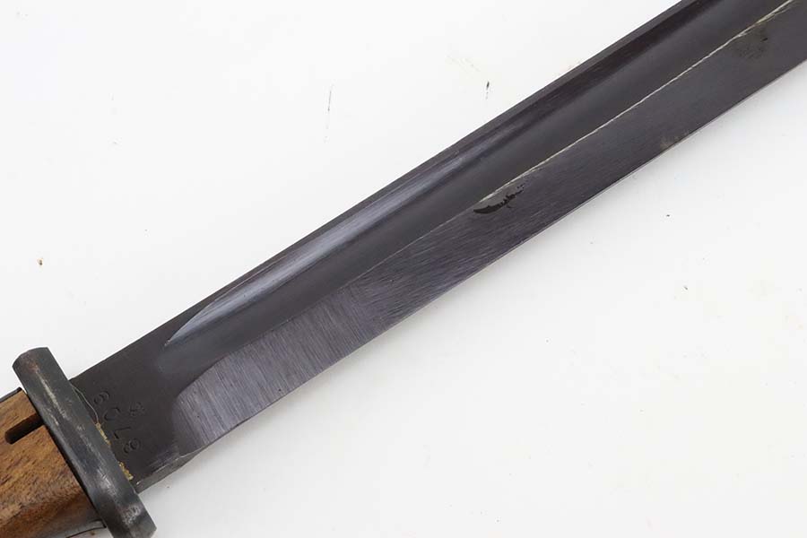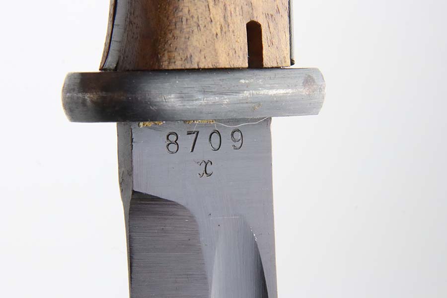 3/14/24 – This is a minty example of a WW2 German K98 Bayonet made by E&F Horster in 1942. Scabbard is matching-numbered to the blade. Excellent wood grips. Also comes with an excellent tan leather frog- excellent leather throughout. The blade has retained nearly all of its bluing and has a slight plum tint to it.