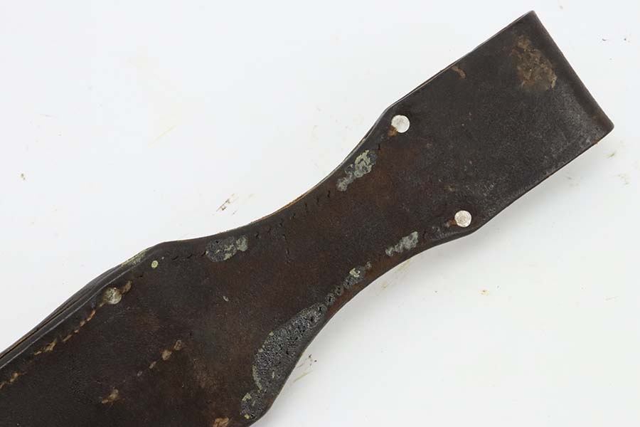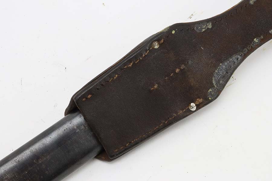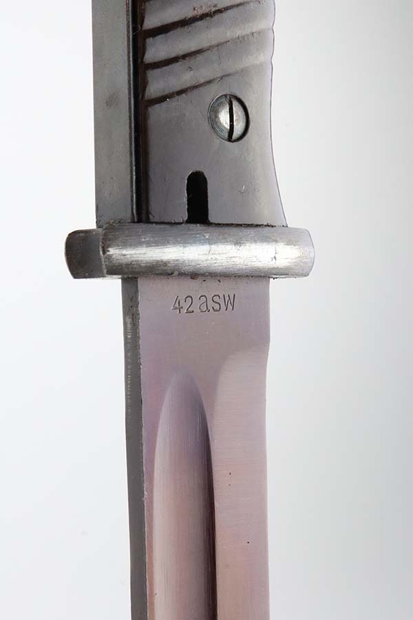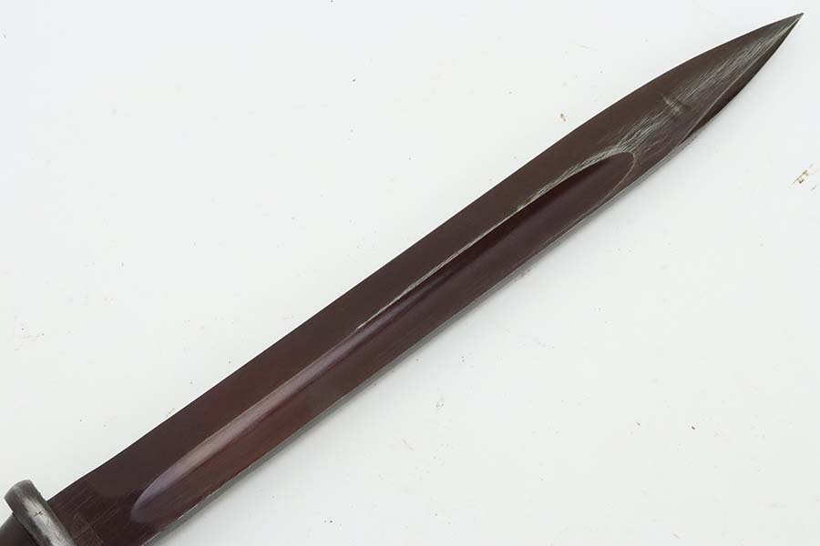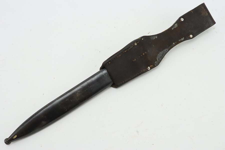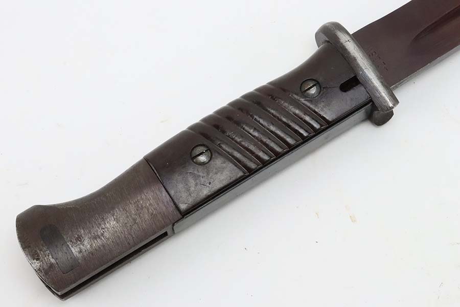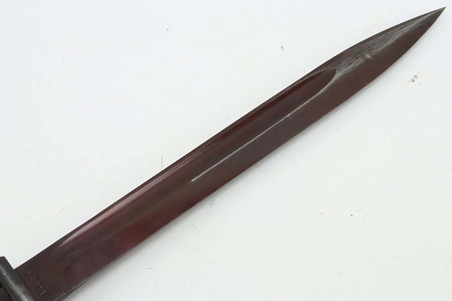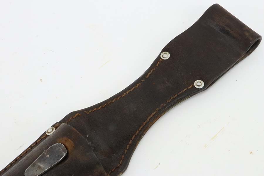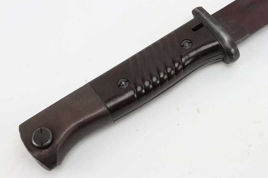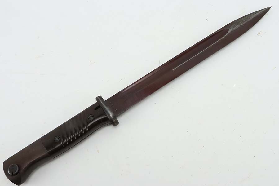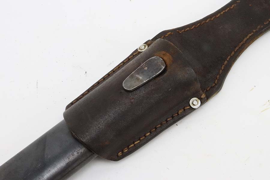 3/14/24 – This is a minty example of a WW2 German K98 Bayonet made by E&F Horster in 1942. Scabbard is matching-numbered to the blade. Excellent reddish bakelite grips. Also comes with a nice brown leather frog. The blade has retained nearly all of its bluing and has a beautiful plum color.