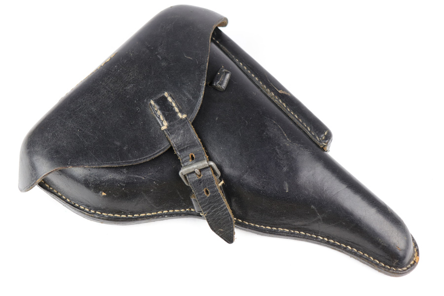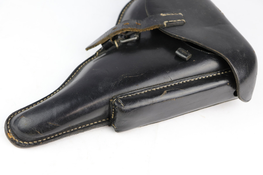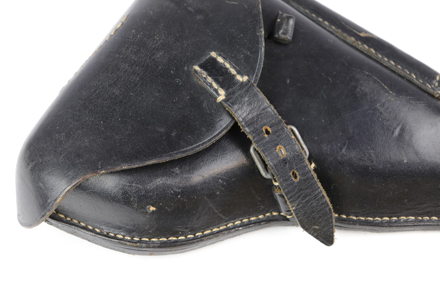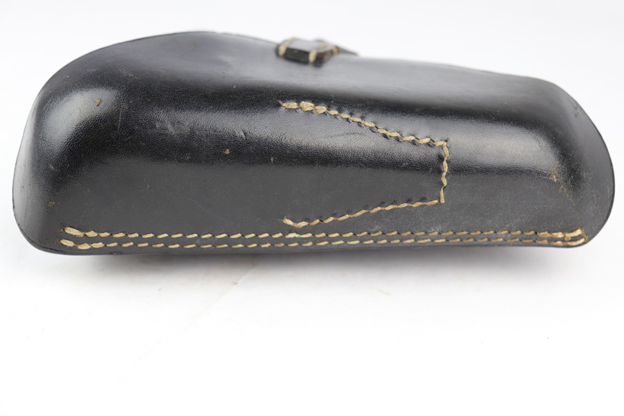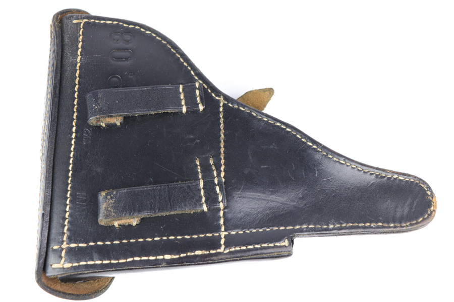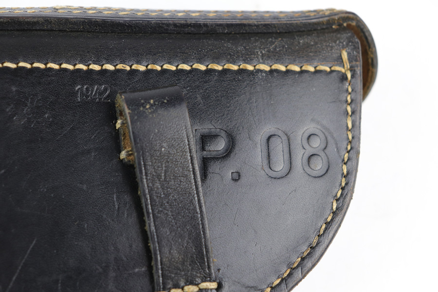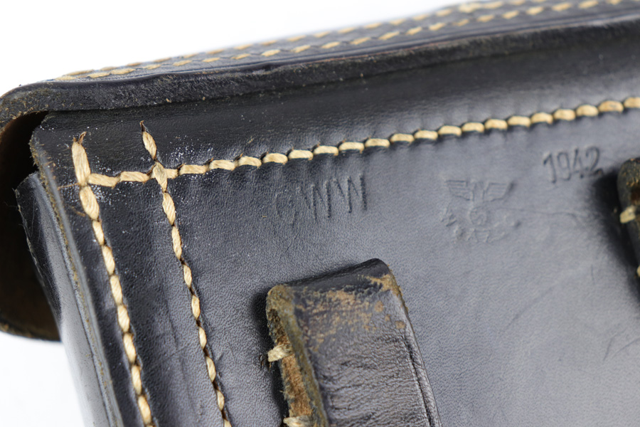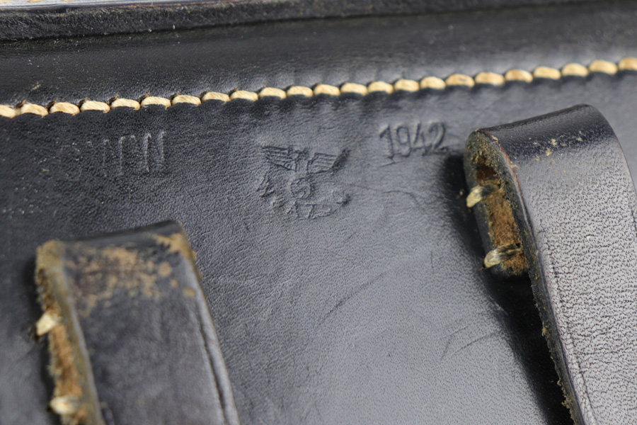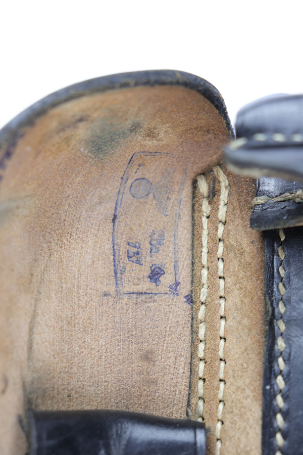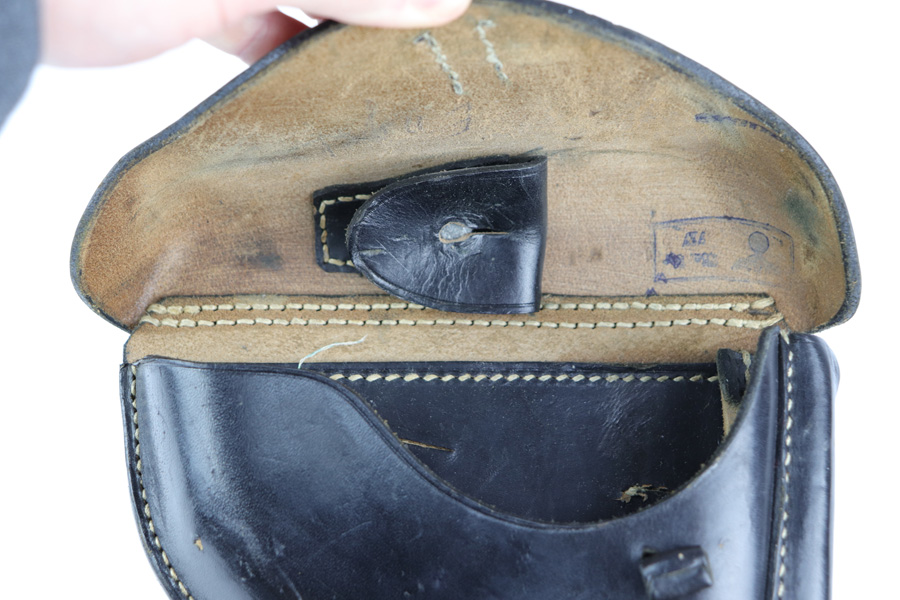 12/21/18 – This is an original 1942 dated black leather Luger holster from WW2. The holster is in minty overall condition with beautiful, clean leather and all original stitching in tact. The back of the holster is maker stamped “CWW” and 1942 dated with a waffen eagle proof stamp. Interestingly, the interior leather has an eagle ink stamp that’s faded and hard to read. Appears original though – we just aren’t sure the significance. Guaranteed all original and authentic.