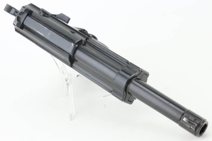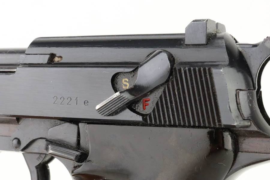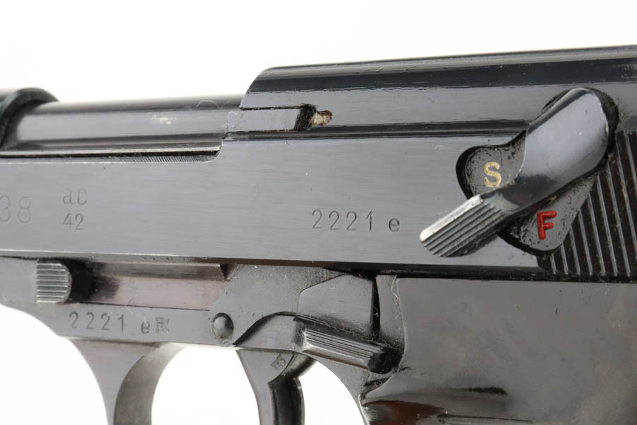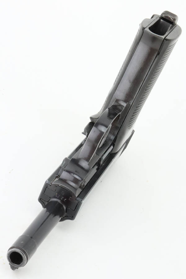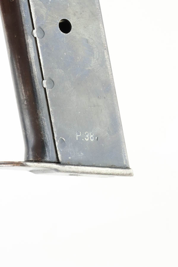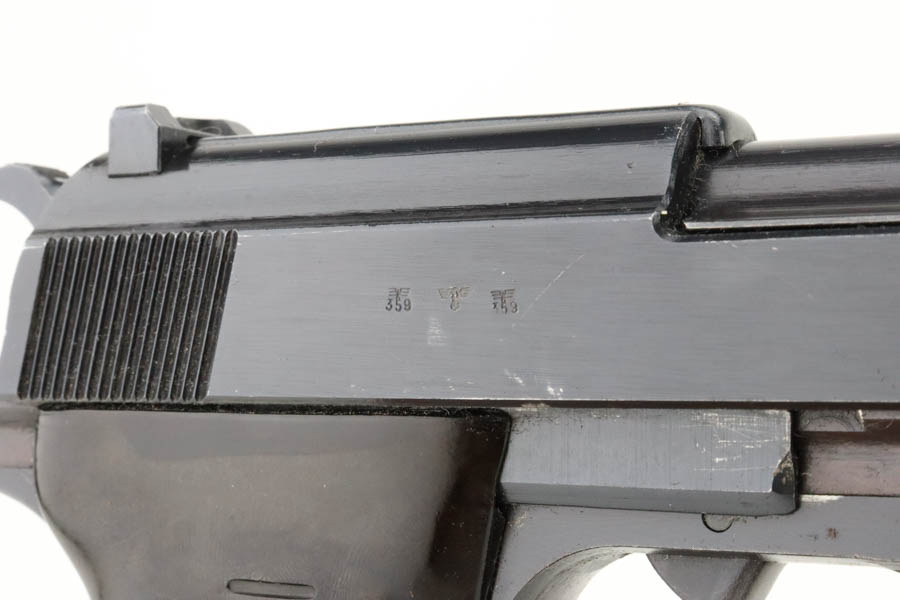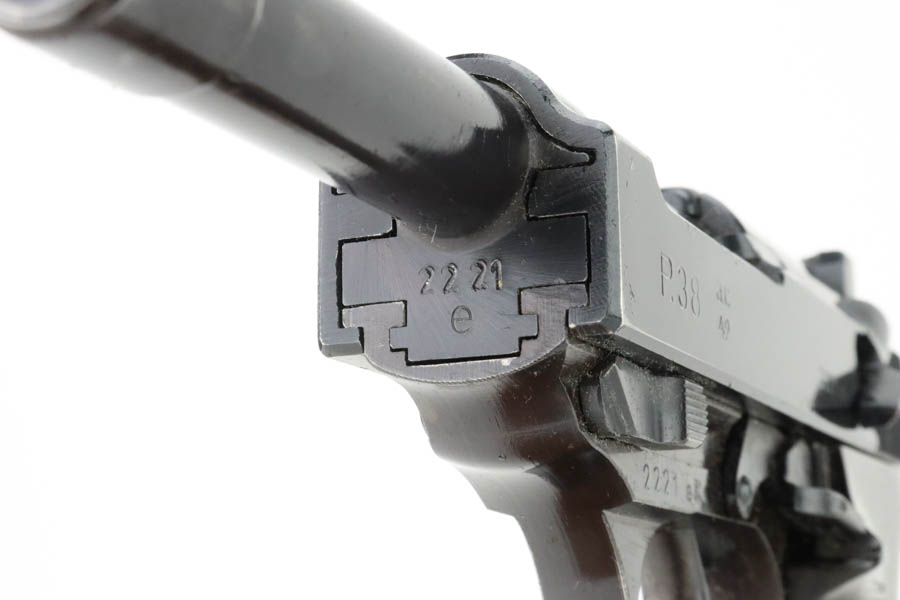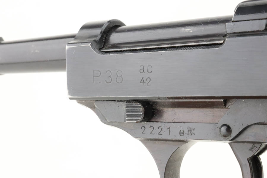 6/17/24 – This is a near-mint example of an AC 42 Walther P.38 issued to the Nazi military in 1942. All matching with the proper “Eagle 359” military acceptance proofs. It has retained nearly all of its original finish with just hints of high edge and muzzle wear. Fitted with excellent blackish-brown bakelite grips and comes with an un-numbered “Eagle 359” marked Walther magazine. Excellent bore with strong rifling. De-cocker is functional.
