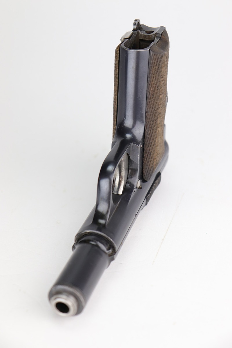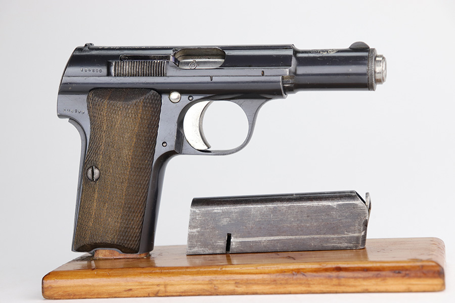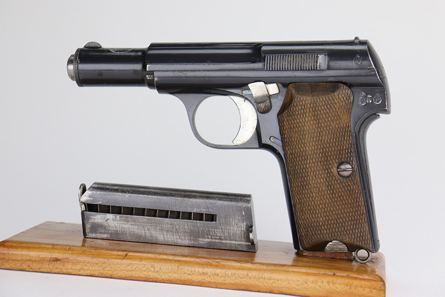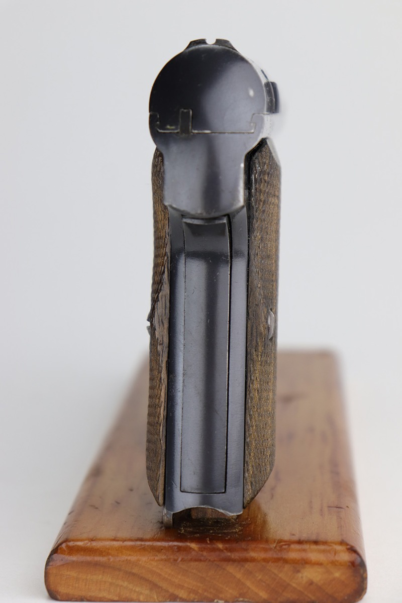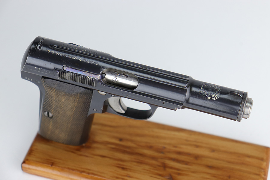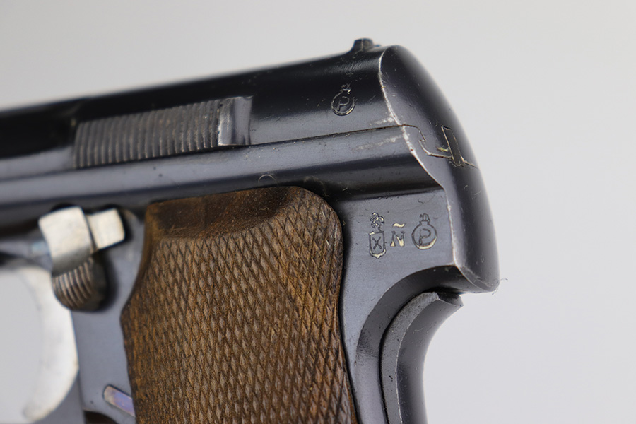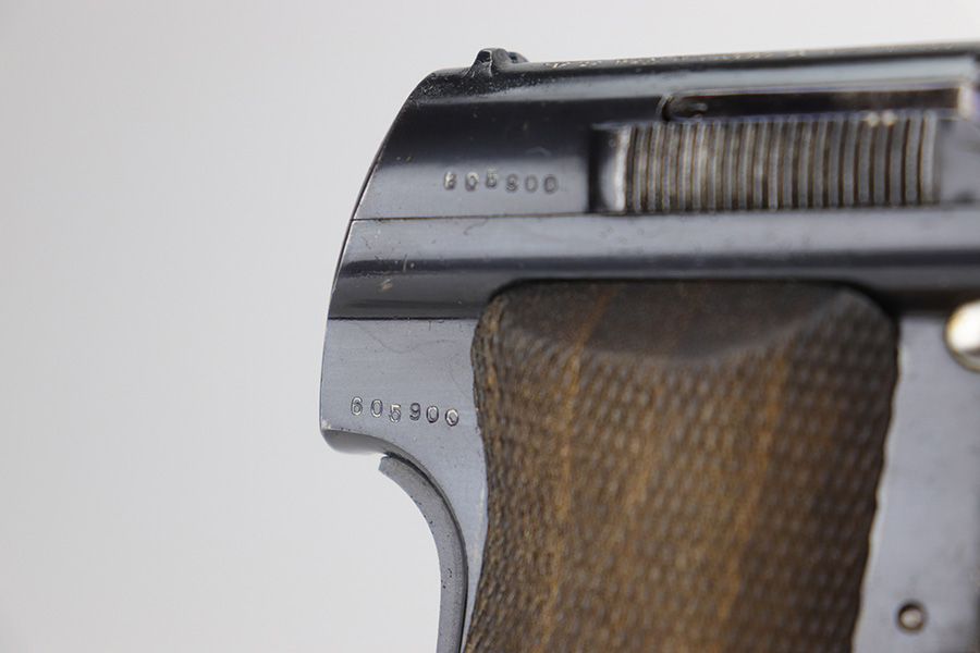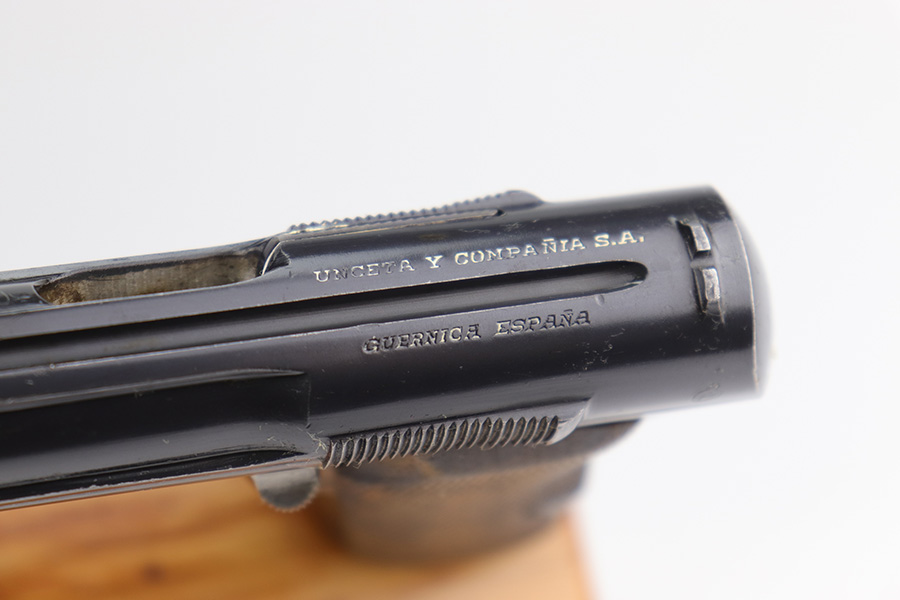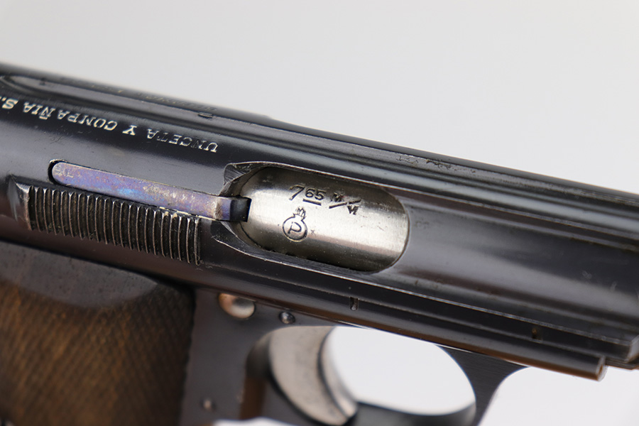 12/17/22 – This is a minty example of an Astra Model 300, chambered in 7.65mm and manufactured in 1943. The gun is all matching and has the proper Spanish proofs. No Nazi military markings. It has retained nearly all of its original finish with hints of wear on the front edges of the frame. A couple of small dots of oxidation on the left side of the barrel and a couple of light scratches on the left side of the frame. Fitted with very nice period-correct wood grips – one very light hairline cracks at the top of the left panel. Comes with one period-correct magazine. Mint bore.