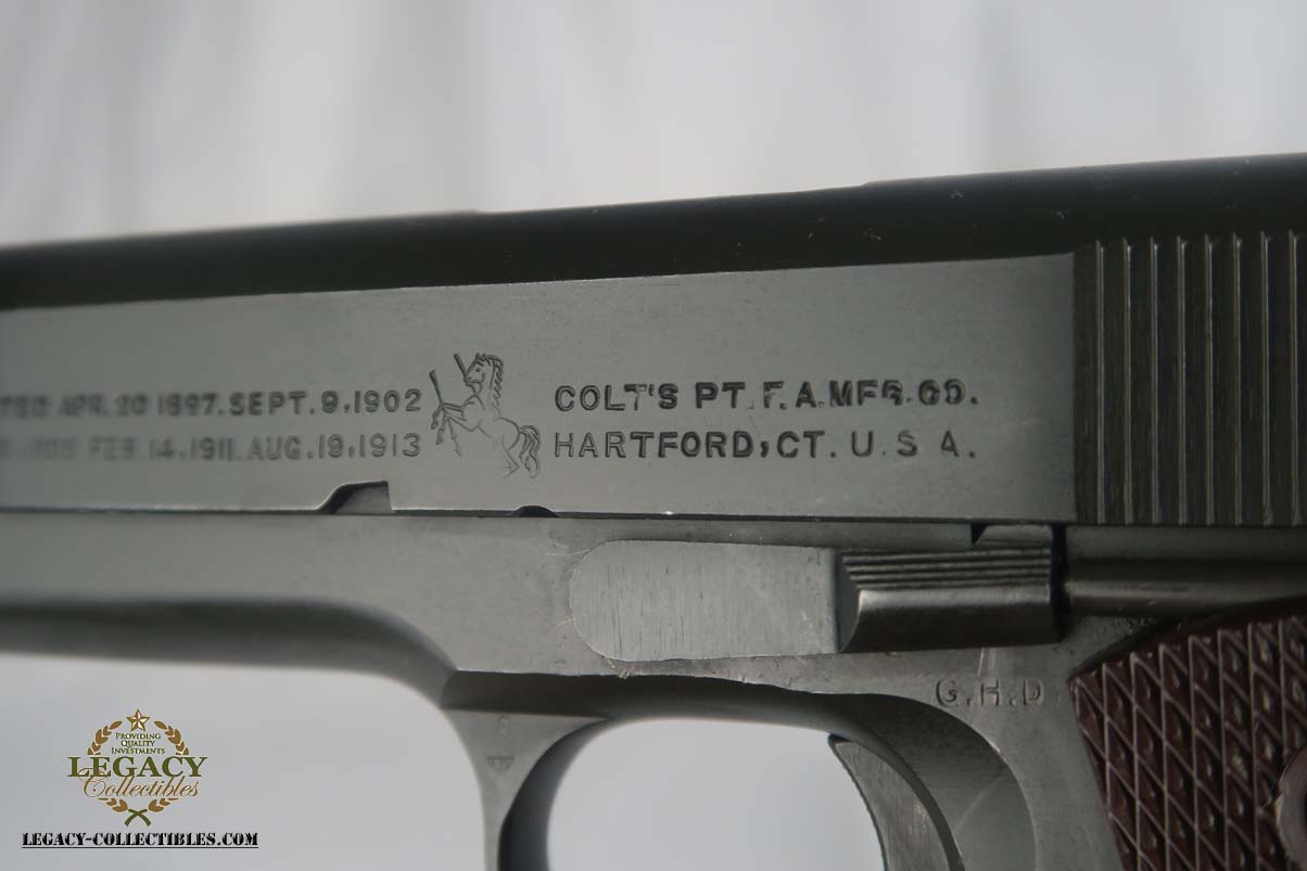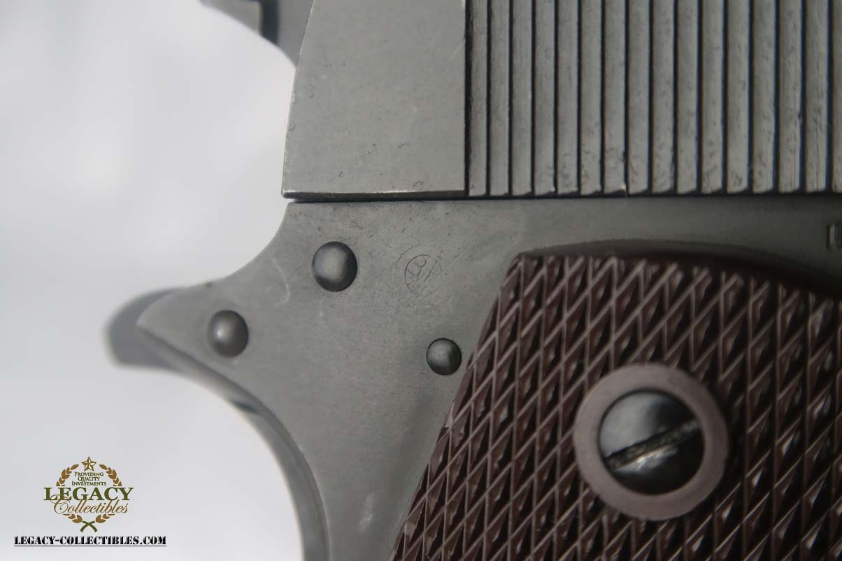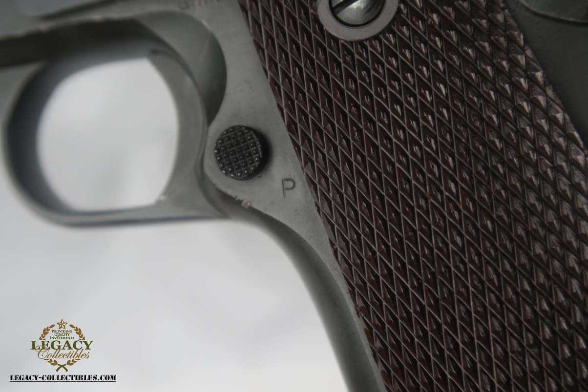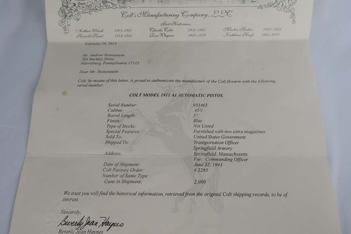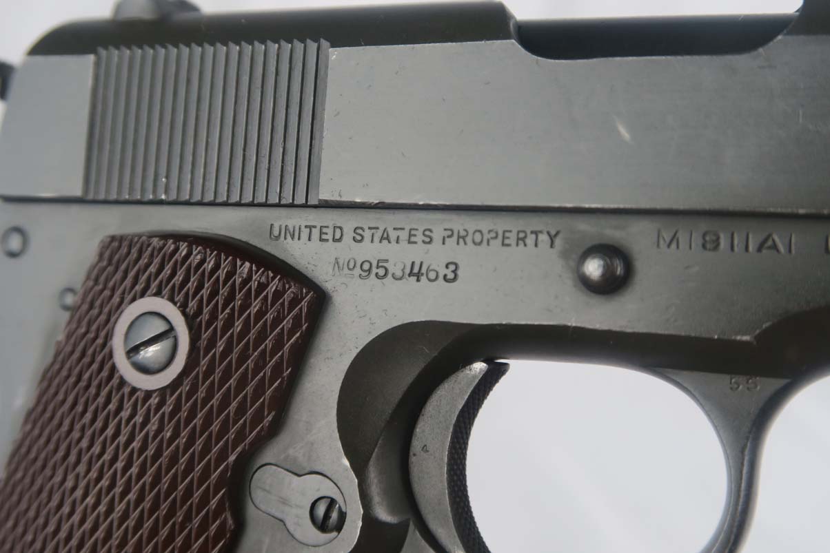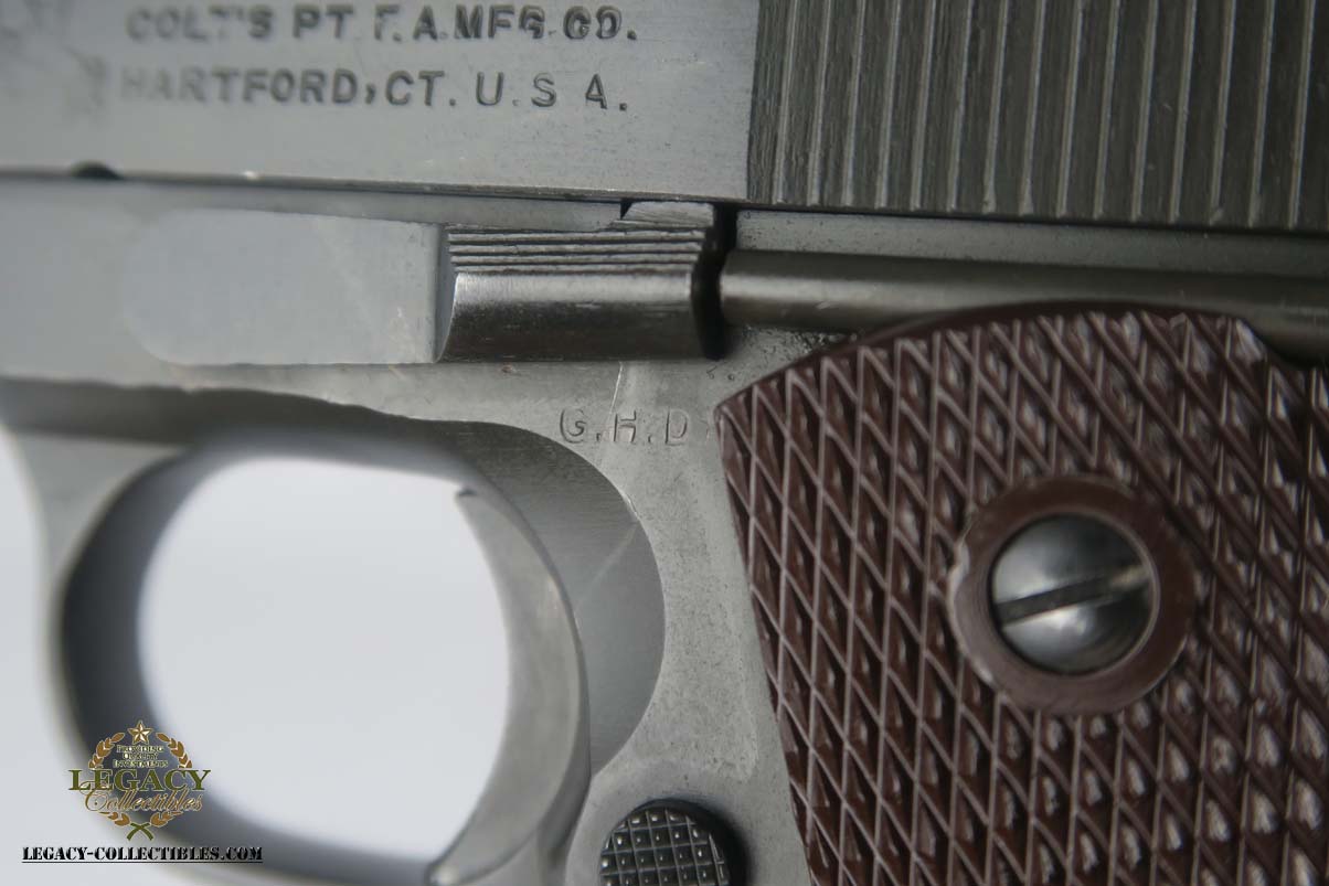 6/5/17 – This is a minty Colt M1911A1, with a similar minty holster and Colt factory letter. The original finish rates at 99%, with minor edge wear. This pistol has the matching number slide, which was discontinued a a month or two later. This pistol was shipped from Colt to Springfield’s Armory in June of 1943.This pistol is all correct and original, with features such as P proofs on the slide and frame, G.H.D. inspector’s mark, proper Colt barrel and correct grips. This is an early GHD inspected pistol with small GHD marking. ‘R’ marked magazine. Minty holster is dated 1942 and manufactured by Milwaukee Saddlery Co. The factory letter issued by Colt is included with this listing, and documents some of the history associated with this pistol. Bore has strong rifling but is slightly freckled near the muzzle.
