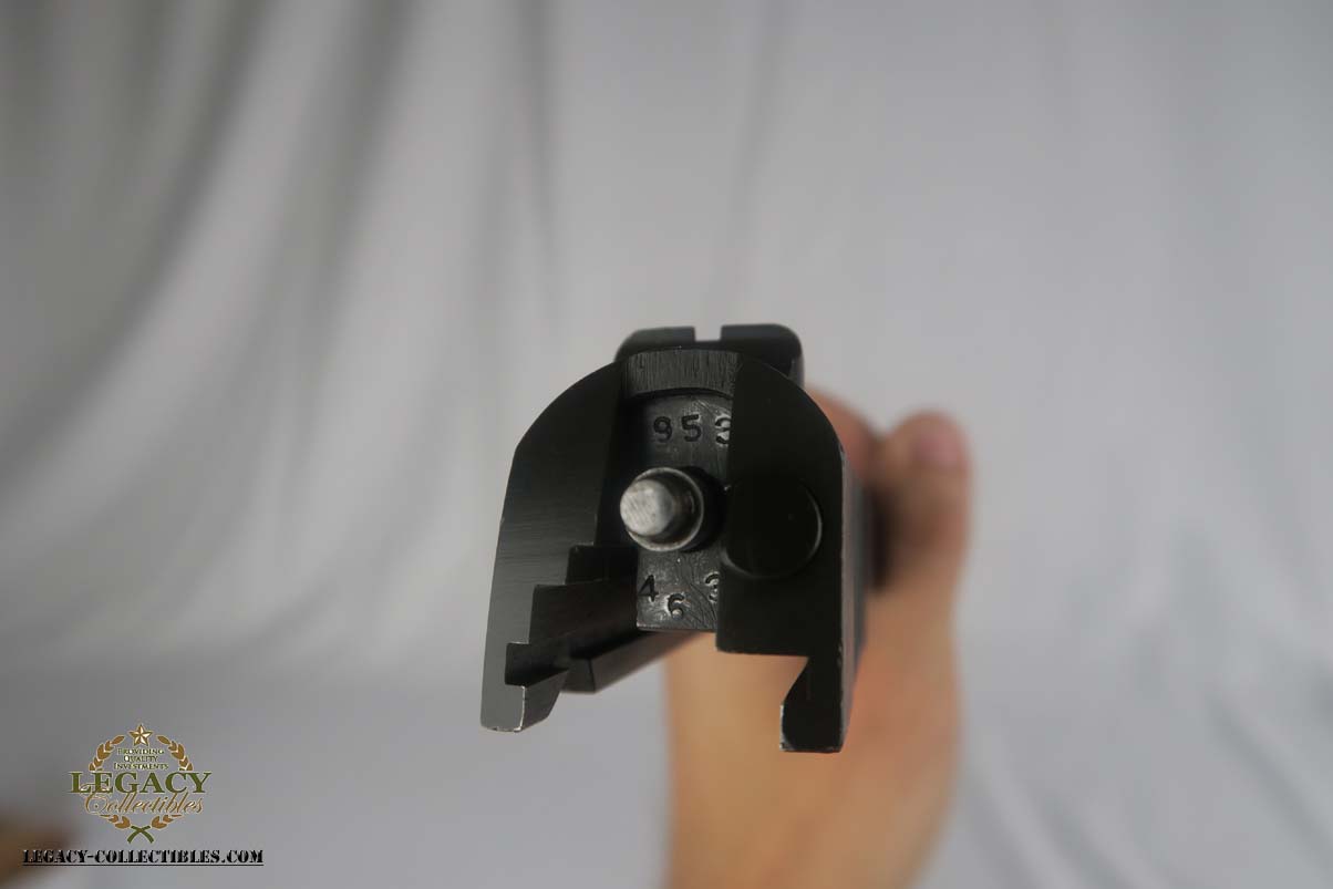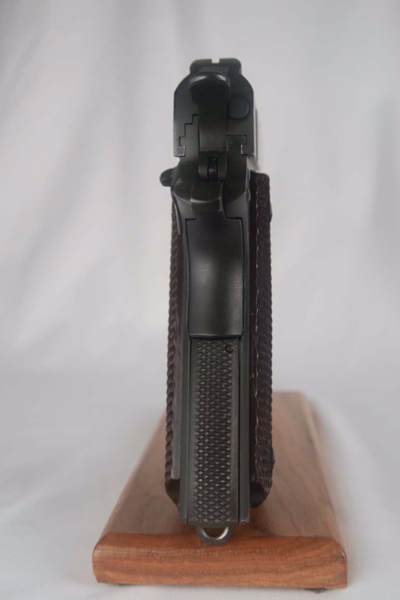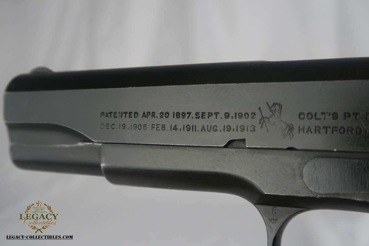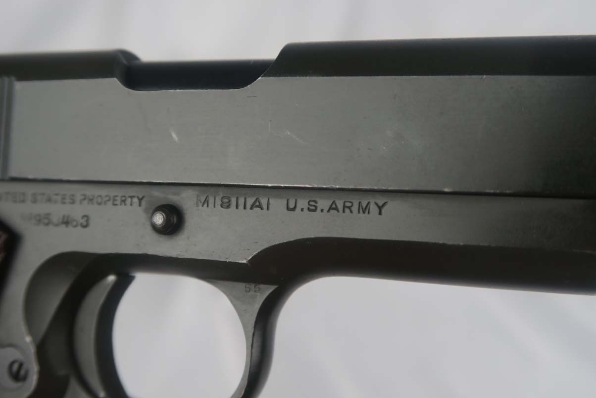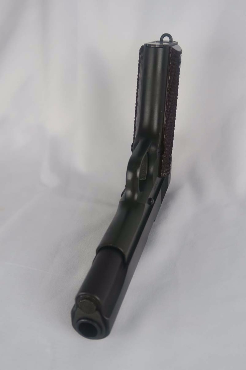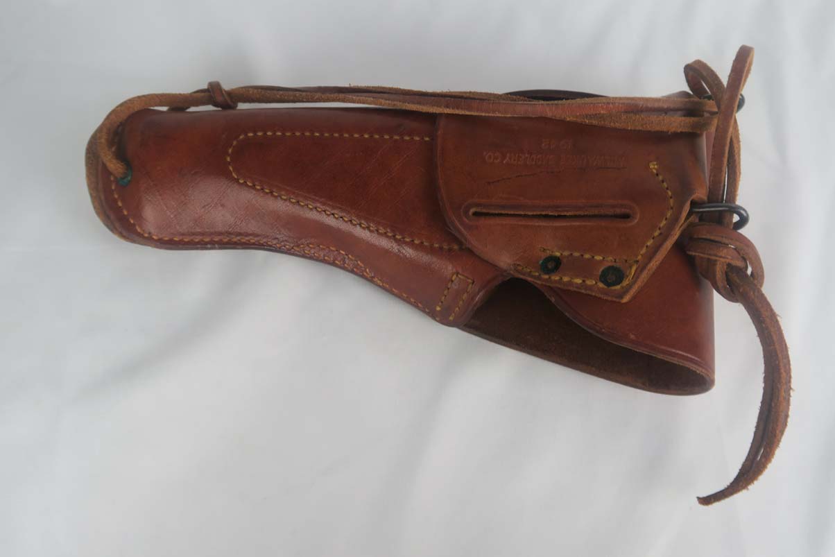 6/5/17 – This is a minty Colt M1911A1, with a similar minty holster and Colt factory letter. The original finish rates at 99%, with minor edge wear. This pistol has the matching number slide, which was discontinued a a month or two later. This pistol was shipped from Colt to Springfield’s Armory in June of 1943.This pistol is all correct and original, with features such as P proofs on the slide and frame, G.H.D. inspector’s mark, proper Colt barrel and correct grips. This is an early GHD inspected pistol with small GHD marking. ‘R’ marked magazine. Minty holster is dated 1942 and manufactured by Milwaukee Saddlery Co. The factory letter issued by Colt is included with this listing, and documents some of the history associated with this pistol. Bore has strong rifling but is slightly freckled near the muzzle.