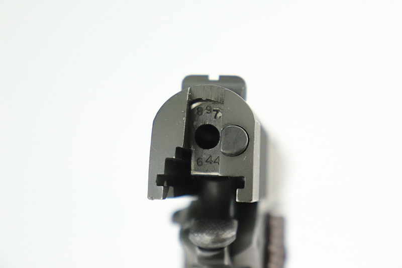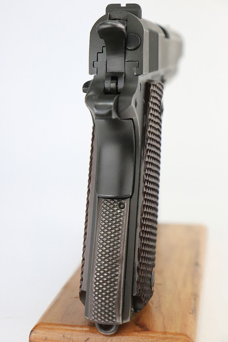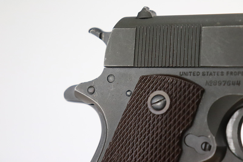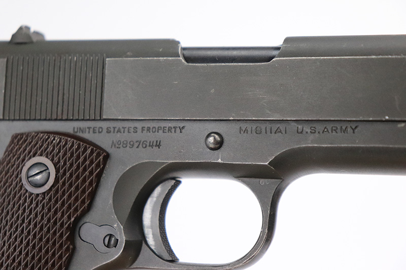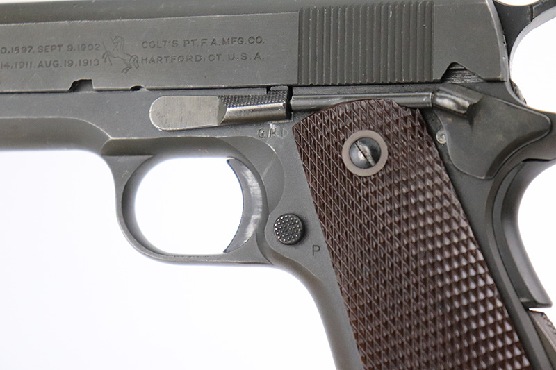 10/4/22 – This is a minty example of a Colt Model 1911A1 issued to the US military in 1943. It is “United States Property” marked, has the proper cross-canon military cartouche, and has the proper “GHD” inspector initials. The slide is numbered and matching, and the gun comes with a proper “large G” marked Colt barrel. The gun itself has retained nearly all of its original finish with minor wear on the high edges of the slide and very minor thinning on the front strap. Comes with excellent period-correct reddish plastic grips and one magazine. The bore is mint.