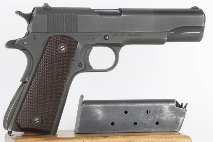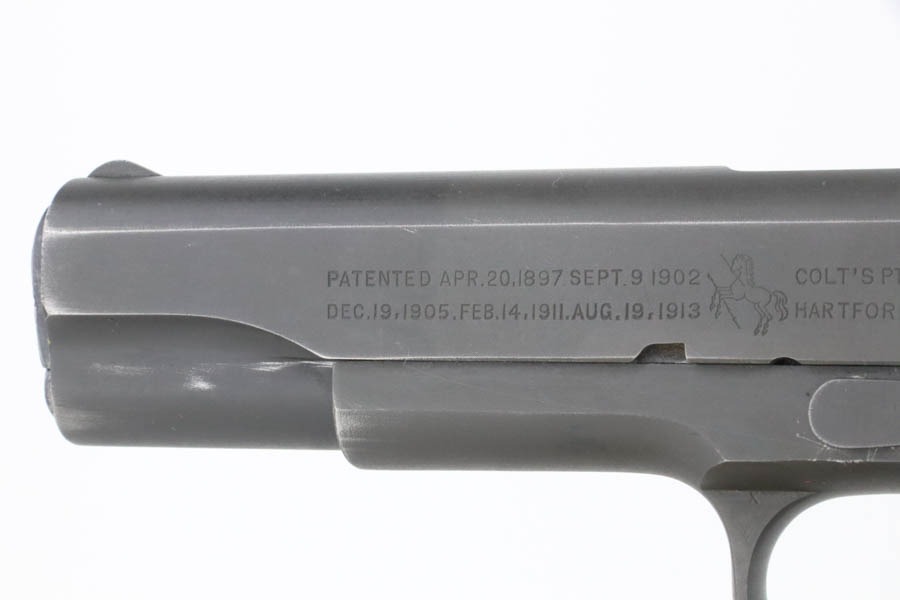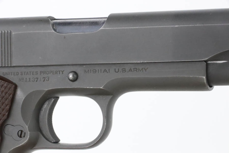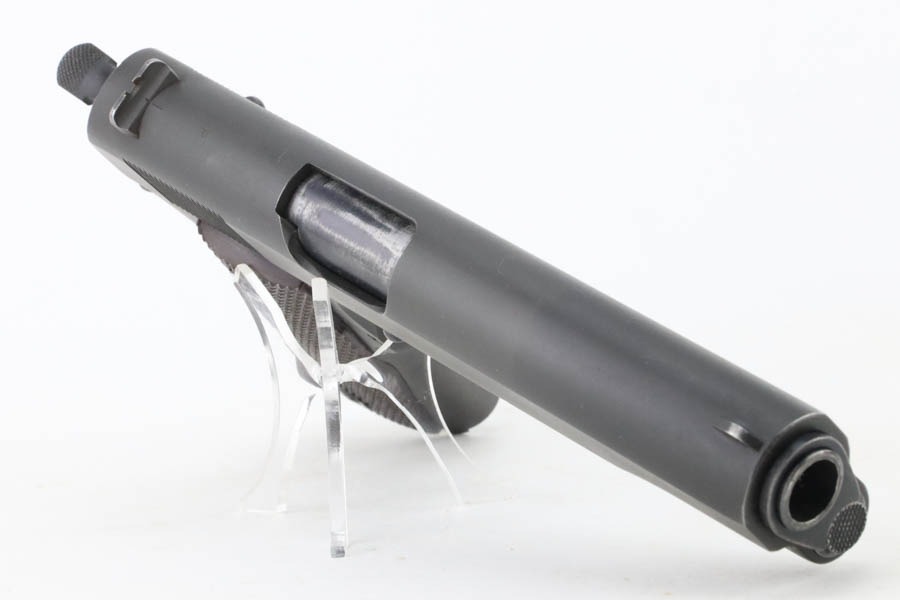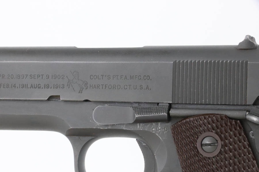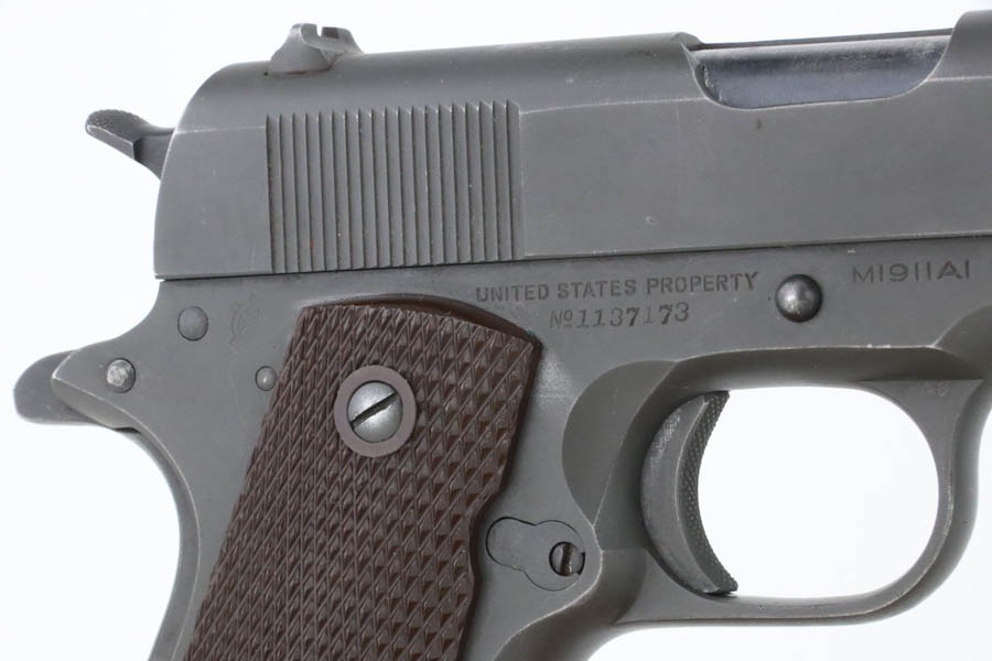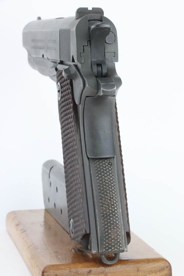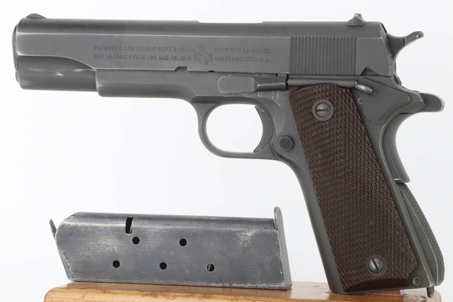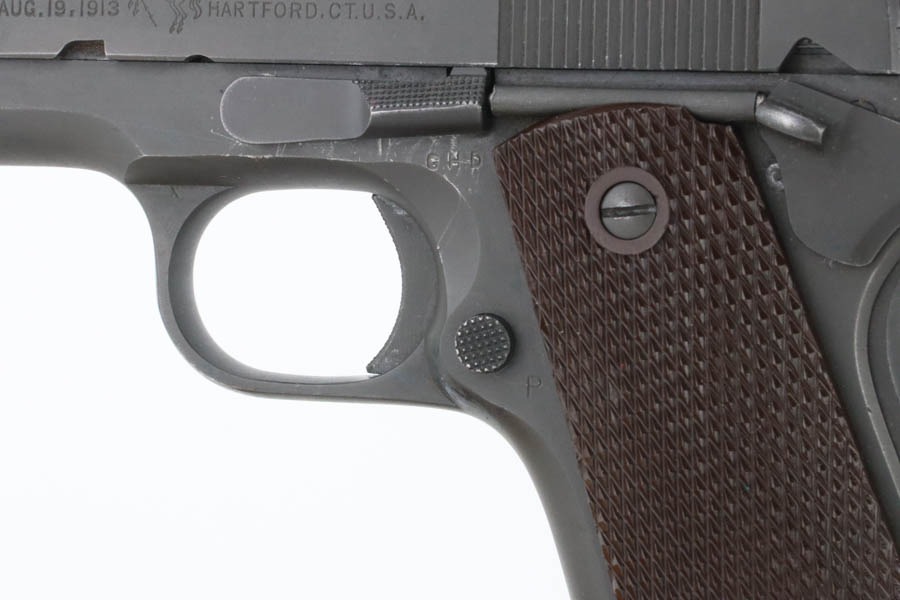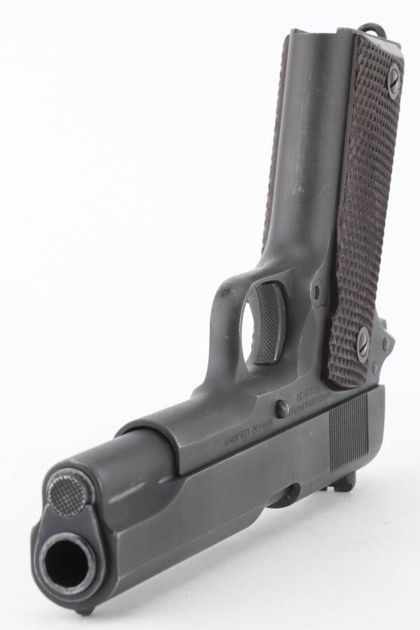 10/4/24 – This is a near-mint Colt 1911A1 from early 1943. The slide is numbered and matching, it has the proper military proofs, and has a correct Colt barrel with a small “F” under the lug. It has retained about 97-98% of its original parkerized finish with just hints of high edge and muzzle wear and a few tiny marks from the slide stop. Fitted with period-correct plastic grips and comes with a proper “S” marked magazine. The bore has pretty good rifling, but there is light pin-pricking throughout.