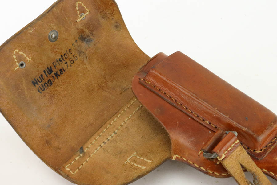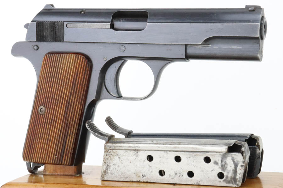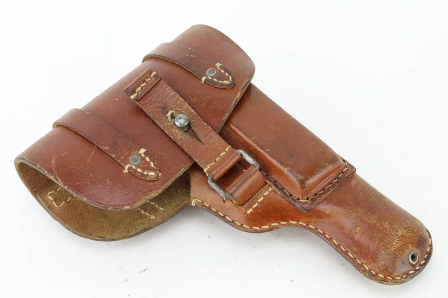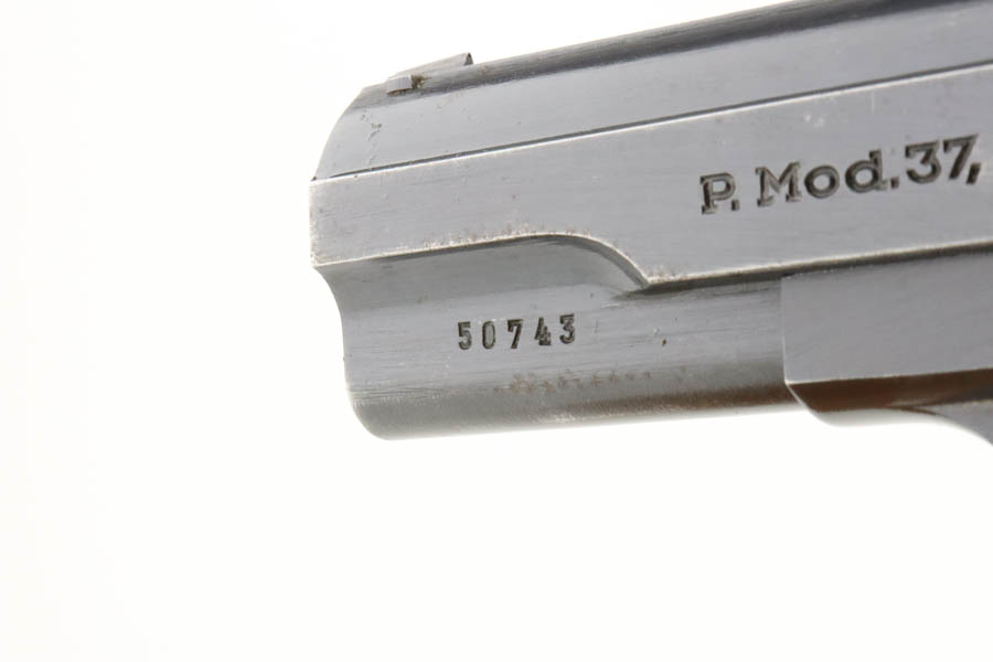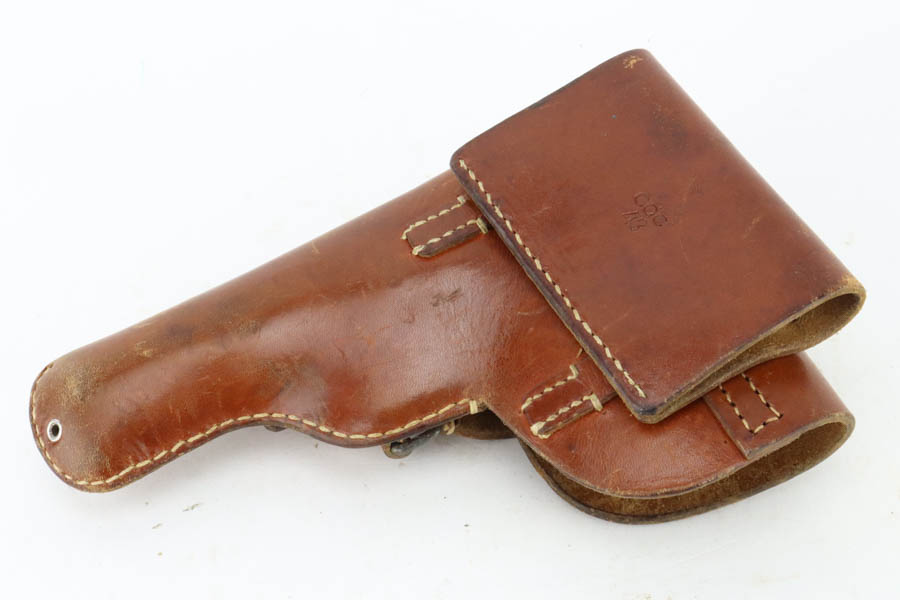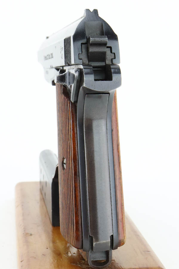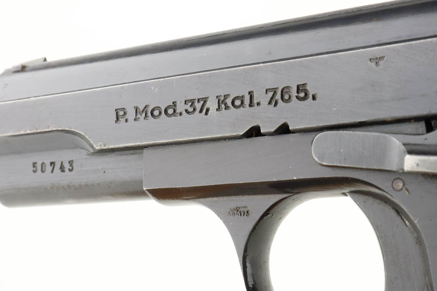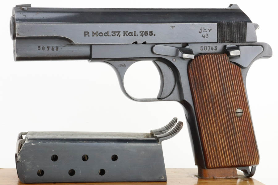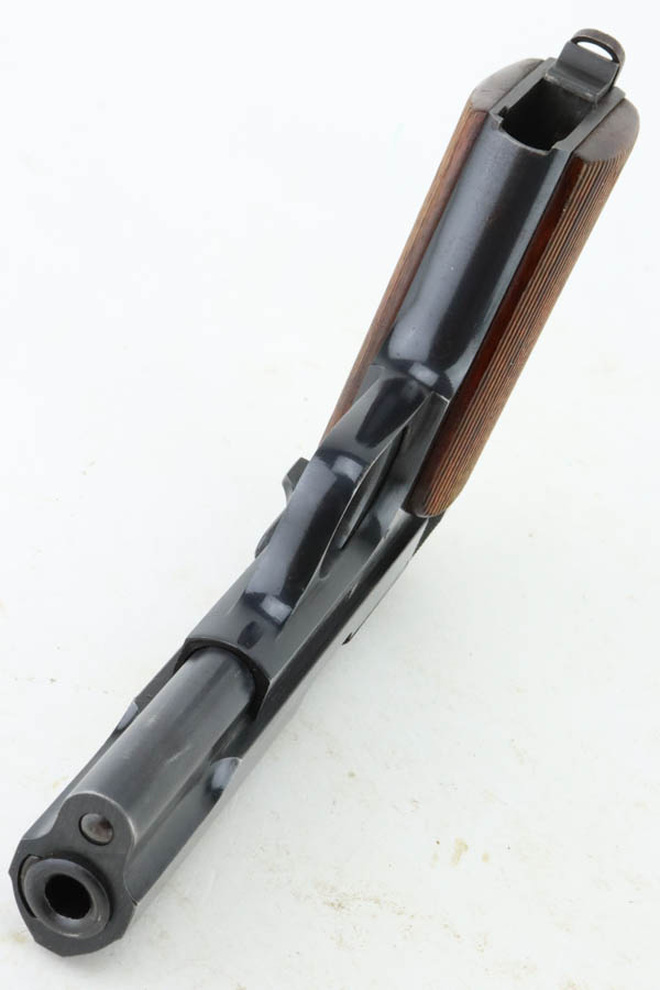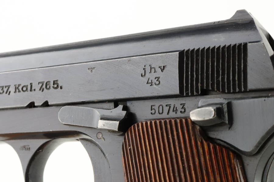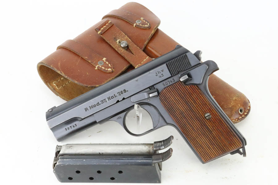 6/27/24 – This is a near-mint example of a Femaru Model 37 issued to the Luftwaffe in 1943. All matching and waffen-proofed. It comes as a rig with an excellent 1943-dated holster (great ink stamp on the inside), one original matching-numbered magazine, and one spare un-numbered magazine. The gun itself has retained nearly all of its original wartime finish with just a hint of muzzle wear. Fitted with excellent wood grips. Minty bore.