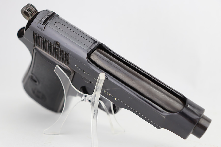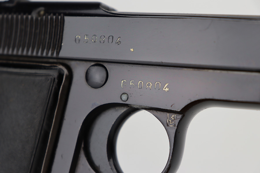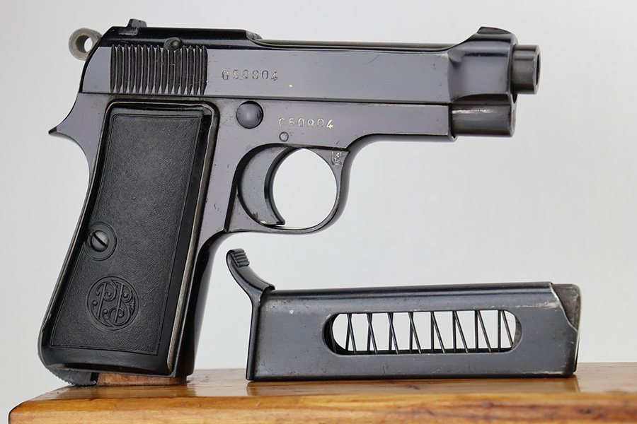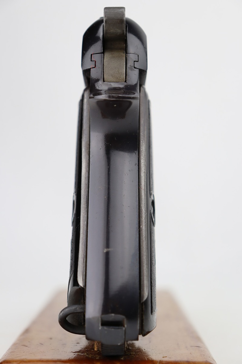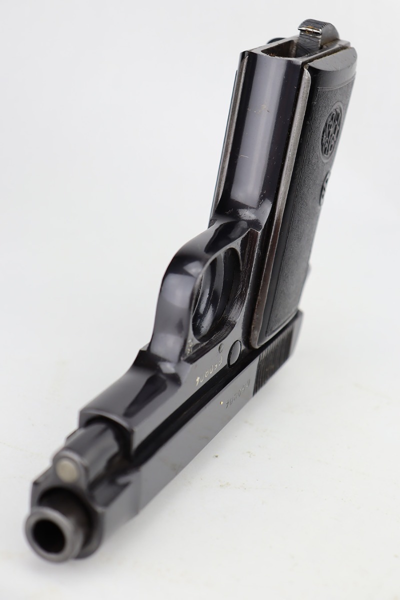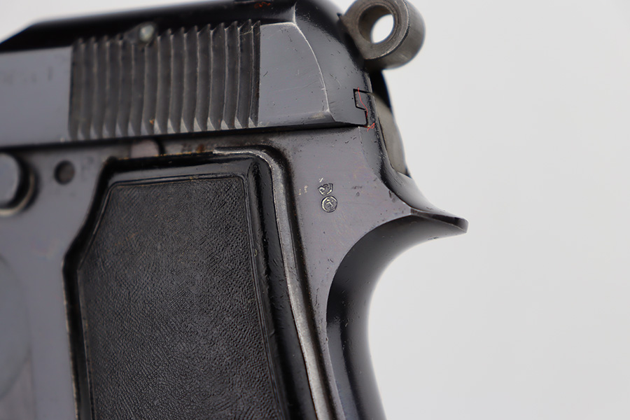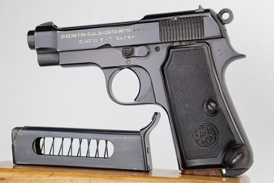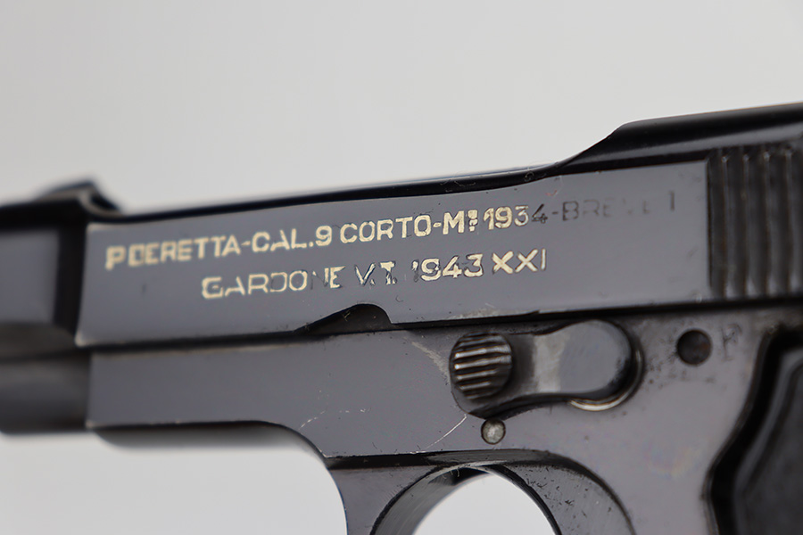 6/12/23 – This is a near-mint example of a Beretta Model 1934 issued to the Italian military in 1943. It is all matching and has the proper Italian proofs. It has retained nearly all of its original high polish finish with just some tiny handling marks on the grip straps and on the left side of the frame. Fitted with excellent period-correct black bakelite grips. Comes with one proper magazine. Mint bore.