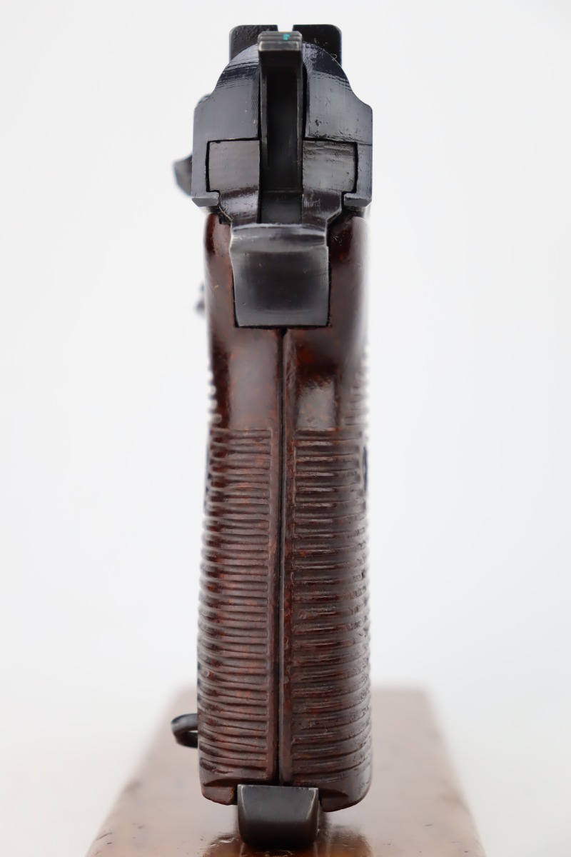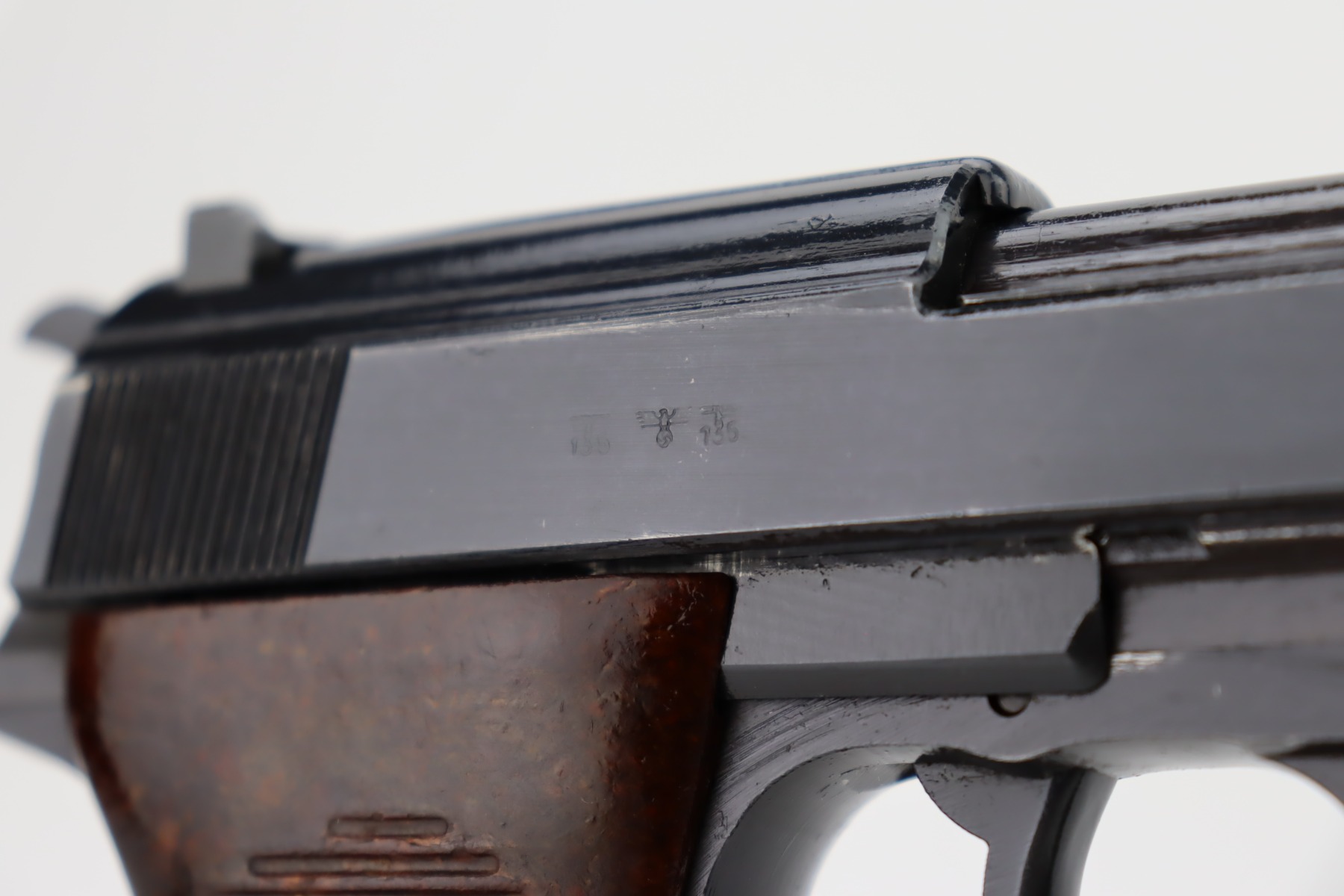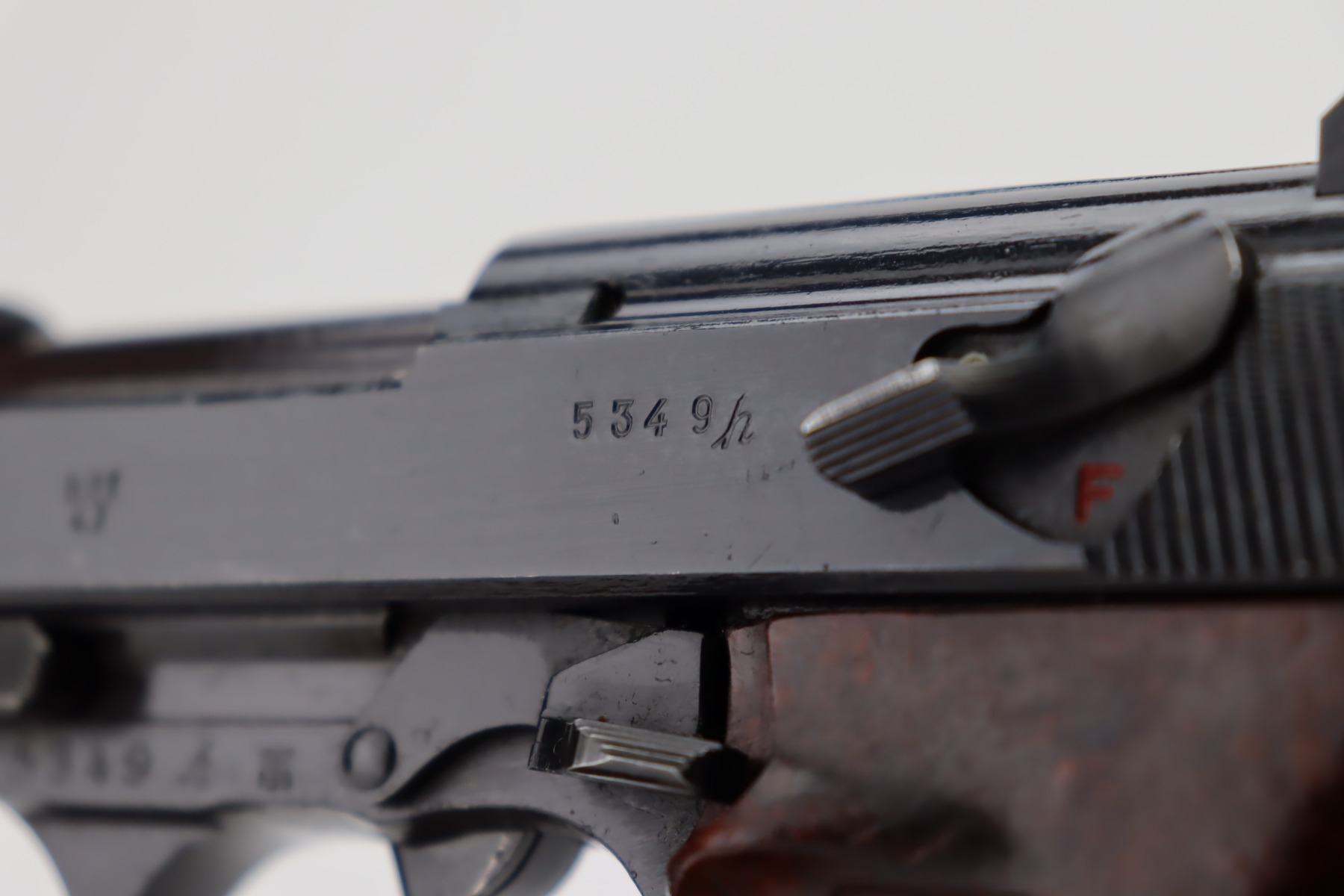 10/19/23 – This is a near-mint BYF 43 Mauser P.38 issued to the Nazi military in 1943. All matching with the proper “Eagle 135” military acceptance proofs. The bluing rates about 97% with just very minor wear around the muzzle and on the very front edges of the slide. Fitted with excellent reddish bakelite grips and comes with a “Waffen 706” marked magazine. Mint bore. De-cocker is functional.