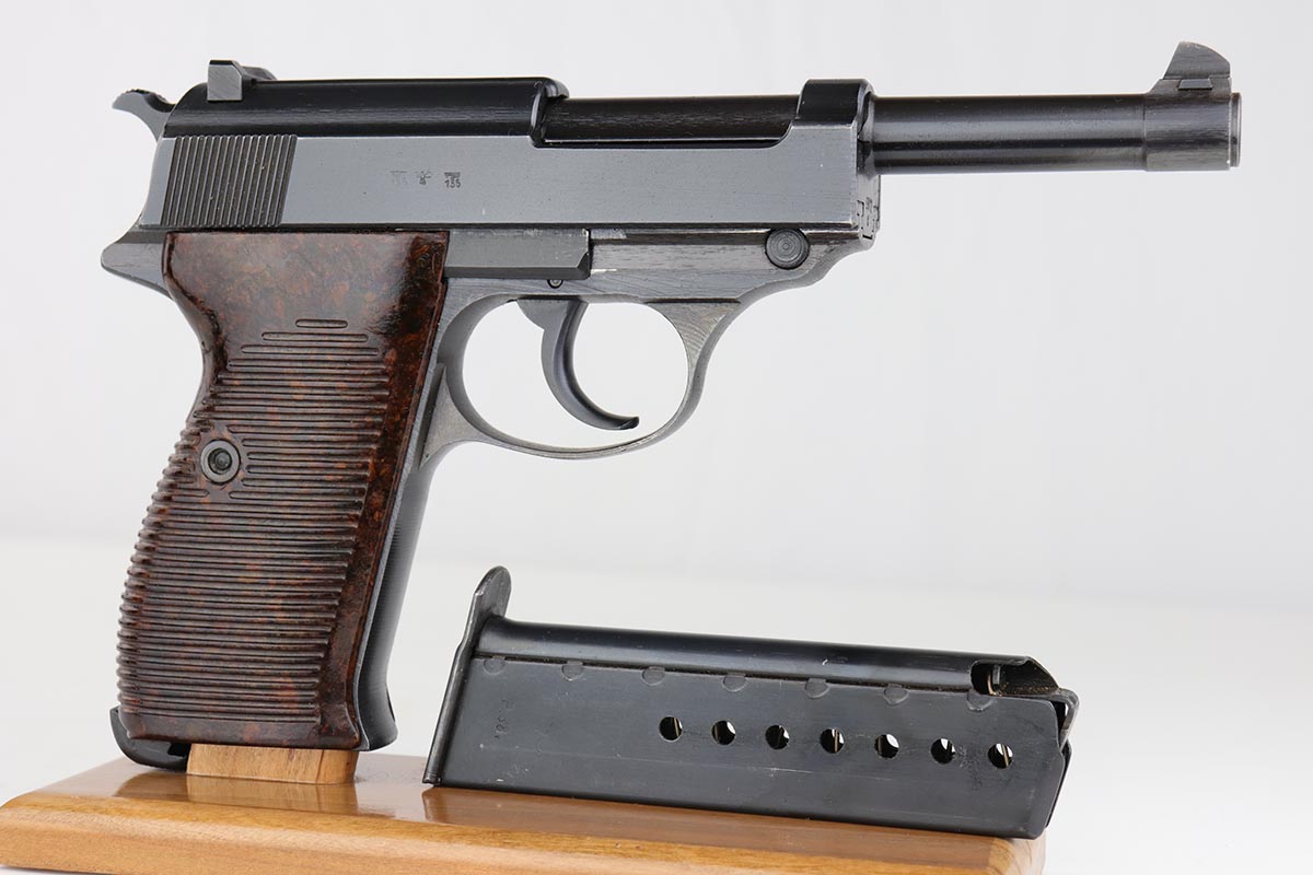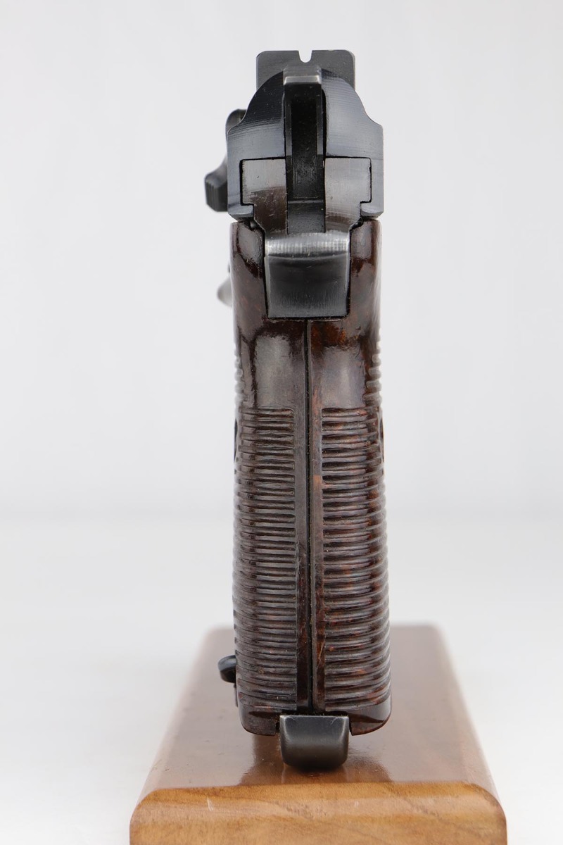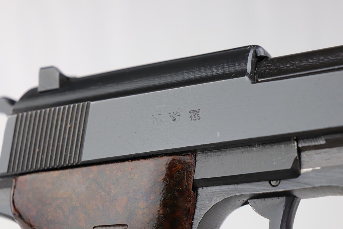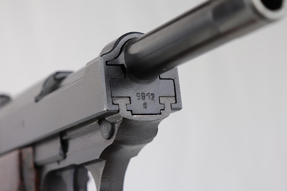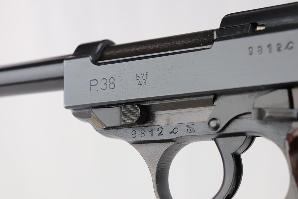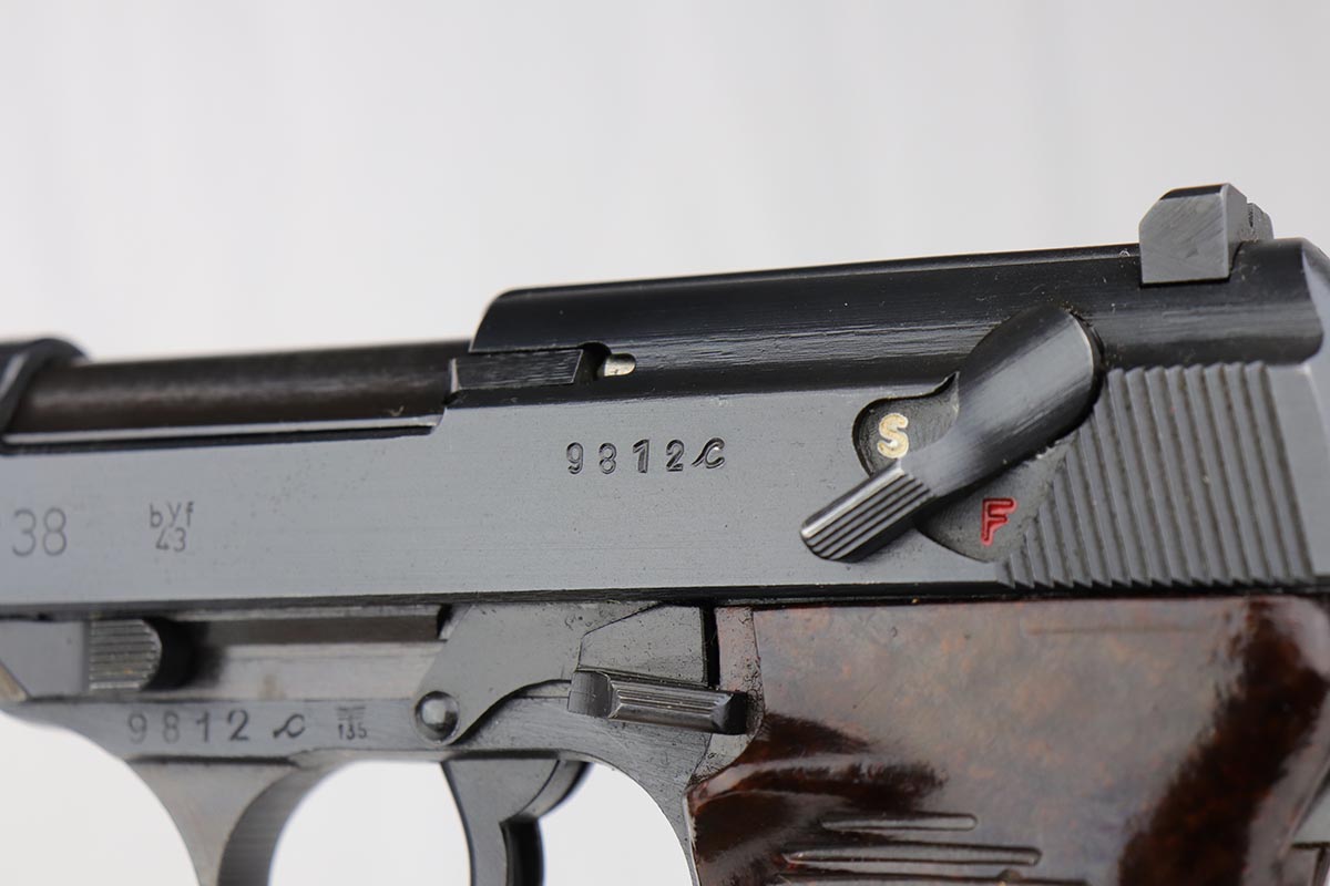 7/16/19 – Made in April of 1943, this is a near-mint Mauser P.38 with the desirable dust blue style finish. The pistol is all matching and original with 98-99% blue remaining, showing just a hint of muzzle wear and a minor finish loss along the top of the barrel from the slide being racked. The bore is mint and the reddish-brown grips are just as nice. Correct Mauser magazine.