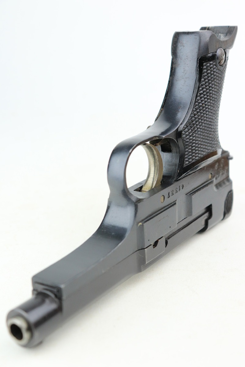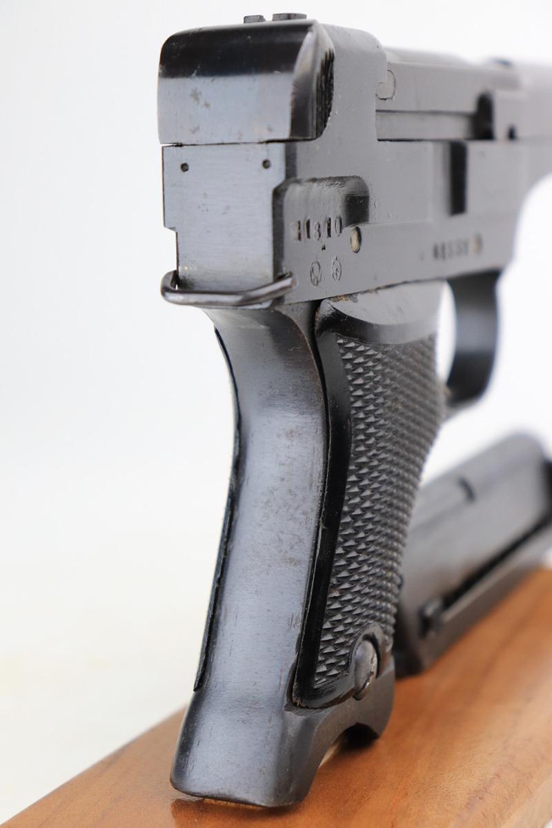 5/25/22 – This is a near-mint example of a Nambu Type 94 issued to the Japanese military in October of 1943. It is all matching and comes with one original matching-numbered magazine. It has retained nearly all of its original bluing with just a hint of wear around the muzzle and one small handling mark on the left side of the frame. Minor freckling on both grip straps. Very nice straw-coloring on the small parts. Comes with excellent period-correct black bakelite grips. Mint bore.