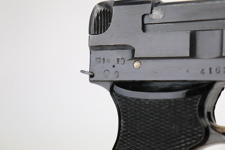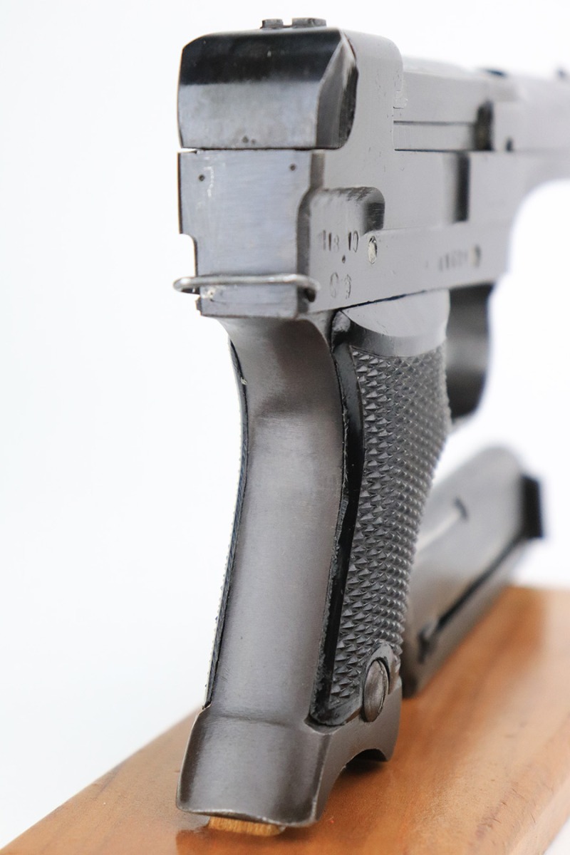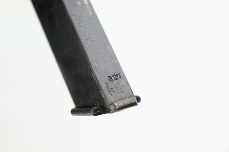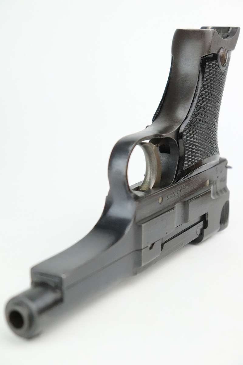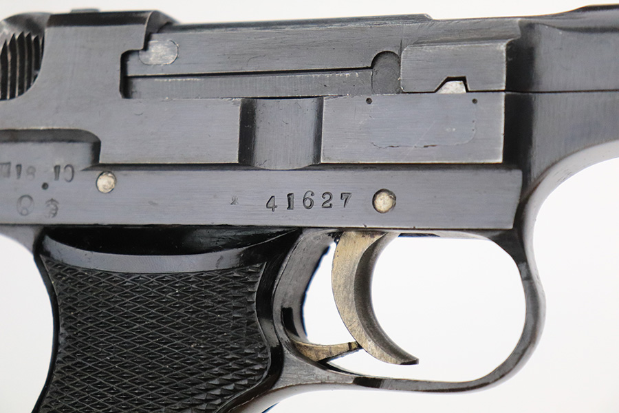 6/16/22 – This is a minty example of a Nambu Type 94 issued to the Japanese military in October of 1943. It is all matching and comes with one original matching-numbered magazine. It has retained nearly all of its original finish with some hints of wear around some of the high edges, some minor dulling on the grip straps, and minor pin-pricking around the muzzle. Comes with excellent period-correct black bakelite grips. The bore is minty except for a small area of pitting around the muzzle end.