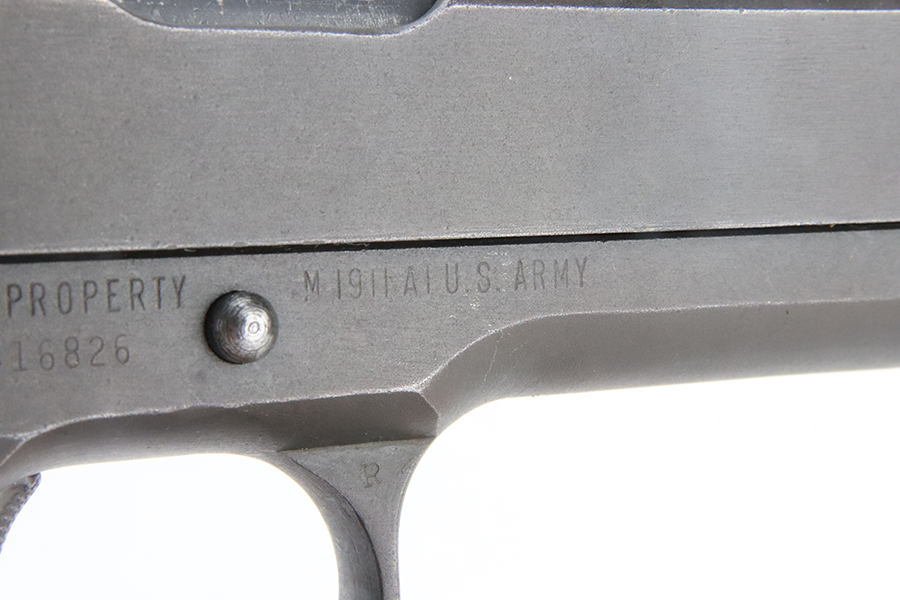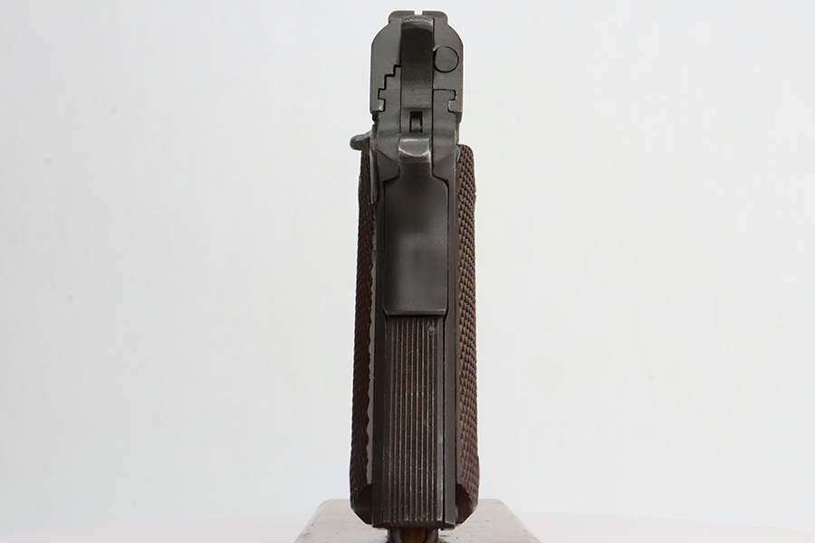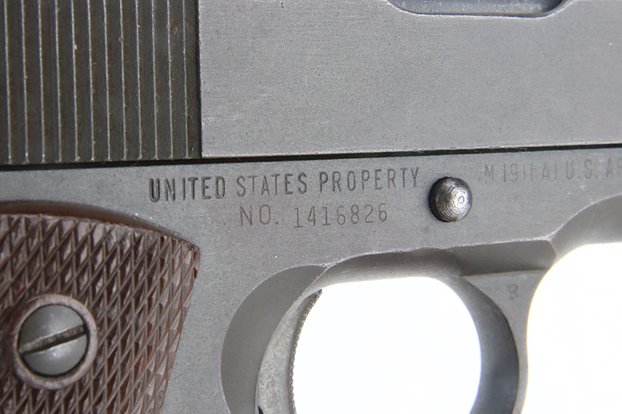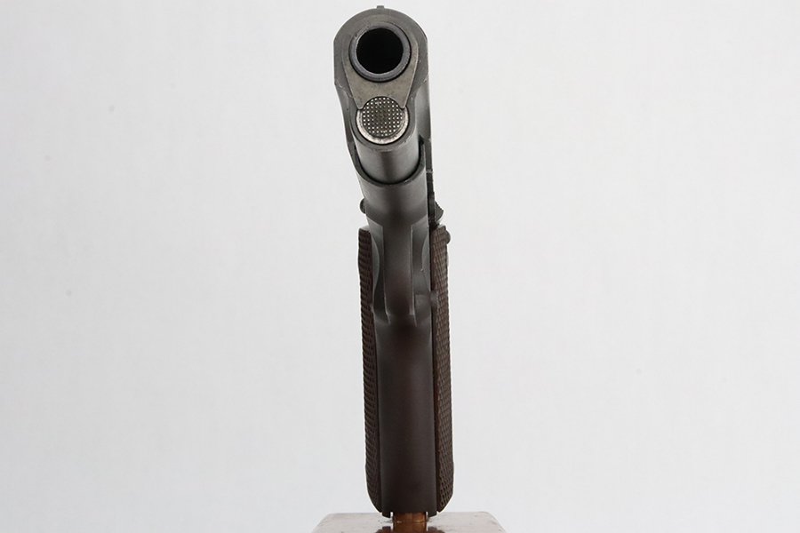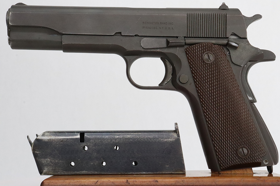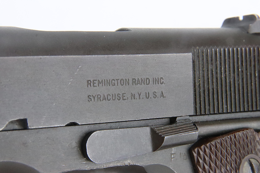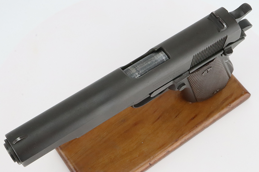 3/6/24 – This is a near-mint example of a Remington Rand 1911A1 issued to the US military in 1943. It is all correct and has a proper High Standard barrel. The gun has retained nearly all of its original parkerized finish with just a hint of muzzle wear and some very light brown patina under the finish on the front strap. Fitted with period-correct reddish plastic grips and comes with a proper “L” marked magazine. Mint bore.
