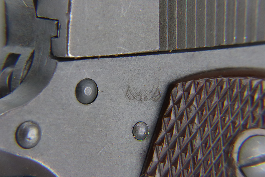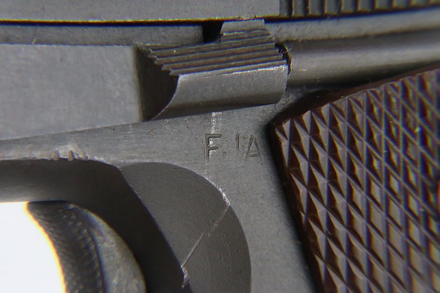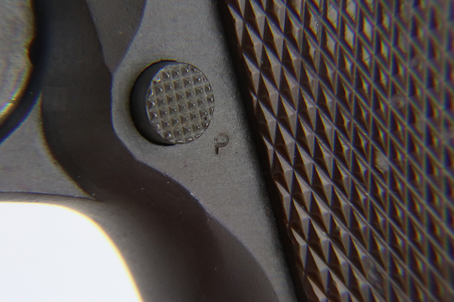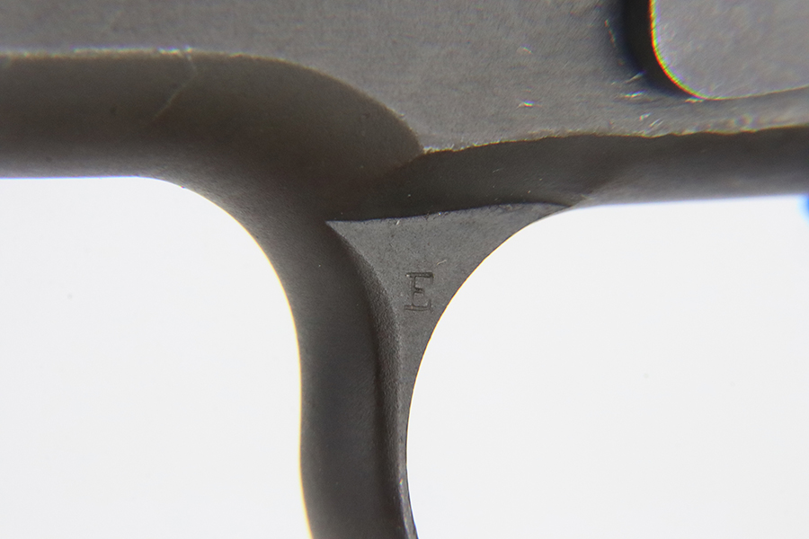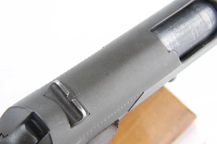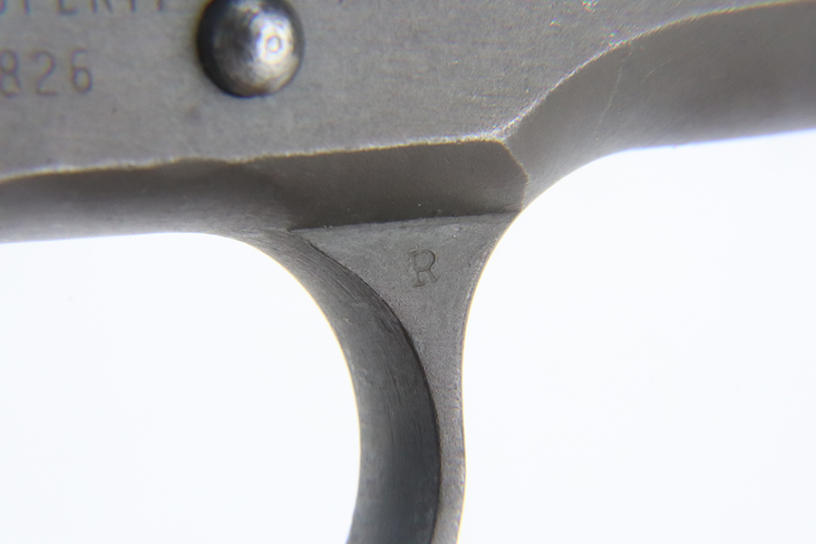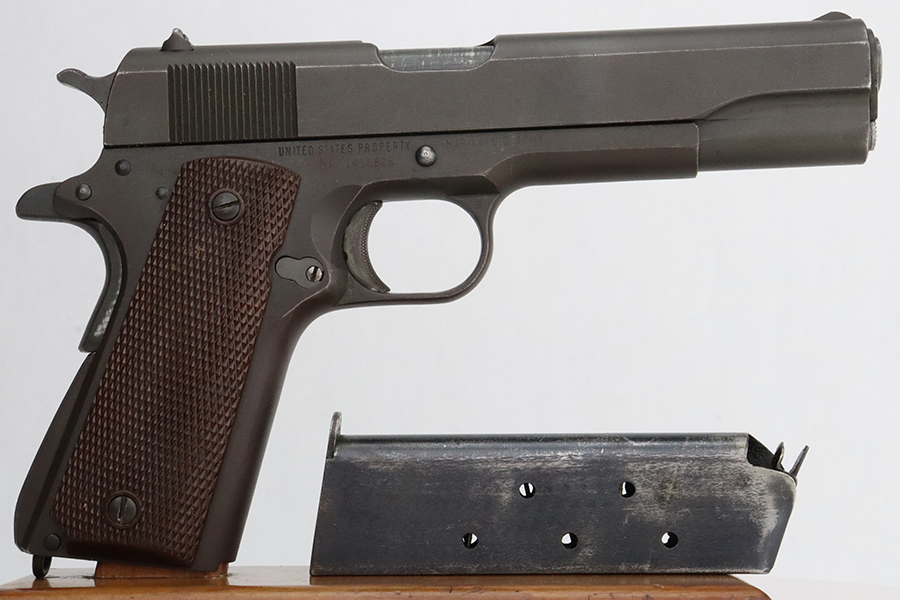 3/6/24 – This is a near-mint example of a Remington Rand 1911A1 issued to the US military in 1943. It is all correct and has a proper High Standard barrel. The gun has retained nearly all of its original parkerized finish with just a hint of muzzle wear and some very light brown patina under the finish on the front strap. Fitted with period-correct reddish plastic grips and comes with a proper “L” marked magazine. Mint bore.