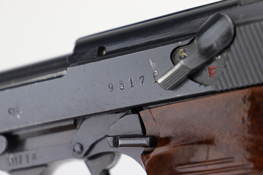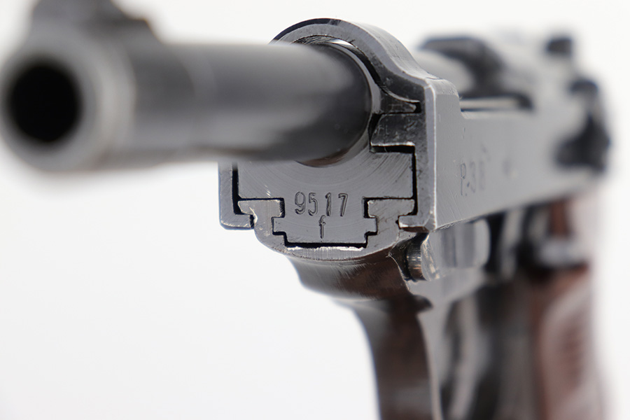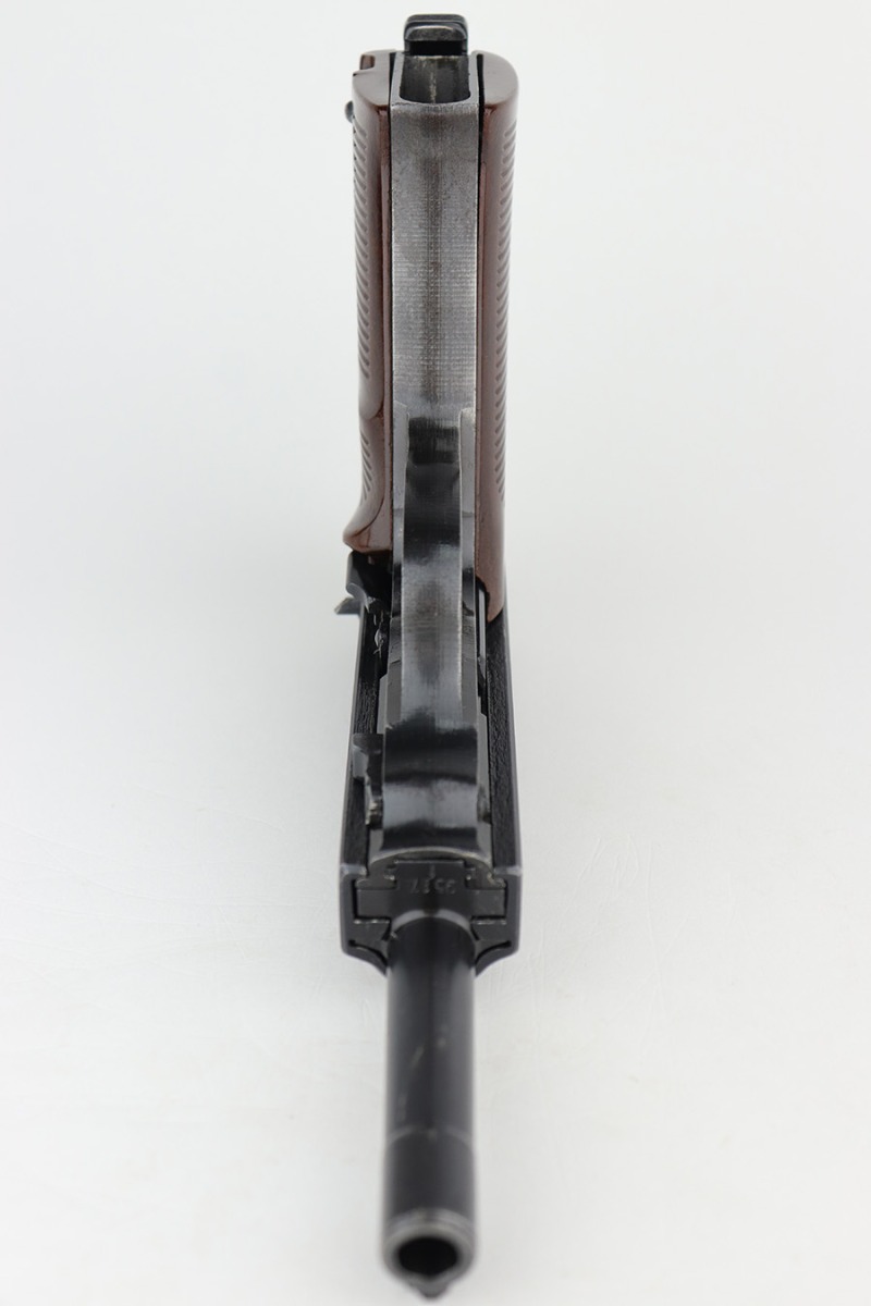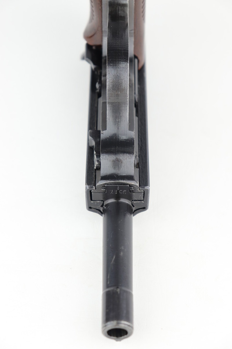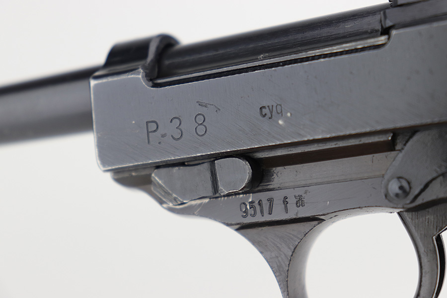 4/20/23 – This is a minty example of a Spreewerk P.38 issued to the Nazi military in August of 1943. All matching with the proper “Eagle 88” military acceptance proofs throughout. There is an asterisk marking on the left side of the barrel, indicating it failed initial inspection and was repaired at the factory – a desirable trait for collectors. This one has retained about 97% of its original finish with just very minor thinning on the front strap and very minor wear around the muzzle and on some of the high edges. Fitted with excellent reddish bakelite grips. Comes with an un-marked magazine. The bore is shiny with strong rifling for the most part, but there is light freckling throughout. De-cocker is functional. The hold-open does not work properly with this magazine.