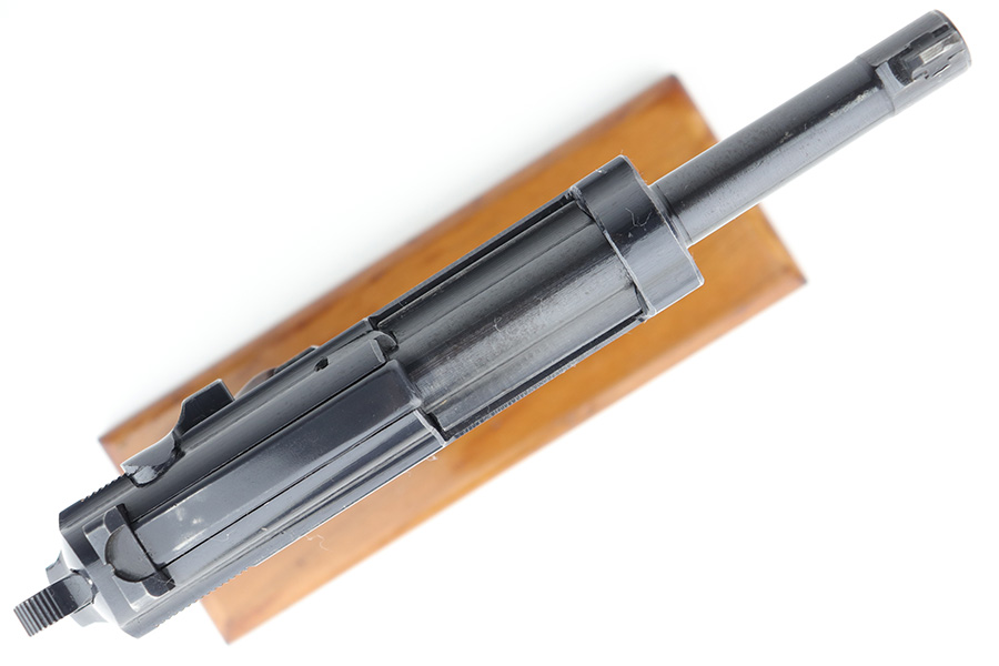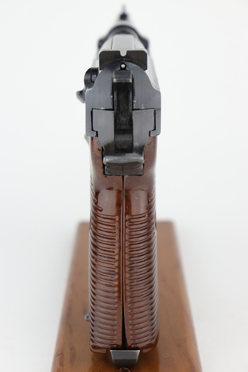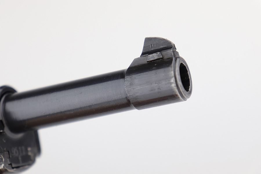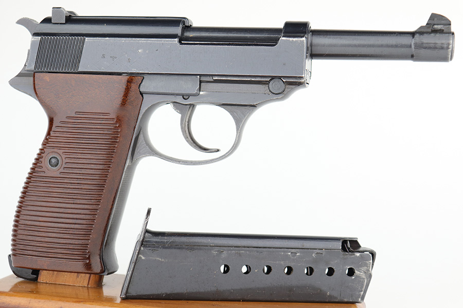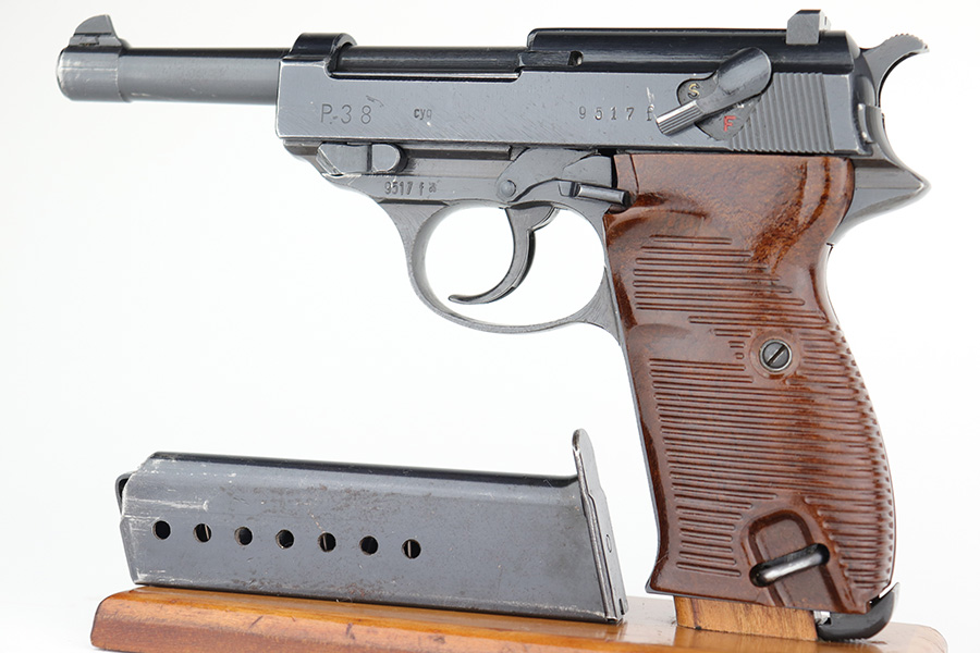 4/20/23 – This is a minty example of a Spreewerk P.38 issued to the Nazi military in August of 1943. All matching with the proper “Eagle 88” military acceptance proofs throughout. There is an asterisk marking on the left side of the barrel, indicating it failed initial inspection and was repaired at the factory – a desirable trait for collectors. This one has retained about 97% of its original finish with just very minor thinning on the front strap and very minor wear around the muzzle and on some of the high edges. Fitted with excellent reddish bakelite grips. Comes with an un-marked magazine. The bore is shiny with strong rifling for the most part, but there is light freckling throughout. De-cocker is functional. The hold-open does not work properly with this magazine.