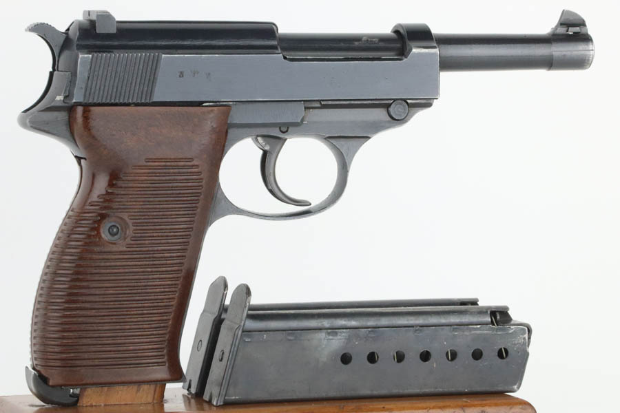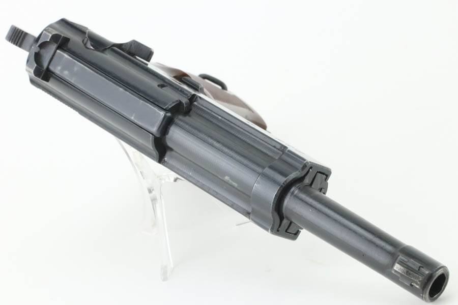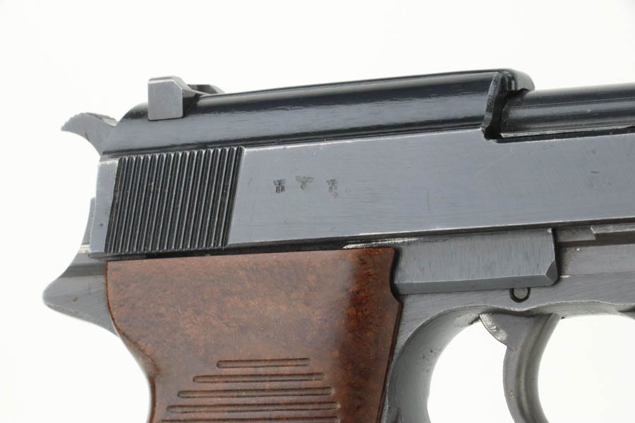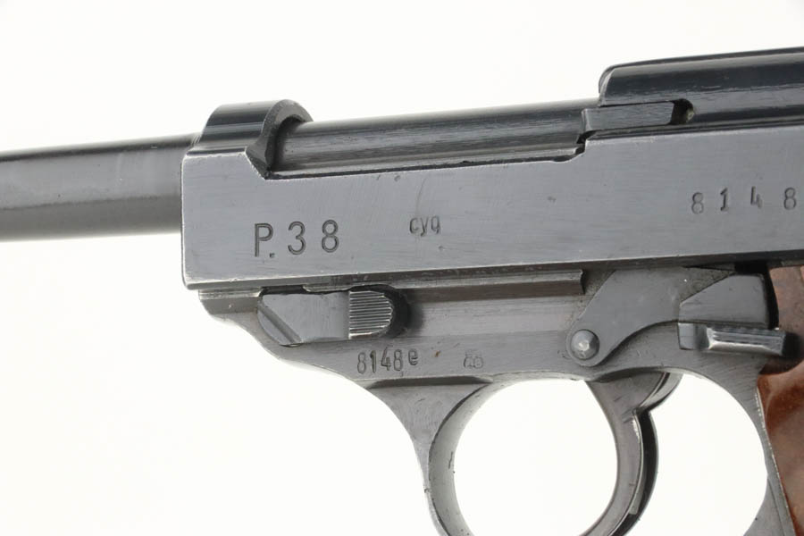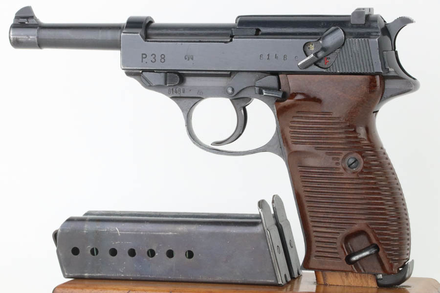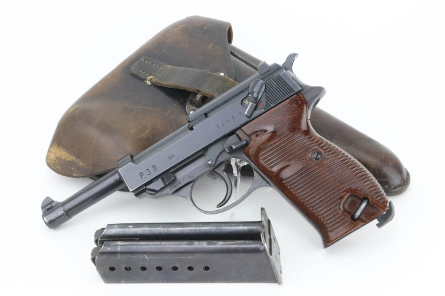 7/31/24 – This is a near-mint example of a Spreewerk P.38 issued to the Nazi military in about July of 1943. All matching with the proper “Eagle 88” military acceptance proofs throughout. It comes as a rig with a very nice 1943-dated hard shell holster, one “Eagle 88” proofed magazine, and one un-proofed jvd magazine. The gun itself has retained nearly all of its original finish with just hints of high edge and muzzle wear. Fitted with period-correct reddish bakelite grips. Near-mint bore. De-cocker is functional.