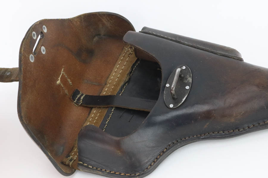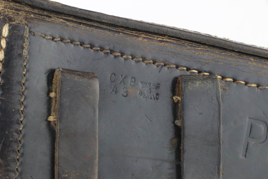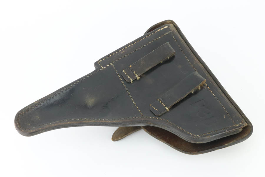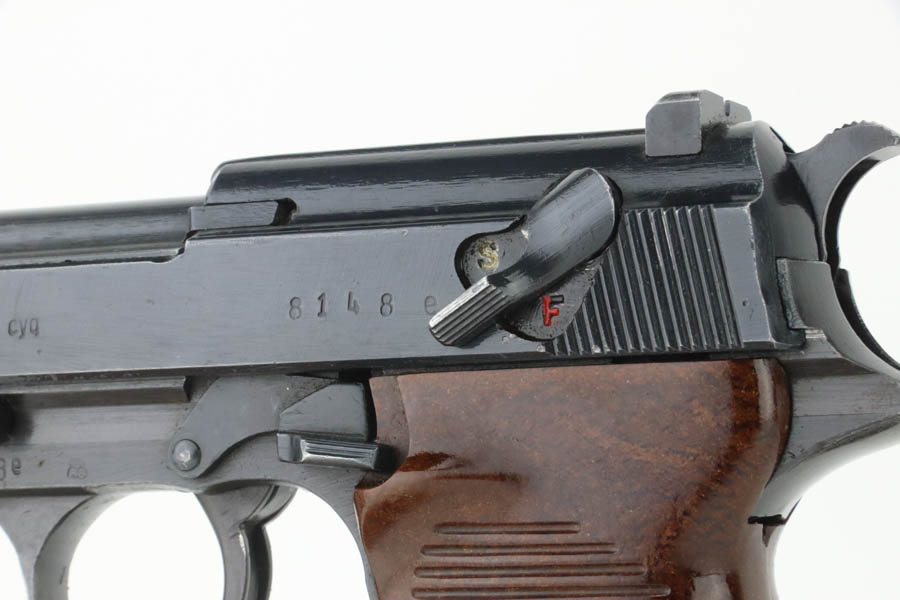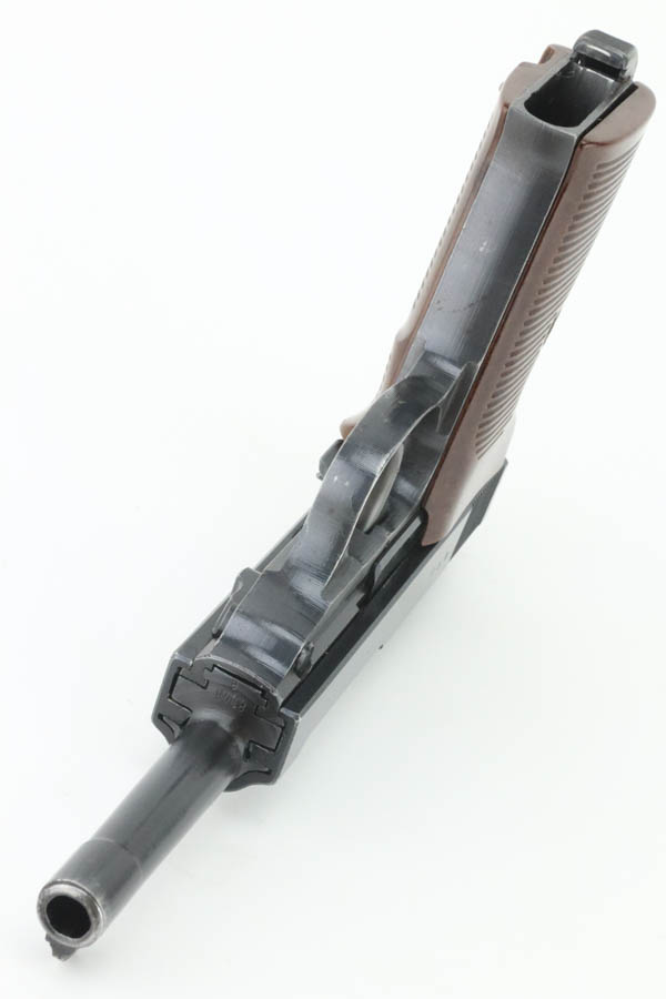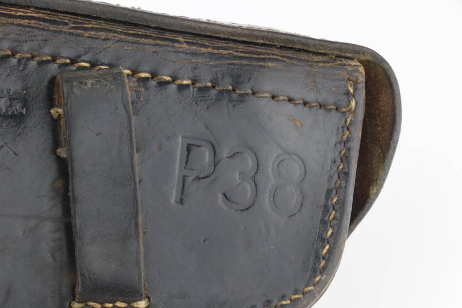 7/31/24 – This is a near-mint example of a Spreewerk P.38 issued to the Nazi military in about July of 1943. All matching with the proper “Eagle 88” military acceptance proofs throughout. It comes as a rig with a very nice 1943-dated hard shell holster, one “Eagle 88” proofed magazine, and one un-proofed jvd magazine. The gun itself has retained nearly all of its original finish with just hints of high edge and muzzle wear. Fitted with period-correct reddish bakelite grips. Near-mint bore. De-cocker is functional.