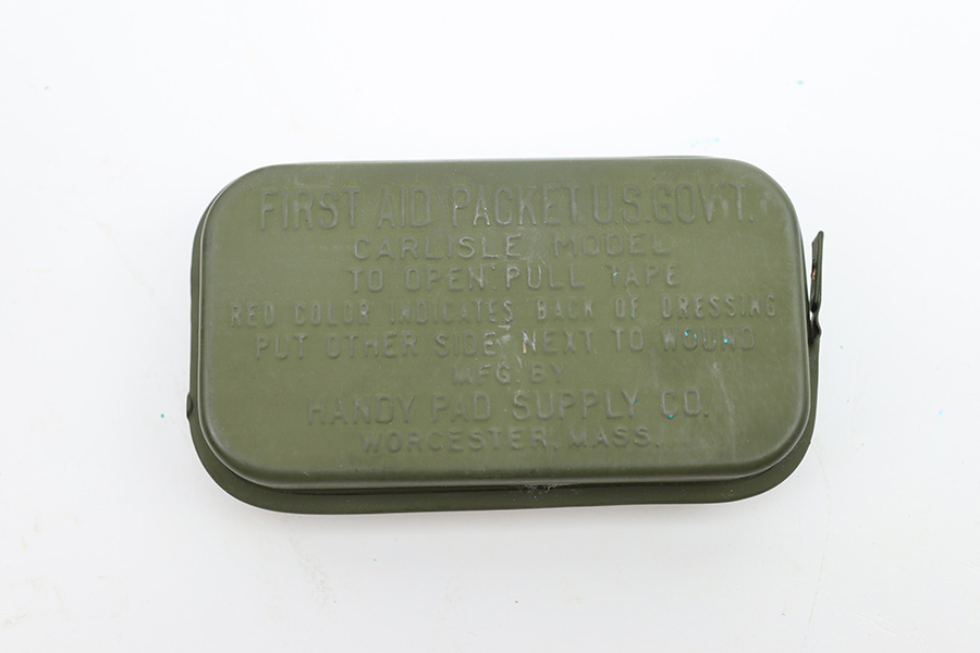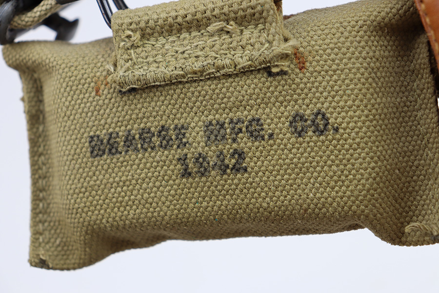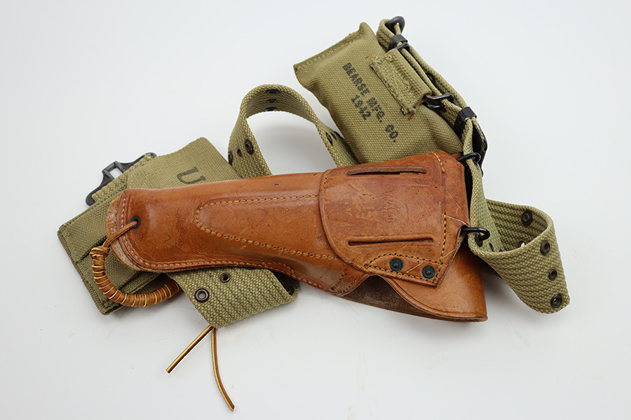 11/10/23 – This is a minty tan leather holster for a 1911A1 pistol. Comes with original lanyard, canvas belt, canvas magazine pouch, and an un-opened first-aid kit. The holster is minty with just minor water staining here and there. The magazine pouch and first aid kit are dated 1942.