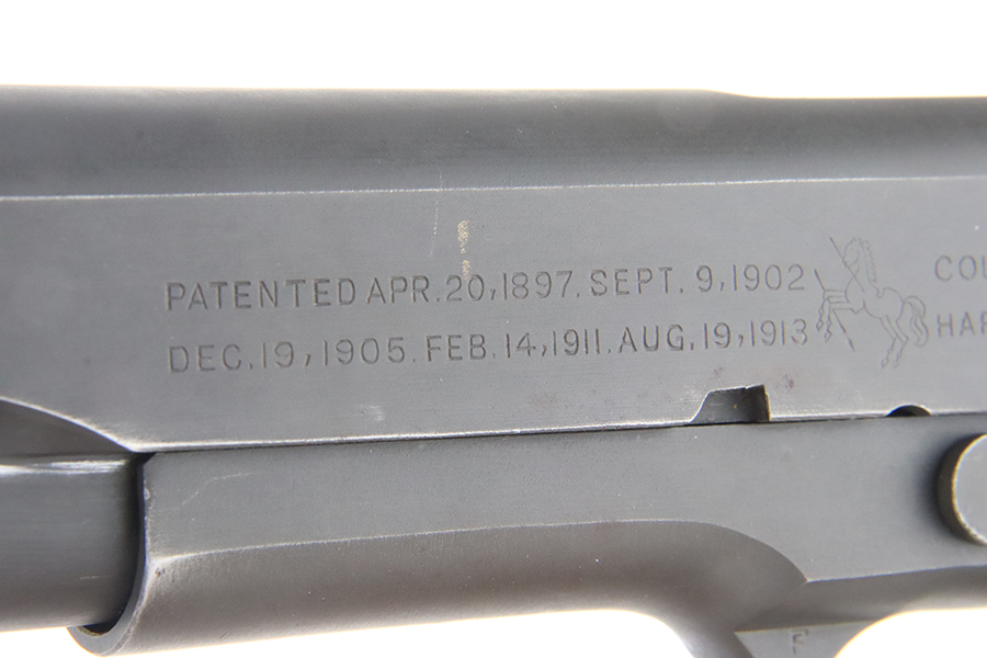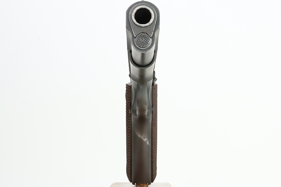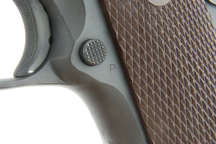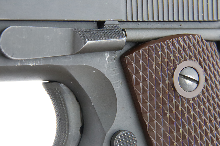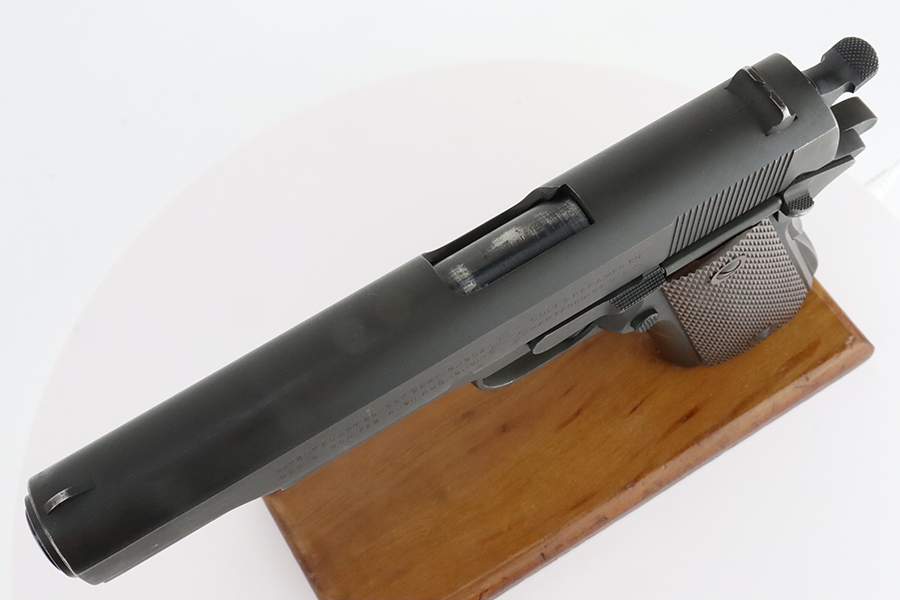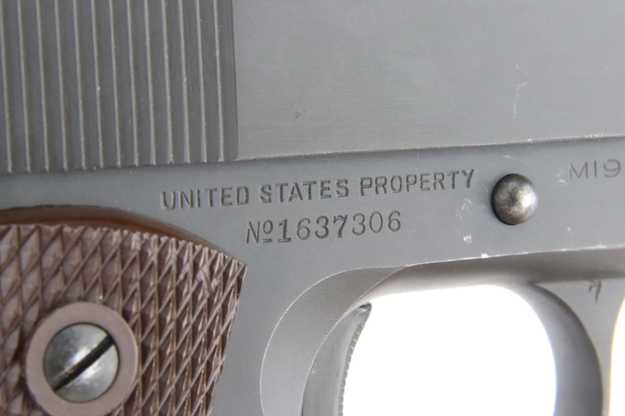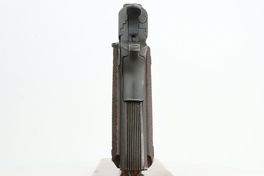 2/9/24 – This is a minty Colt 1911A1, shipped to the Springfield Armory on August 24th, 1944. This pistol is 100% correct and original throughout. Has “GHD” inspection mark of Guy H. Drewry. Has a wide spur type hammer, stamped trigger, and grooved mainspring housing – All correct for this serial number range, somewhat of a transitional period having the wide spur hammer. The frame has the correct “P” proof mark by the magazine release and on the top of the slide. The crossed cannon ordinance wheel stamp is intact on the RH side and was correctly stamped after parkerizing. The original blued Colt barrel is correctly stamped “Colt 45 Auto” under the chamber as well as the “P” proof mark. The barrel also has the correct large “7” stamp in front of the locking lug. The gun has retained about 98% of its parkerized finish, with most wear concentrated to one small area on the front strap. Some very light muzzle wear, and a bit of finish loss along the high edges of the front and underside of the slide, along with some miscellaneous handling marks here and there. Bore is shiny with strong rifling, but there is a bit of frost. Minty, correct Colt grips with sharp checkering and no chips or cracks. Includes one correct M.S. Little magazine, correctly marked “C-L” in the toe.