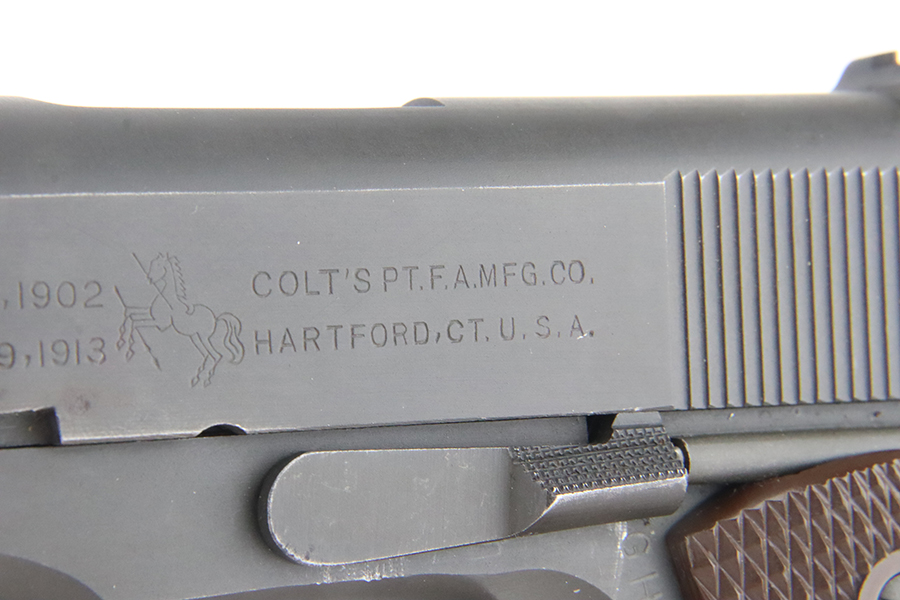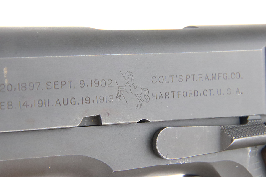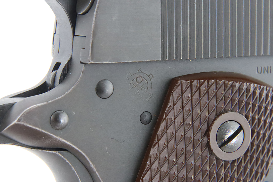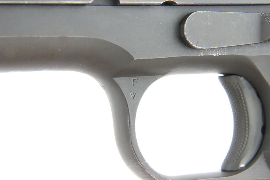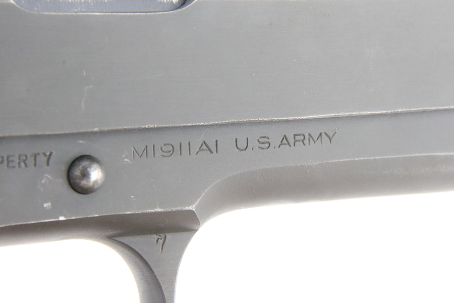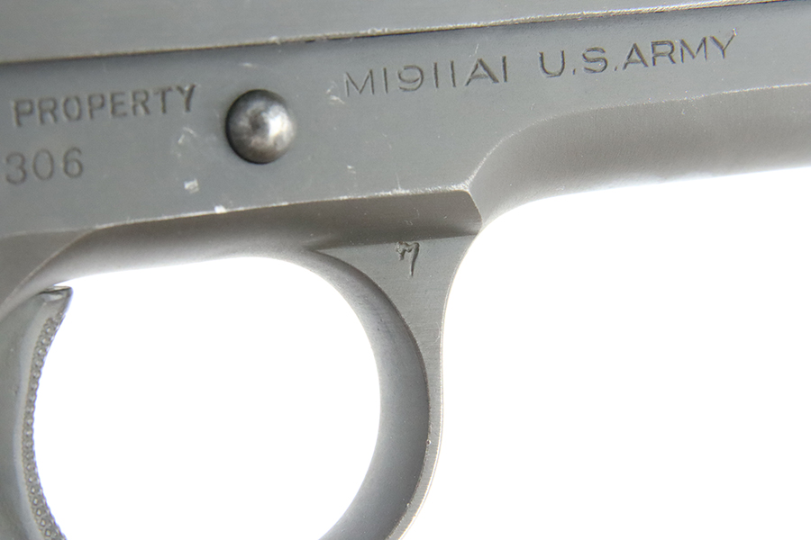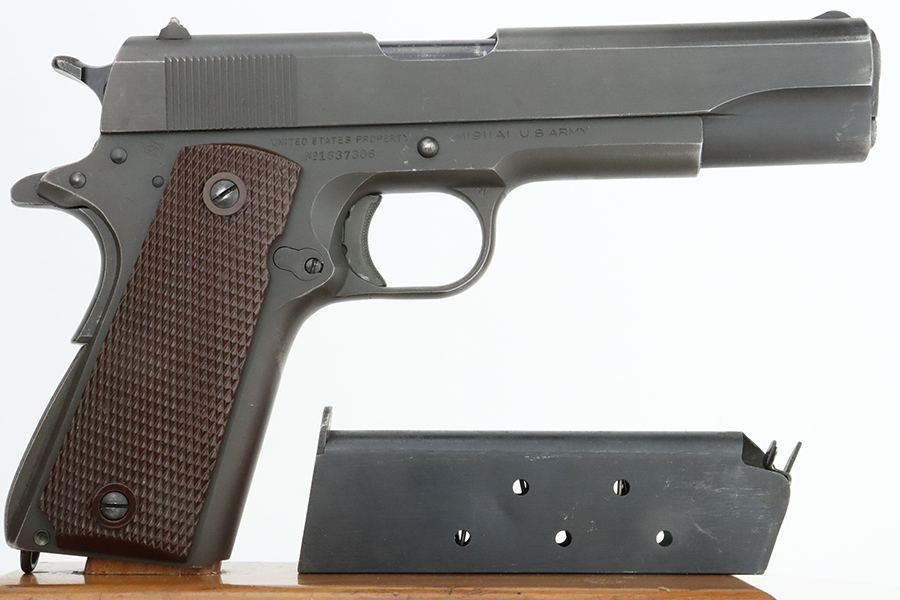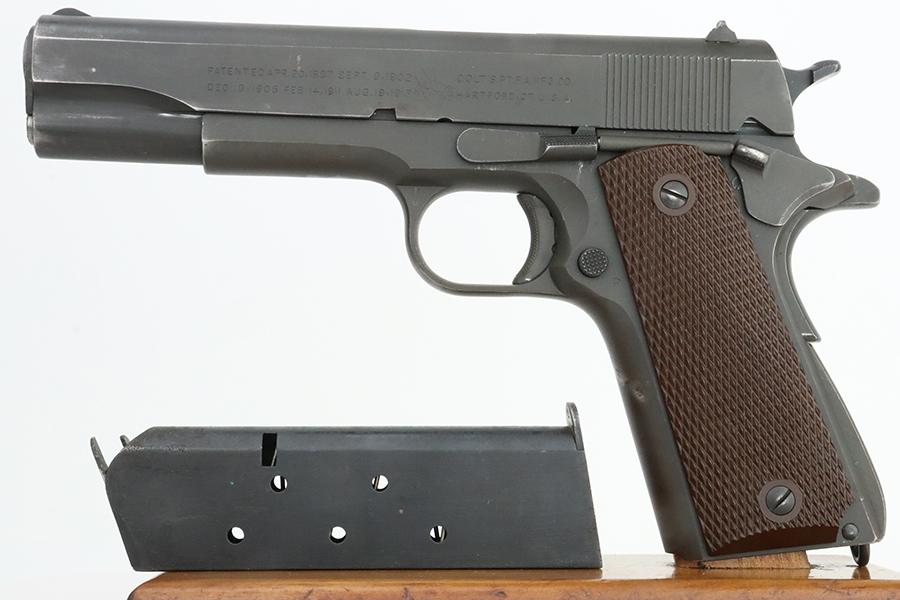 2/9/24 – This is a minty Colt 1911A1, shipped to the Springfield Armory on August 24th, 1944. This pistol is 100% correct and original throughout. Has “GHD” inspection mark of Guy H. Drewry. Has a wide spur type hammer, stamped trigger, and grooved mainspring housing – All correct for this serial number range, somewhat of a transitional period having the wide spur hammer. The frame has the correct “P” proof mark by the magazine release and on the top of the slide. The crossed cannon ordinance wheel stamp is intact on the RH side and was correctly stamped after parkerizing. The original blued Colt barrel is correctly stamped “Colt 45 Auto” under the chamber as well as the “P” proof mark. The barrel also has the correct large “7” stamp in front of the locking lug. The gun has retained about 98% of its parkerized finish, with most wear concentrated to one small area on the front strap. Some very light muzzle wear, and a bit of finish loss along the high edges of the front and underside of the slide, along with some miscellaneous handling marks here and there. Bore is shiny with strong rifling, but there is a bit of frost. Minty, correct Colt grips with sharp checkering and no chips or cracks. Includes one correct M.S. Little magazine, correctly marked “C-L” in the toe.