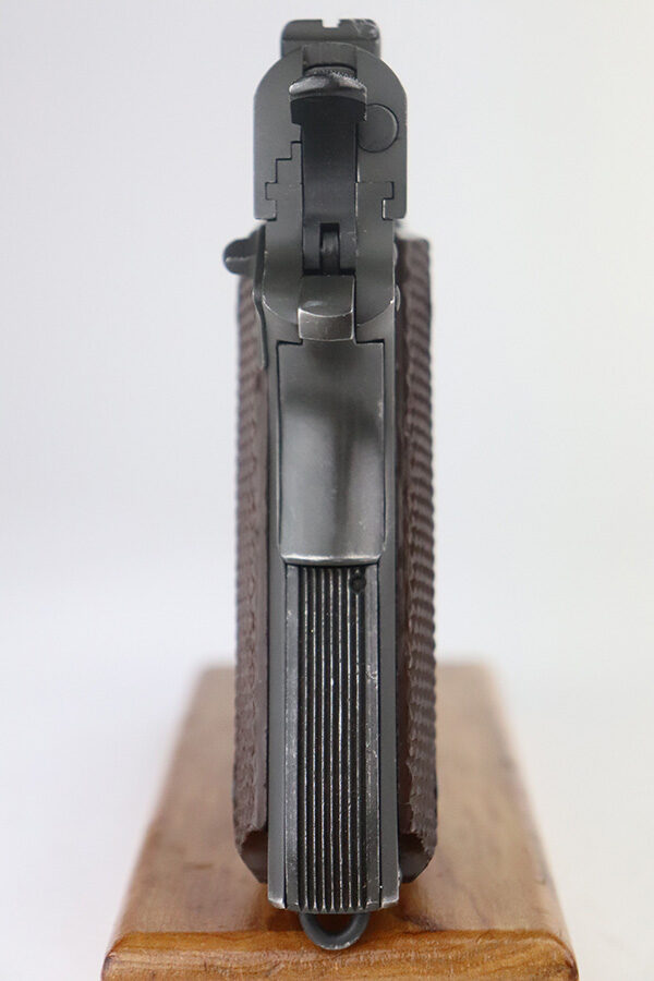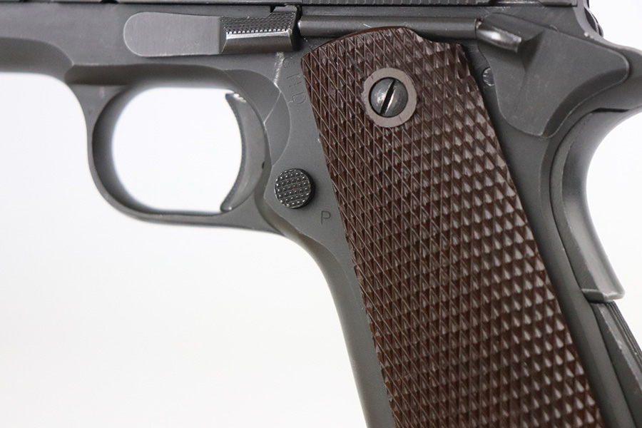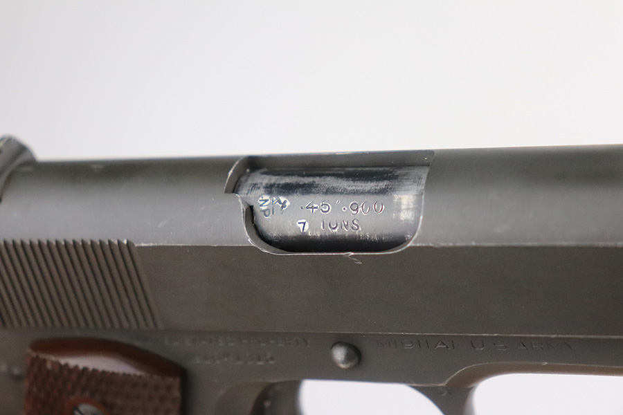 10/26/22 – This is a minty example of a Colt Model 1911A1 that was manufactured in late 1944. As evidenced by the British proofs, this particular gun was part of the British lend-lease program. The gun is all correct, has the proper “GHD” inspector initials, “United States Property” marking, and the cross-canon military cartouche. It has a Colt Auto .45 barrel. It has retained about 97% of its parkerized finish. There is minor thinning on the front strap and around the high edges. A few small dings here and there, most noticeable on the front strap. Comes with excellent grips and a period-correct magazine. The bore is excellent with good rifling.