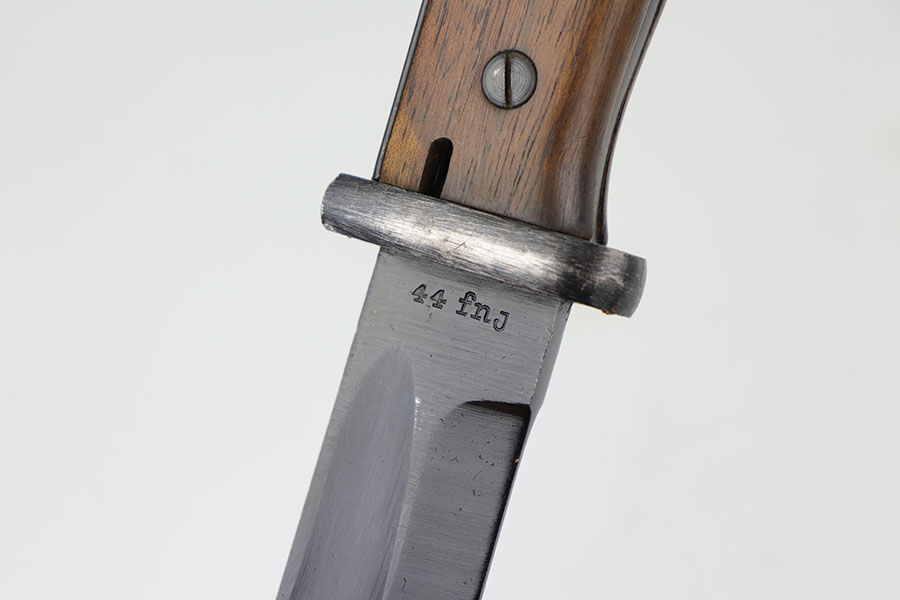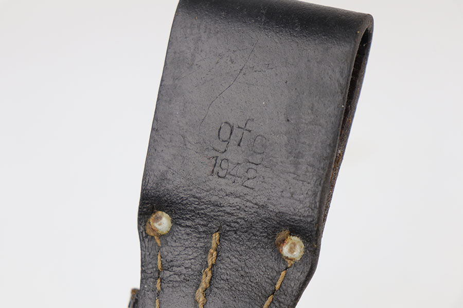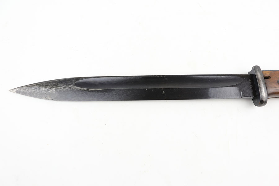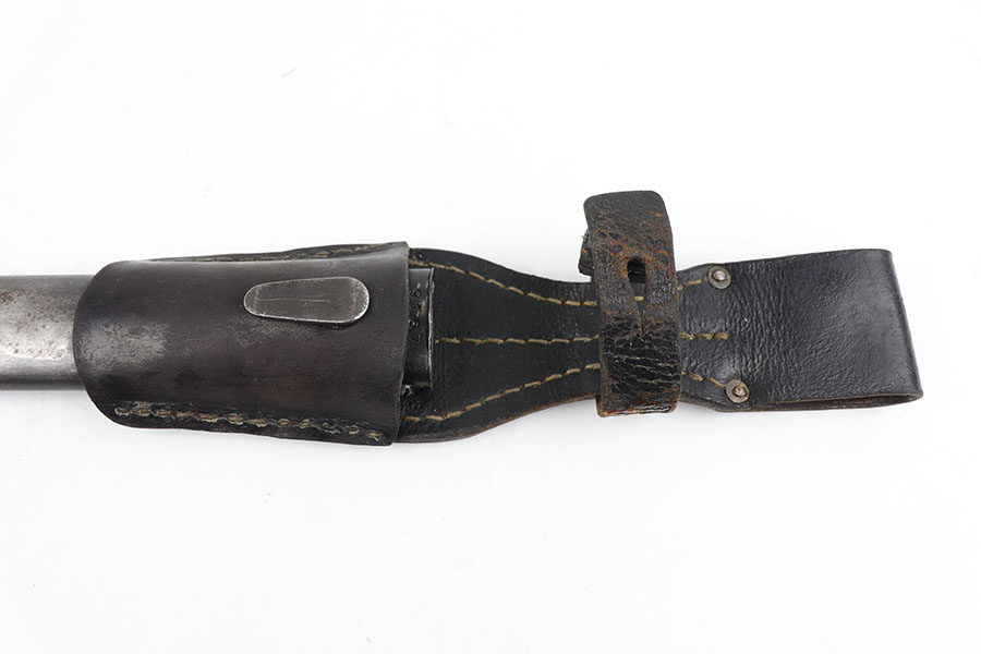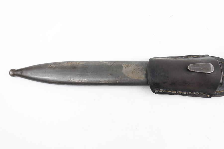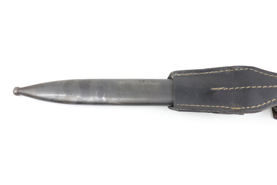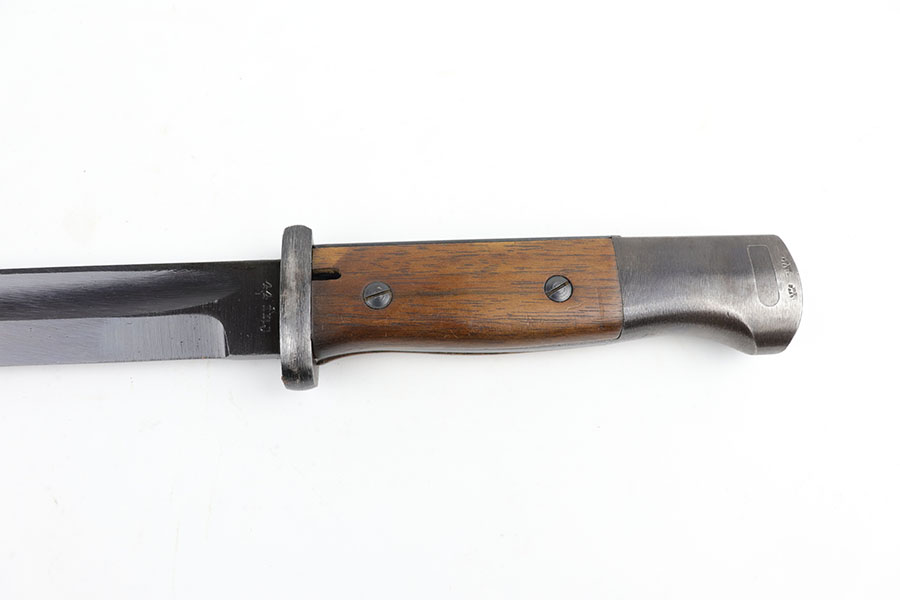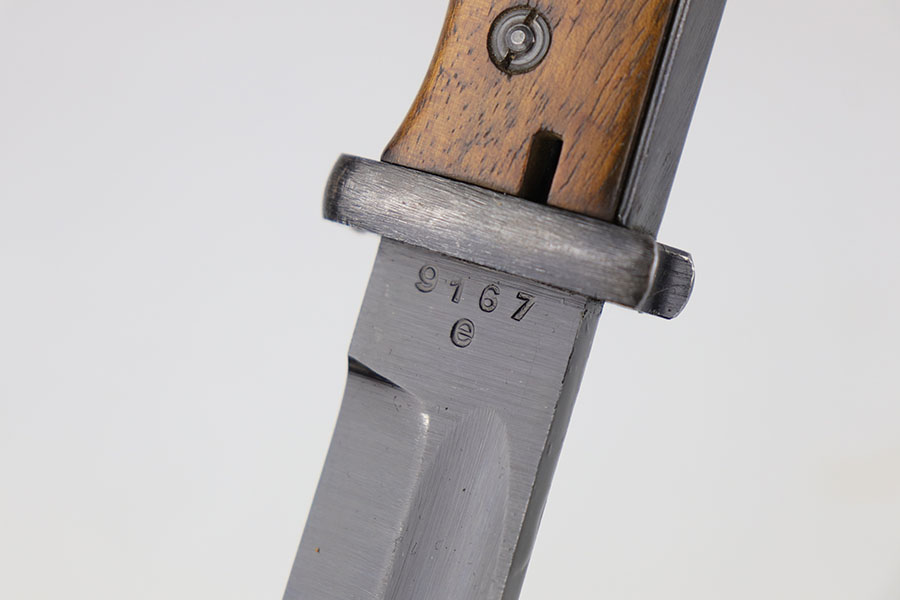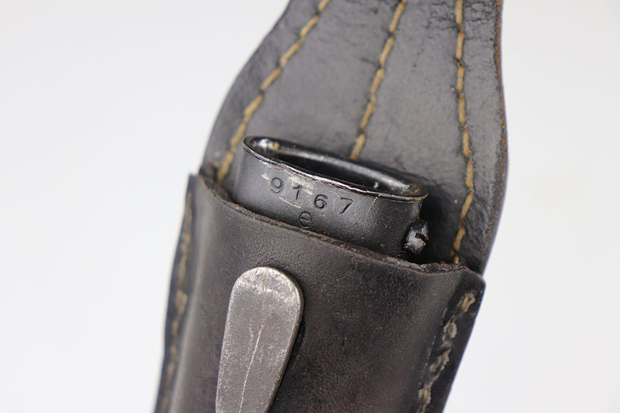 5/29/20 – This is a near-mint Nazi K98 bayonet from 1944 with ‘fnj’ maker mark and WaA519 proofs. The bayonet and scabbard are matching numbers (9167e). The bayonet blade almost is in mint condition with only a very small amount of finish loss closer to the point. There is light patina and surface wear throughout the pommel and upper area of the handle. The scabbard has a black leather frog that is ‘gfg’ maker marked and 1942 dated. Scabbard finish shows some wear but no major defect, and tip is waffen stamped.