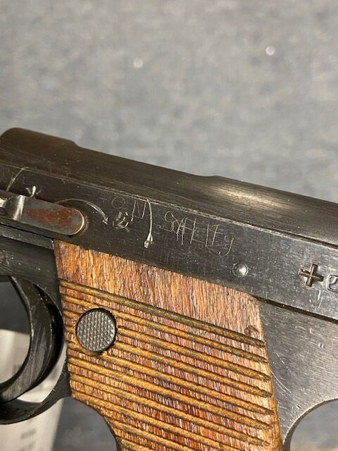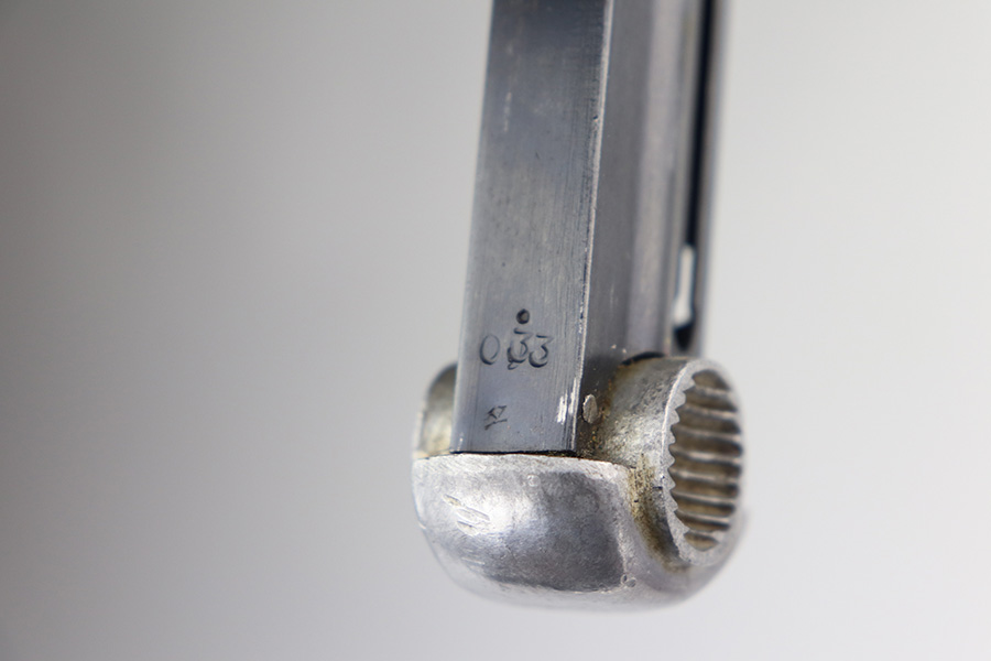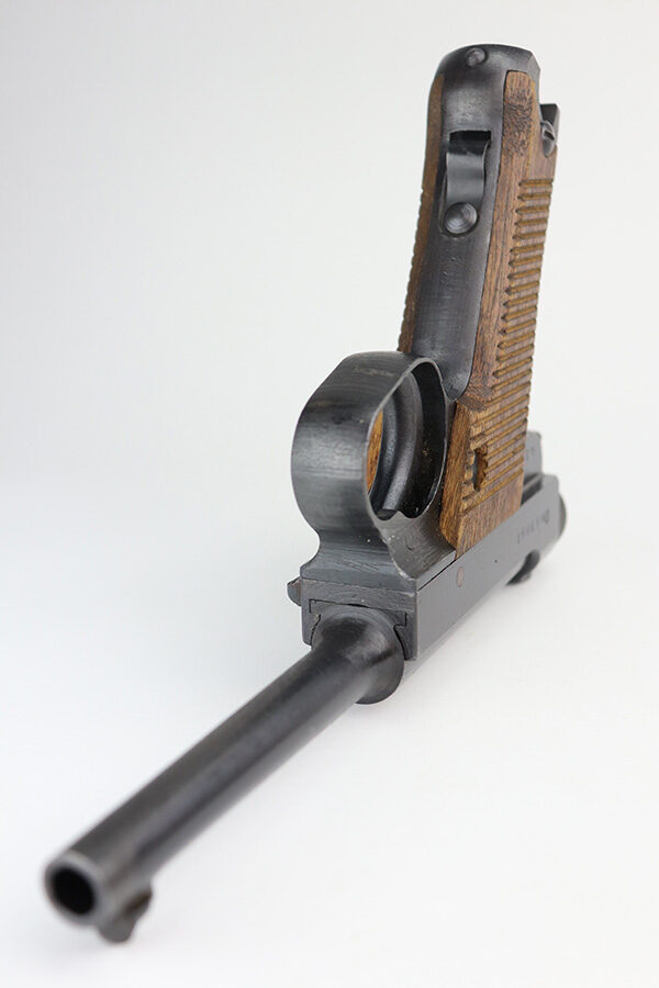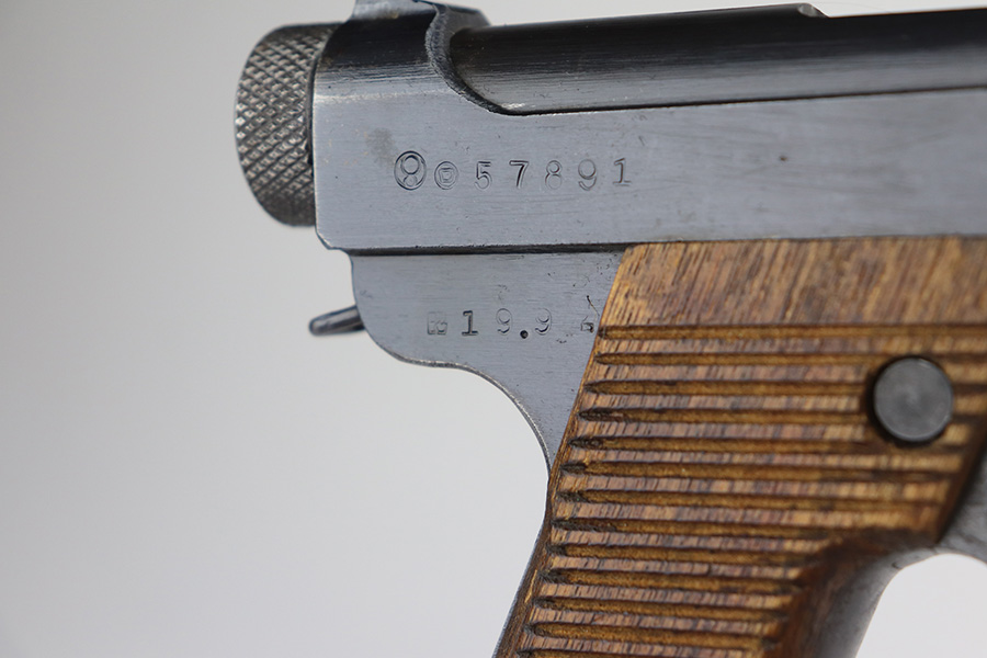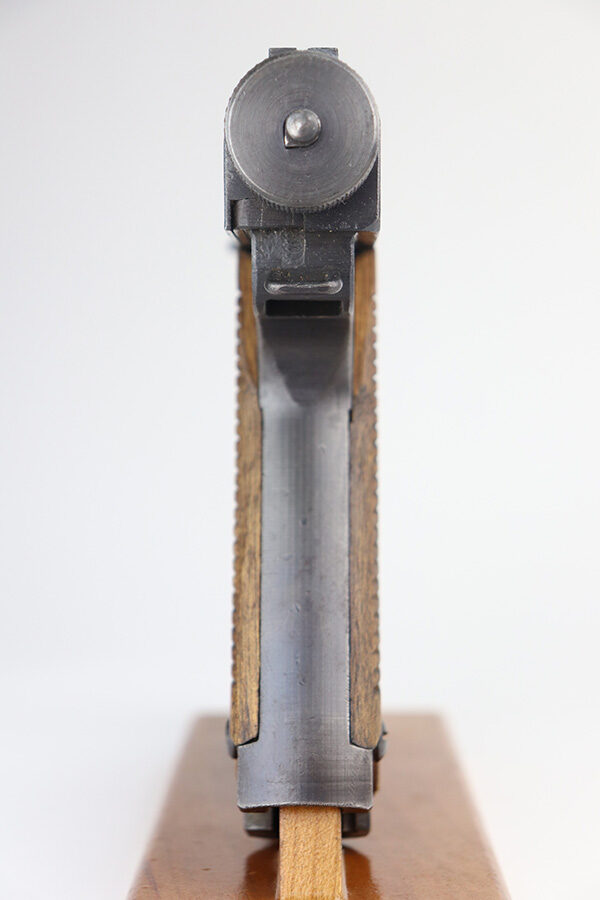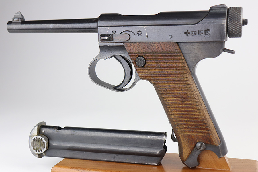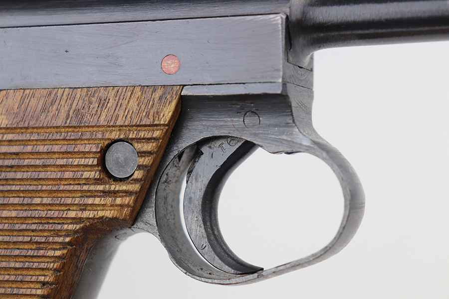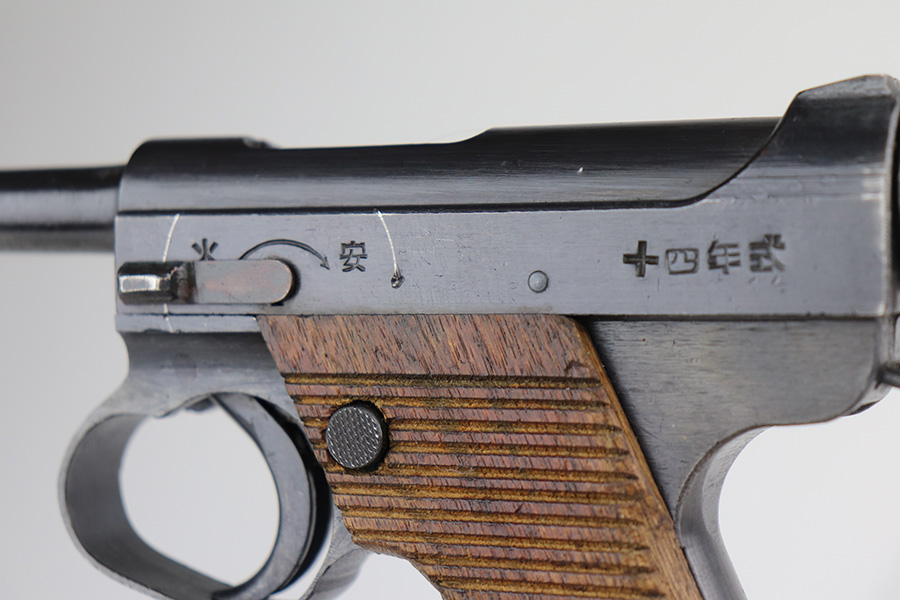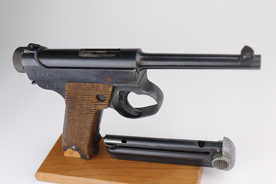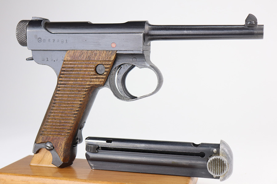 6/22/21 – This is near-mint example of a Nambu Type 14 issued to the Japanese military in September of 1944. The gun is all matching and has retained more than 98% of its original finish. The faintest sign of thinning on the straps and hints of wear on some of the high edges. Unfortunately, someone lightly scratched the words “FIRE ON SAFETY” next to the safety lever. Comes with very nice matching grips and a period-correct mismatched magazine. Factory-new bore. The mag does not lock up into the gun. It doesn’t fall out though as it friction-fits into the gun. And the slide does lock back.