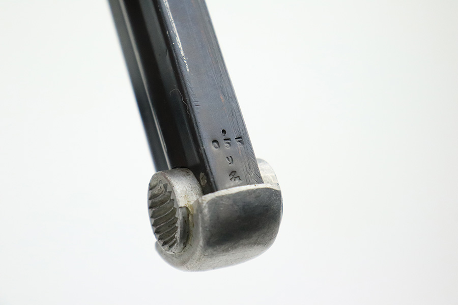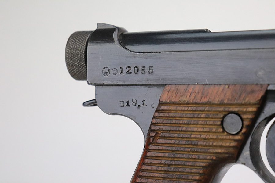 8/11/22 – This is a near-mint example of a Nambu Type 14 issued to the Japanese military in January of 1944. The gun is all matching and comes with an original matching-numbered magazine. It has retained virtually all of its original bluing with just a few tiny scratches on both sides of the frame. Comes with mint matching-numbered wood grips. The bore is stone-mint.