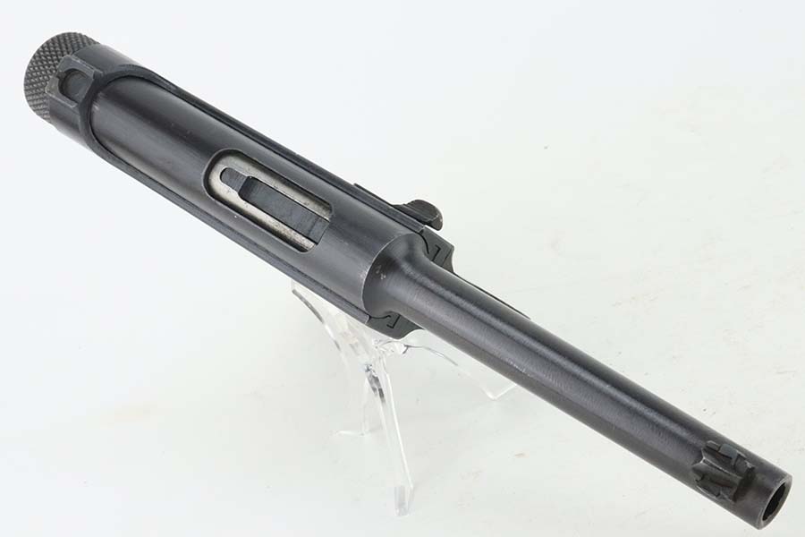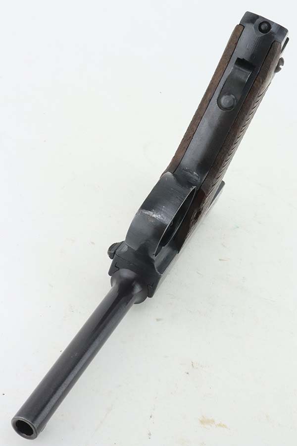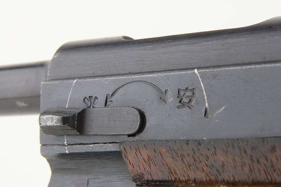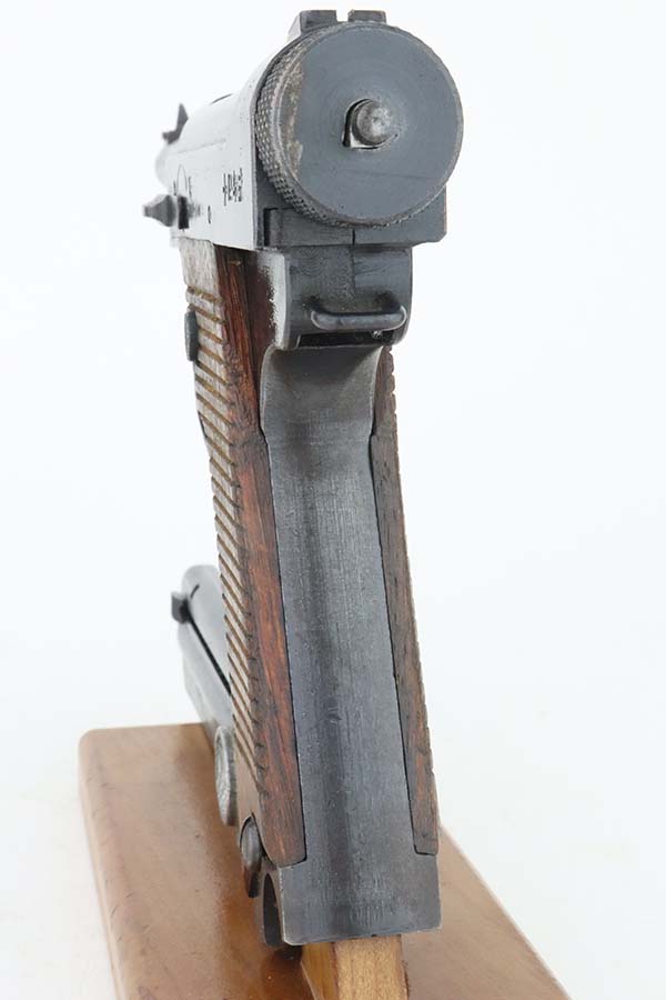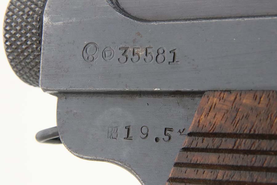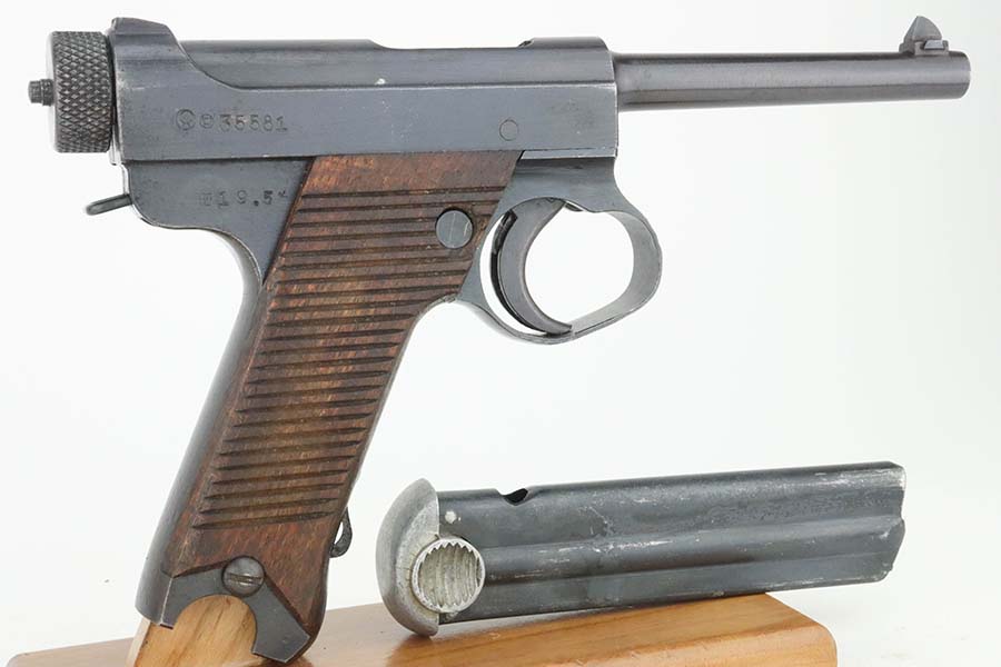 3/28/24 – This is a near-mint example of a Nambu Type 14 issued to the Japanese military in May of 1944. All matching and comes with an original matching-numbered magazine. There is almost no actual finish loss, just a few light surface scratches on the right side of the slide. Stone-mint bore. Fitted with mint matching-numbered wood grips.