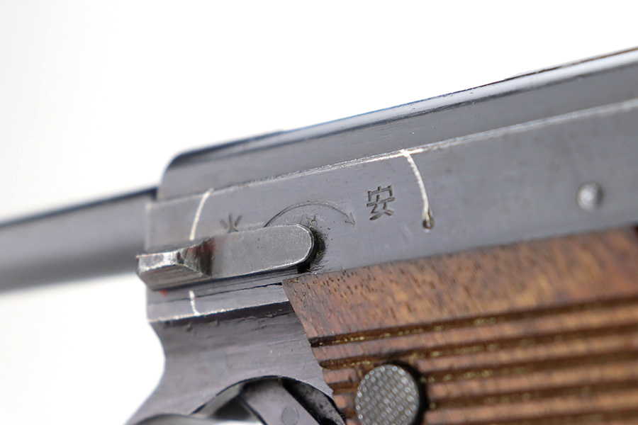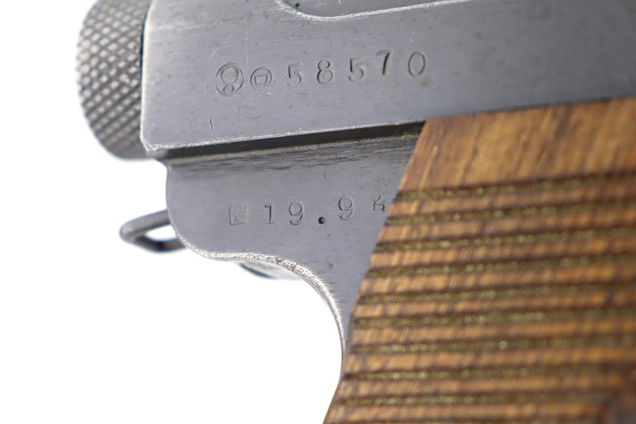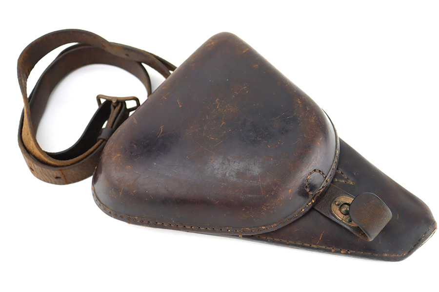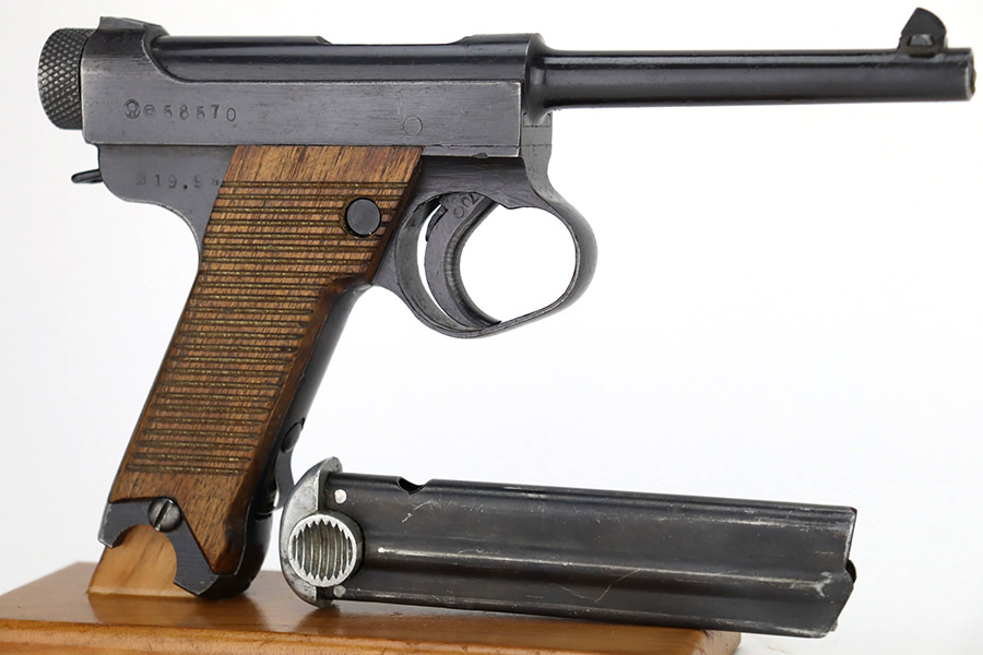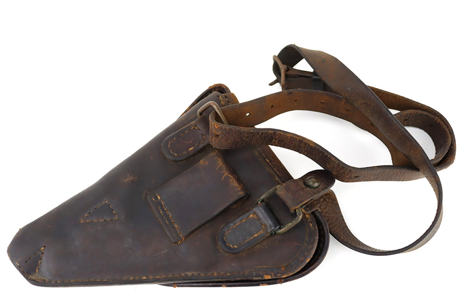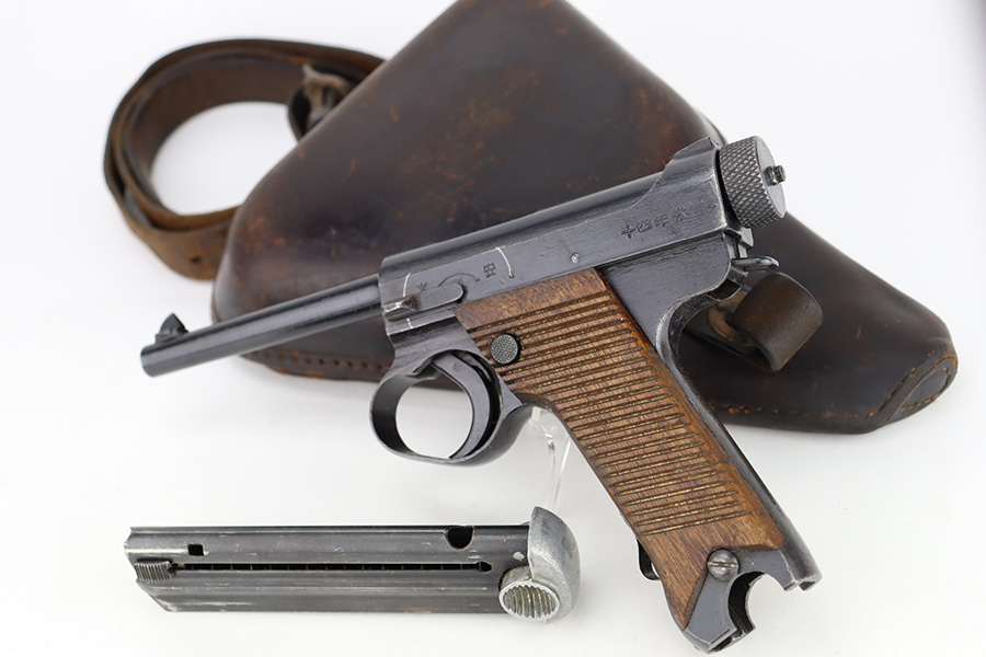 1/1/24 – This is a minty example of a Nambu Type 14 issued to the Japanese military in September of 1944. It is all matching and comes as a rig with one original matching-numbered magazine and a leather clam shell shoulder holster. Much of the stitching for the top strap is missing. The gun has retained nearly all of its original finish with just hints of thinning on the grip straps and a series of tiny dings on the back strap. Mint bore.