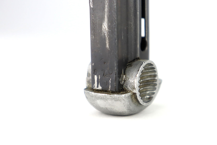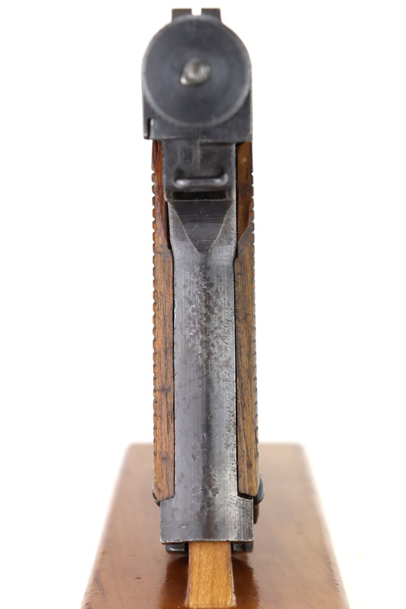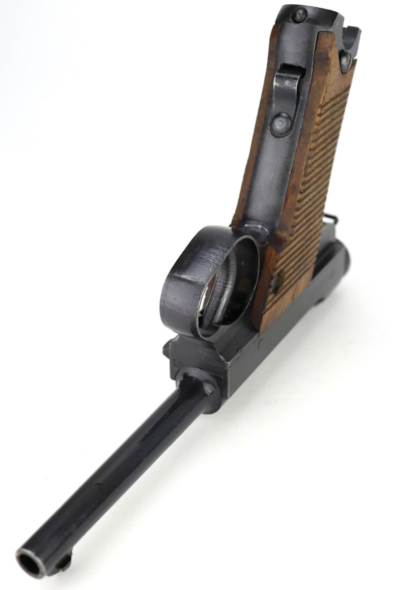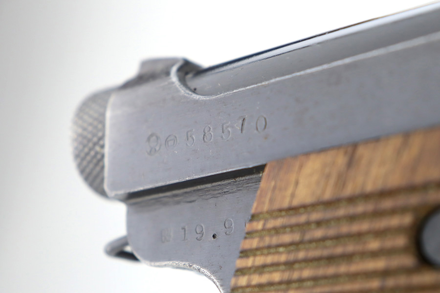 1/1/24 – This is a minty example of a Nambu Type 14 issued to the Japanese military in September of 1944. It is all matching and comes as a rig with one original matching-numbered magazine and a leather clam shell shoulder holster. Much of the stitching for the top strap is missing. The gun has retained nearly all of its original finish with just hints of thinning on the grip straps and a series of tiny dings on the back strap. Mint bore.