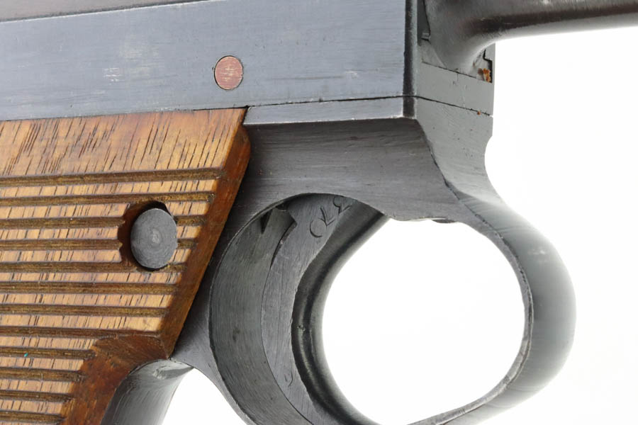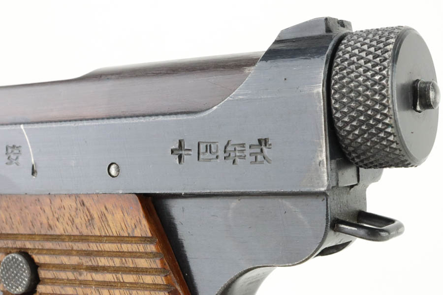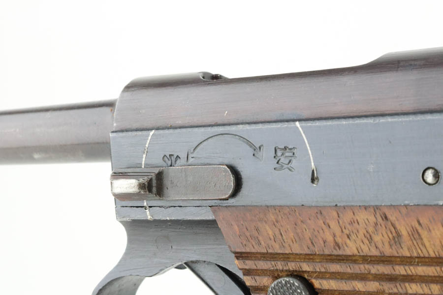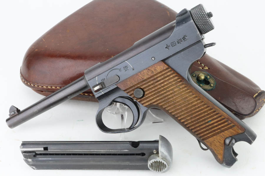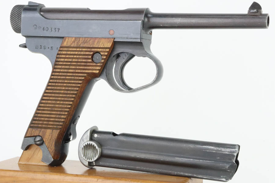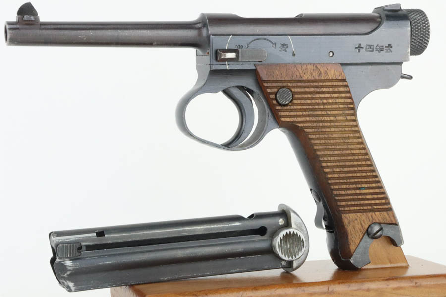 6/4/24 – This is a near-mint example of Nambu Type 14 issued to the Japanese military in May of 1944. It is all matching and comes as a rig with an excellent period-correct holster, spare firing pin, and one original matching-numbered magazine. The gun has retained nearly all of its original finish with just hints of high edge wear and a few tiny spots of wear on the barrel. Minty matching-numbered wood grips. Mint bore.