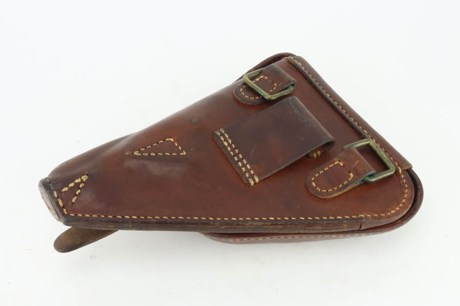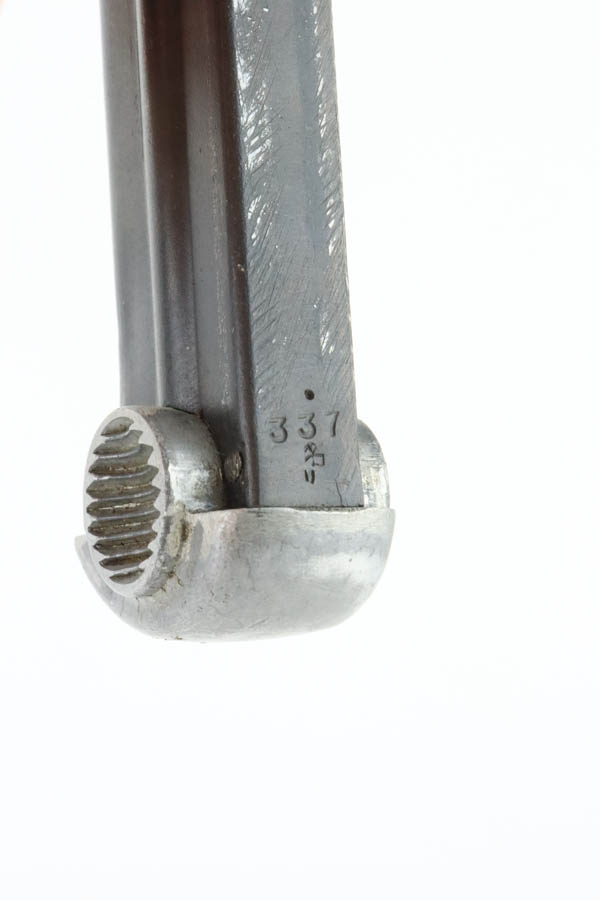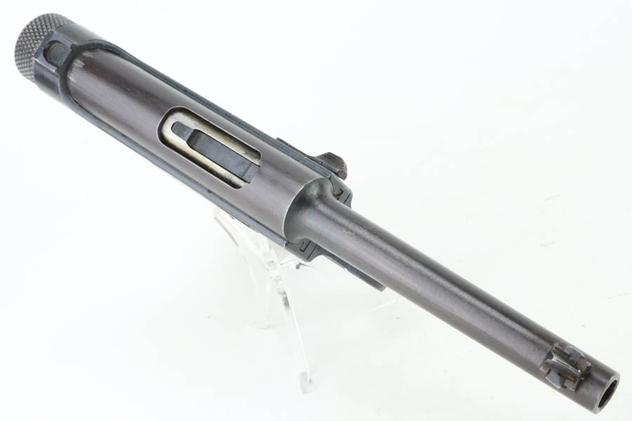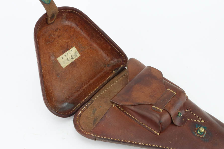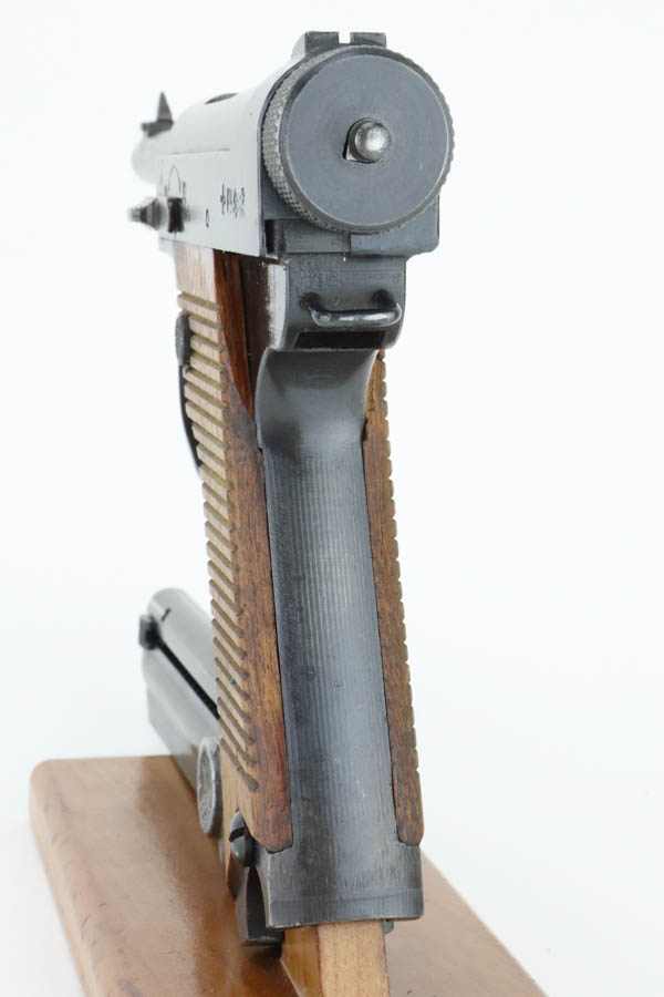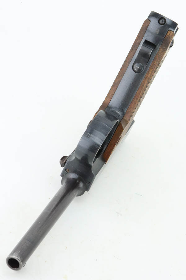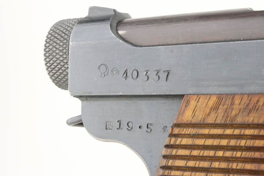 6/4/24 – This is a near-mint example of Nambu Type 14 issued to the Japanese military in May of 1944. It is all matching and comes as a rig with an excellent period-correct holster, spare firing pin, and one original matching-numbered magazine. The gun has retained nearly all of its original finish with just hints of high edge wear and a few tiny spots of wear on the barrel. Minty matching-numbered wood grips. Mint bore.