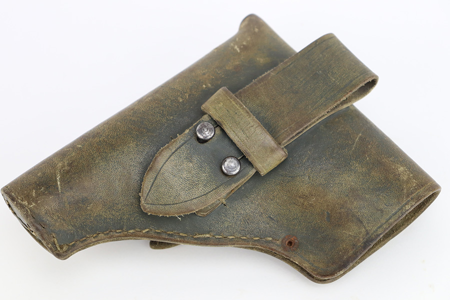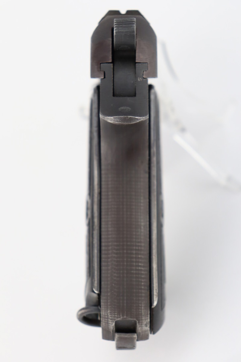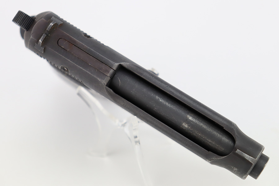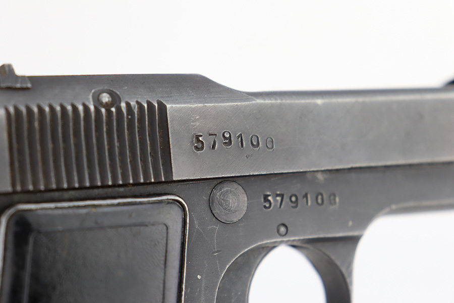 1/1/24 – This is a minty Beretta Model 1935, manufactured in 1944 and chambered in 7.65mm. All matching with a “4UT” marking on the tang, indicating it was issued to the Nazi military. Comes as a rig with a period-correct green leather holster and two magazines. Its wartime finish rates about 97% with general high edge wear. Fitted with period-correct black bakelite grips. Minty bore.