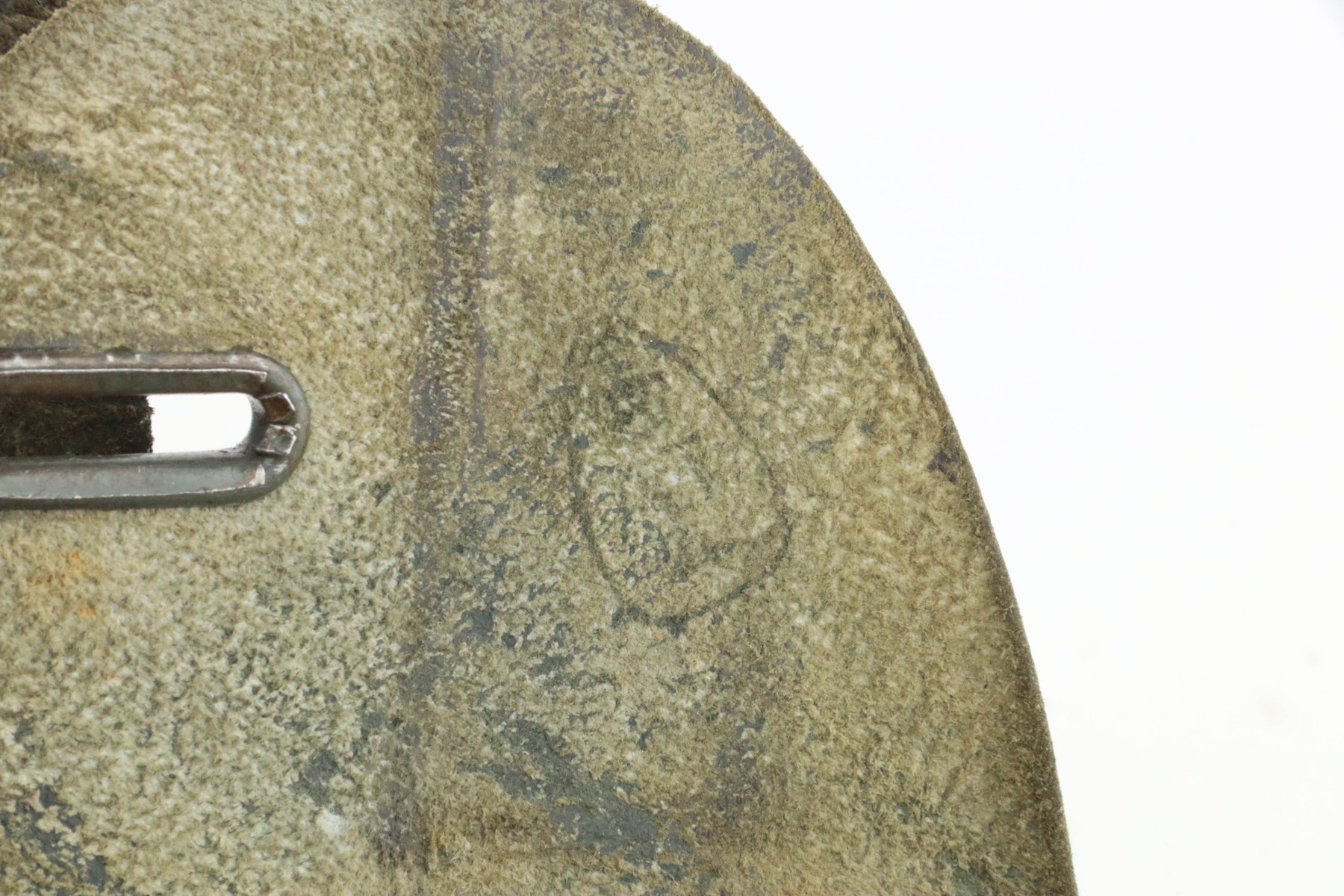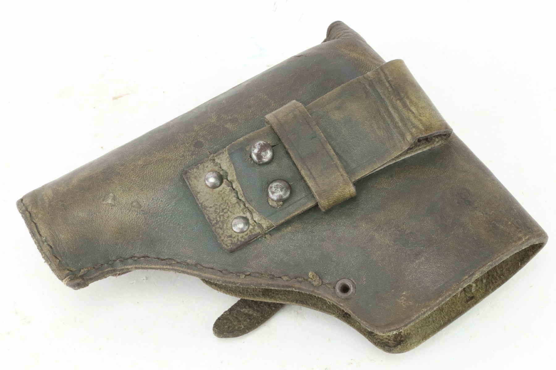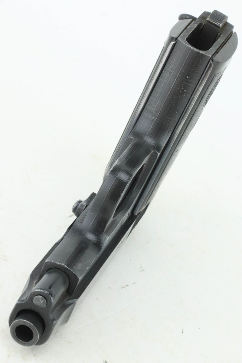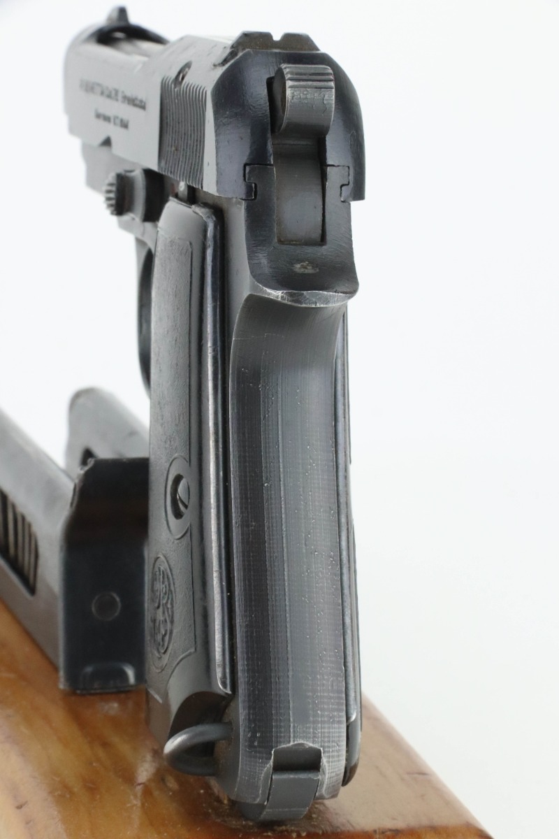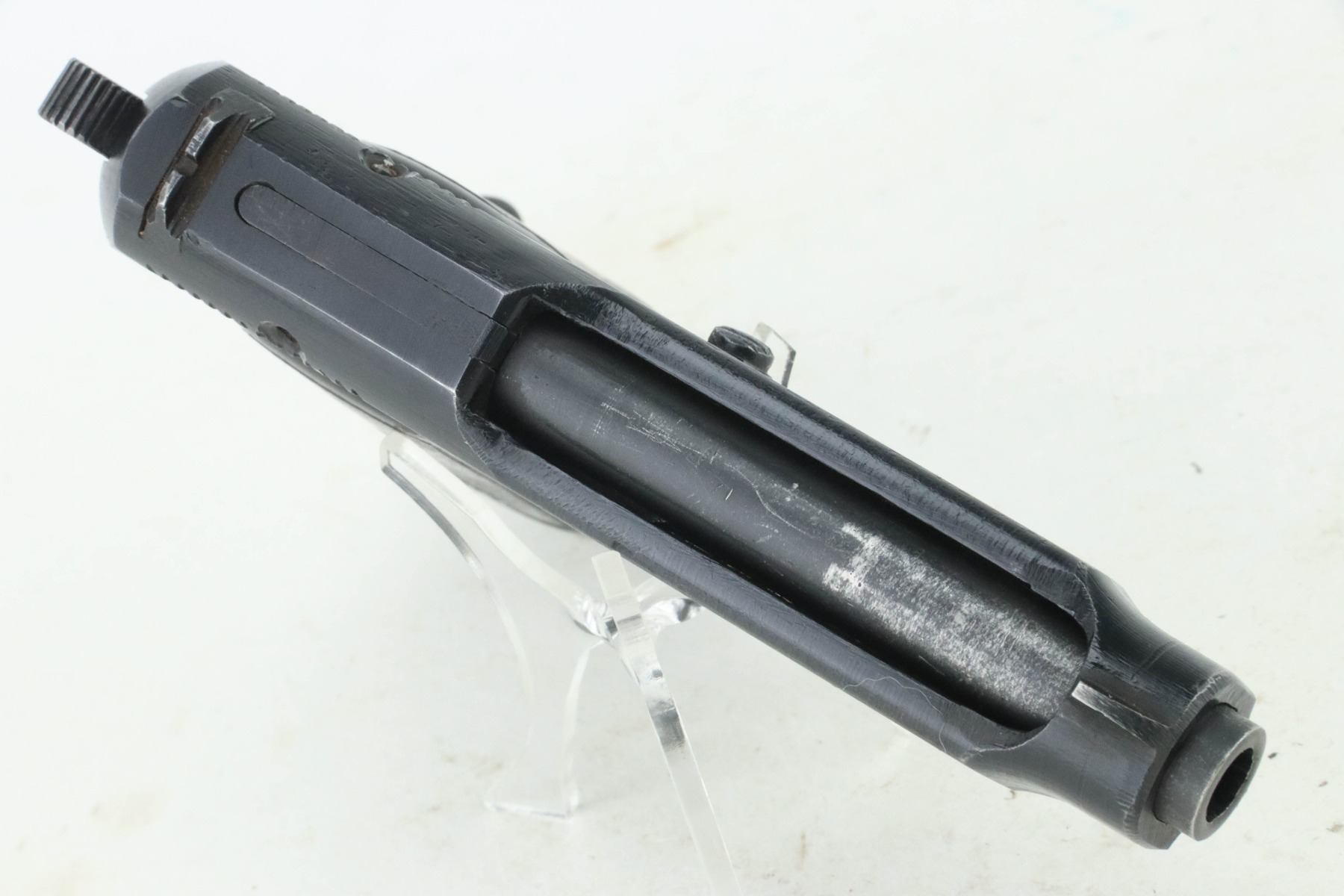 9/5/24 – This is a minty Beretta Model 1935, manufactured in 1944 and chambered in 7.65mm. All matching with a “4UT” marking on the tang, indicating it was issued to the Nazi military. Comes as a rig with a period-correct green leather holster (replaced magazine pouch) and two magazines. Its wartime finish rates about 98-99% with just very minor high edge wear. Fitted with period-correct black bakelite grips. Mint bore.