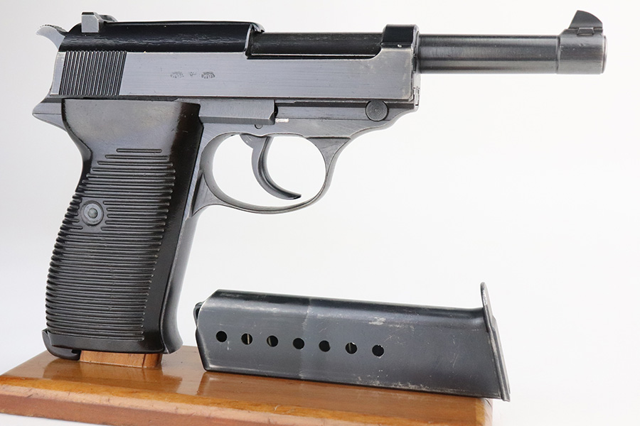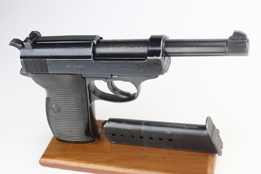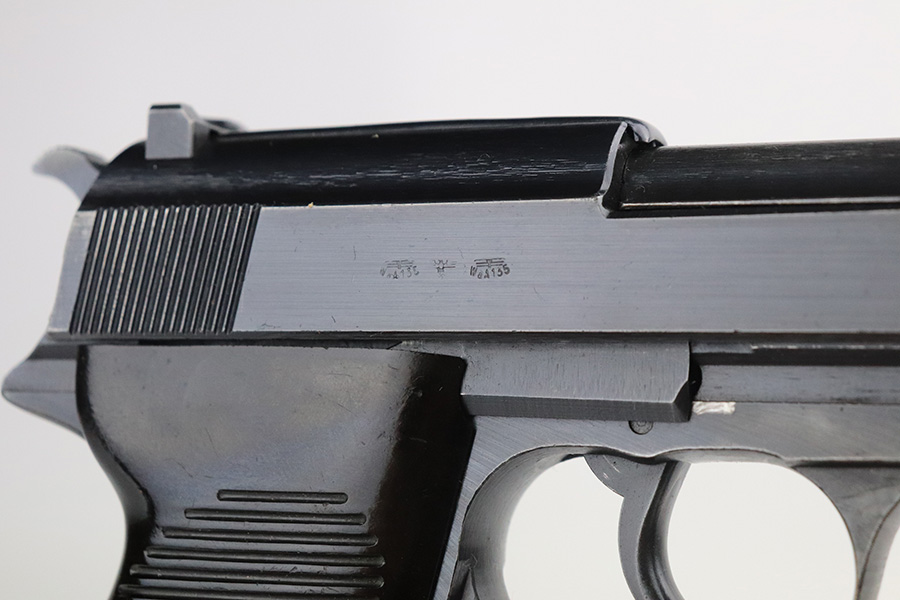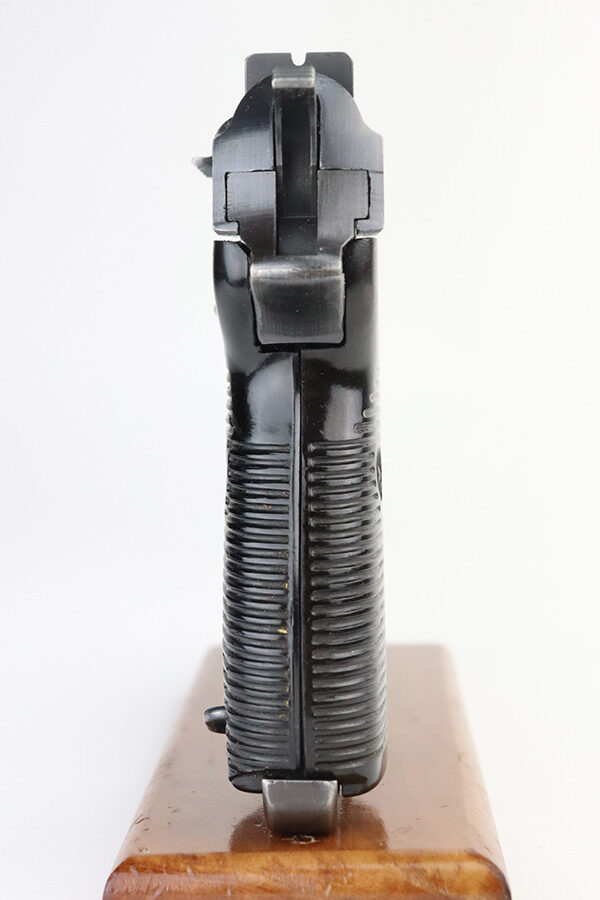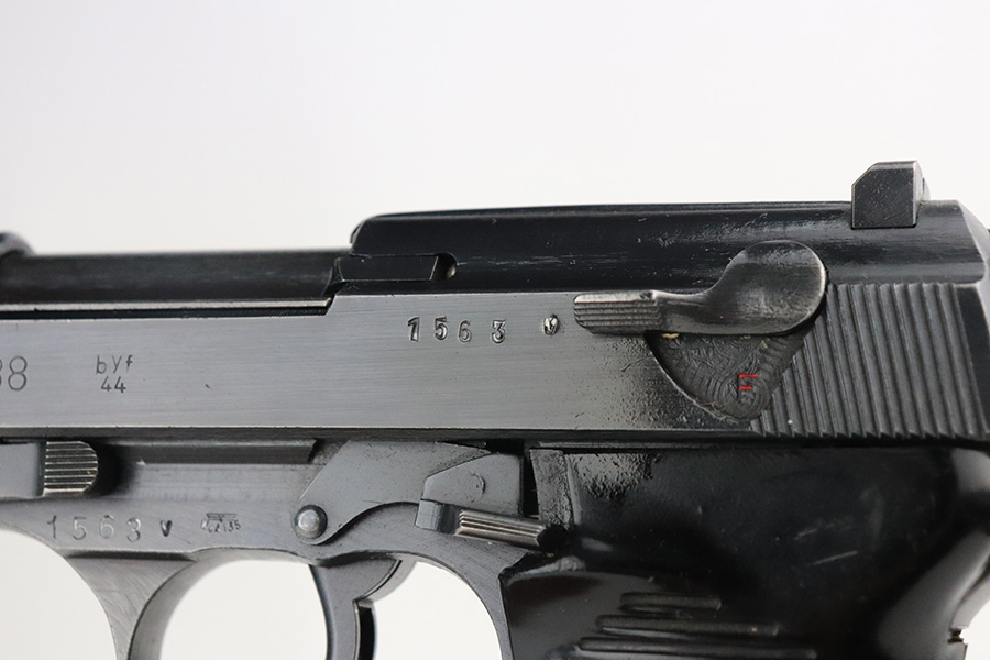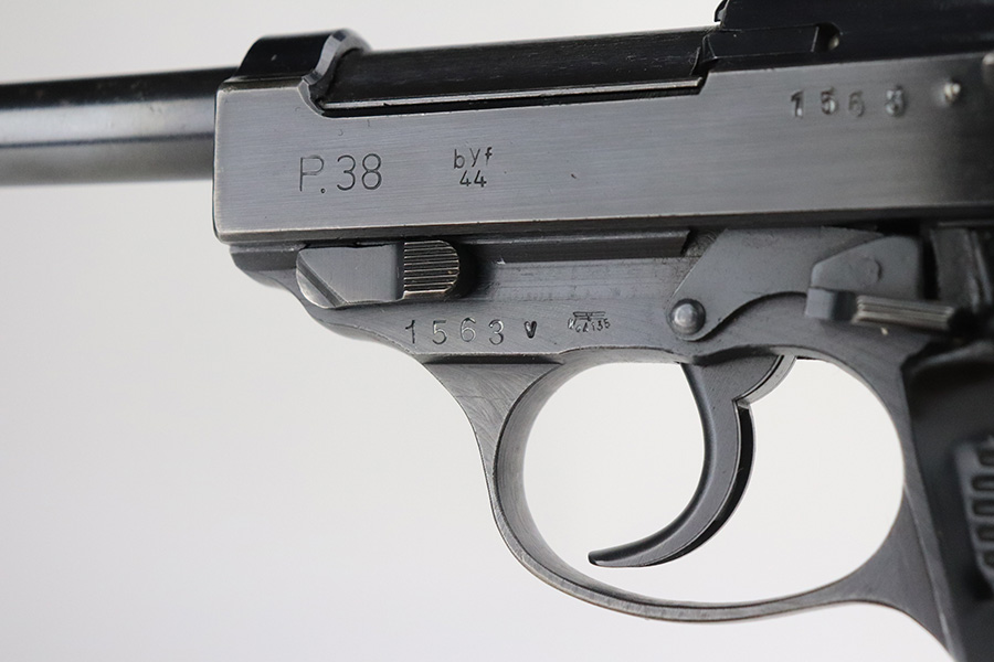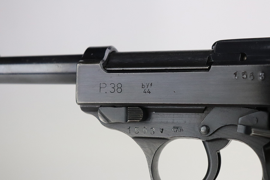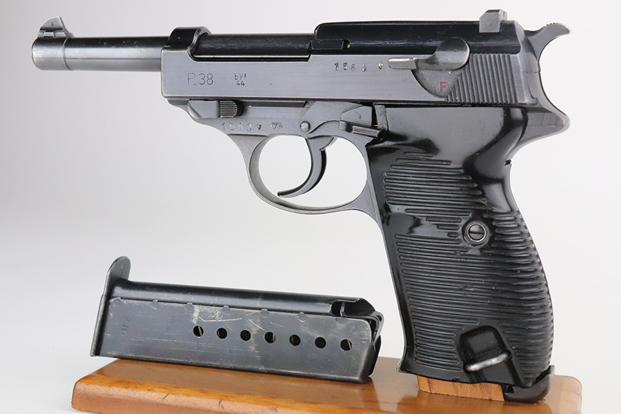 8/2/21 – This is a minty example of a Mauser P.38 issued to the Nazi military in 1944. It is all matching and has the proper “Waffen 135” military proofs. It has retained about 98% of its original finish. There is very minor wear on the top of the barrel through the ejection port and hints of wear on the front edges of the slide, on the front strap, and around the muzzle. Some small dots of minor discoloration on the barrel. Comes with nice grips (some minor scuffs) and a period-correct Mauser magazine. Minty bore. De-cocker is functional.