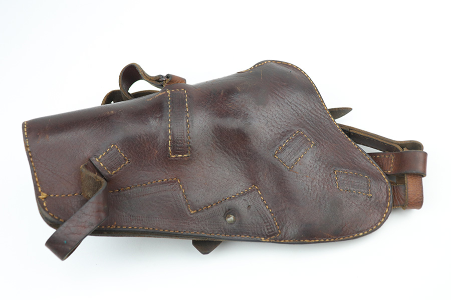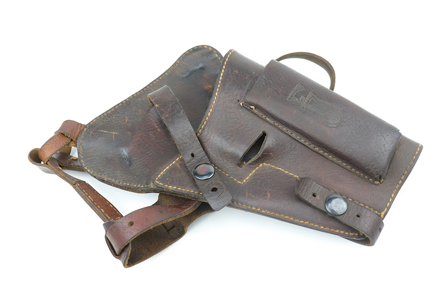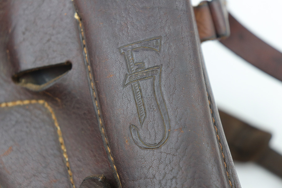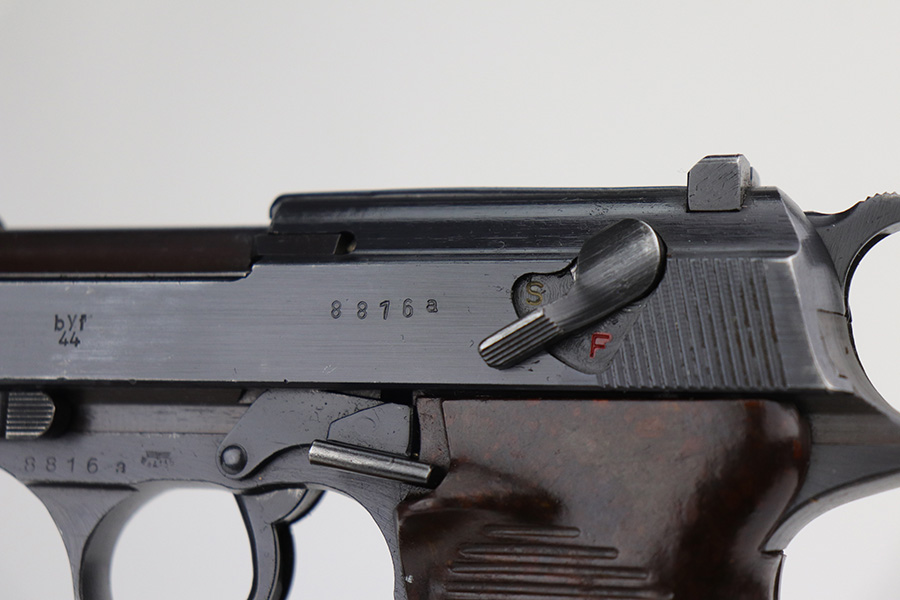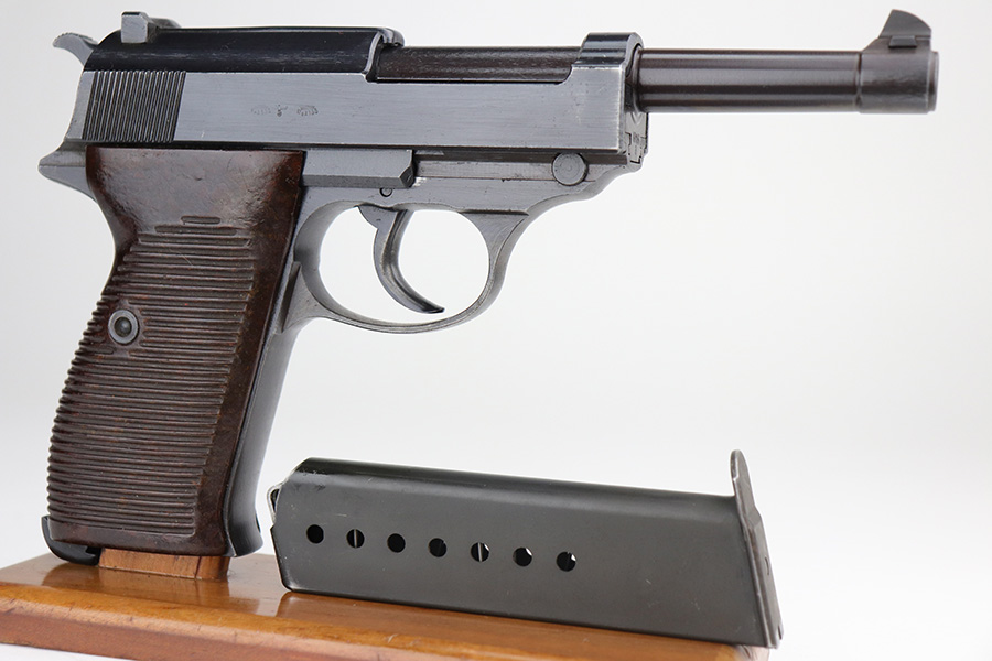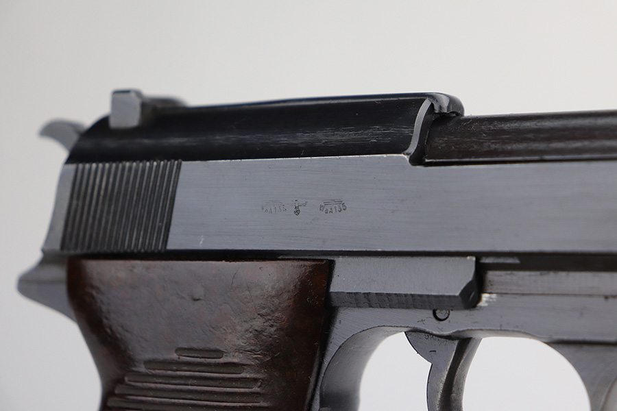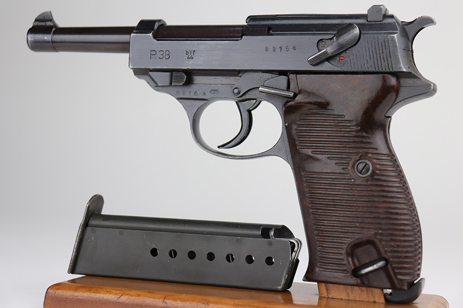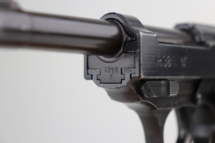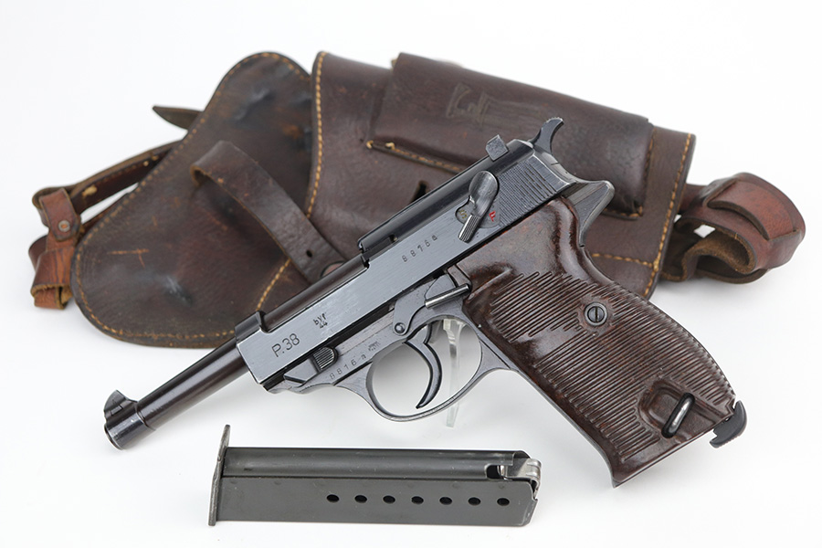 10/20/21 – This is a minty example of a Mauser P.38 issued to the Nazi military in 1944. It is all matching and has the proper “Waffen 135” Nazi military acceptance proofs. It comes as a rig with a post-war Walther P1 magazine and a nice brown leather shoulder holster with the initials “JF” on the mag pouch. The gun has retained about 97% of its finish. There is just a hint of thinning on the front strap and very minor wear on the very front edges of the slide and around the muzzle. A few very light scratches and one dot of discoloration on the right side of the slide. Comes with excellent period-correct reddish grips. The bore is near-mint. De-cocker is functional.