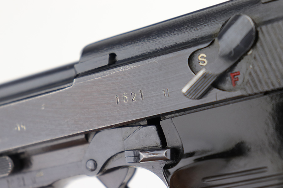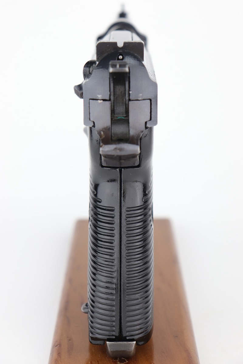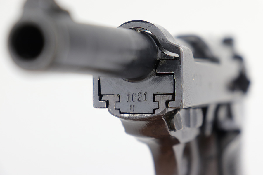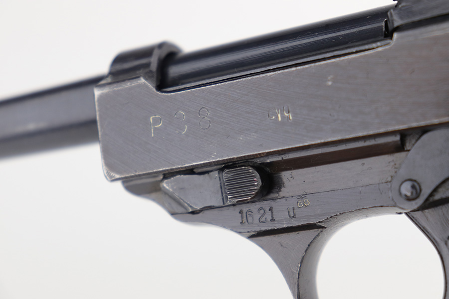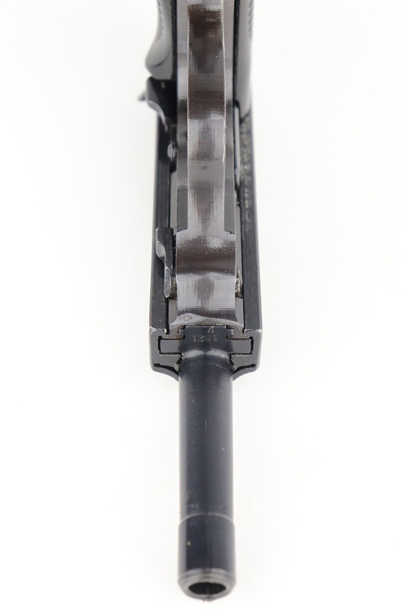 1/13/23 – This is a minty example of a Spreewerk P.38 issued to the Nazi military in September of 1944. It is all matching and has the proper “Eagle 88” military acceptance proofs throughout. It has retained around 98% of its finish. There are just hints of wear around some of the high edges and a hint of thinning on the front strap. Fitted with very nice black bakelite grips and comes with a period-correct jvd magazine. Factory-new bore. De-cocker is functional.