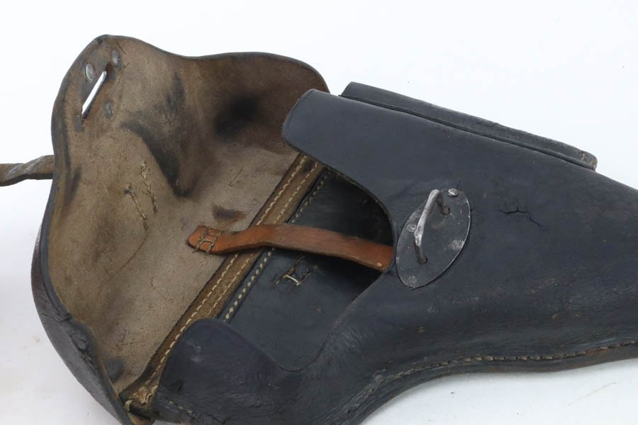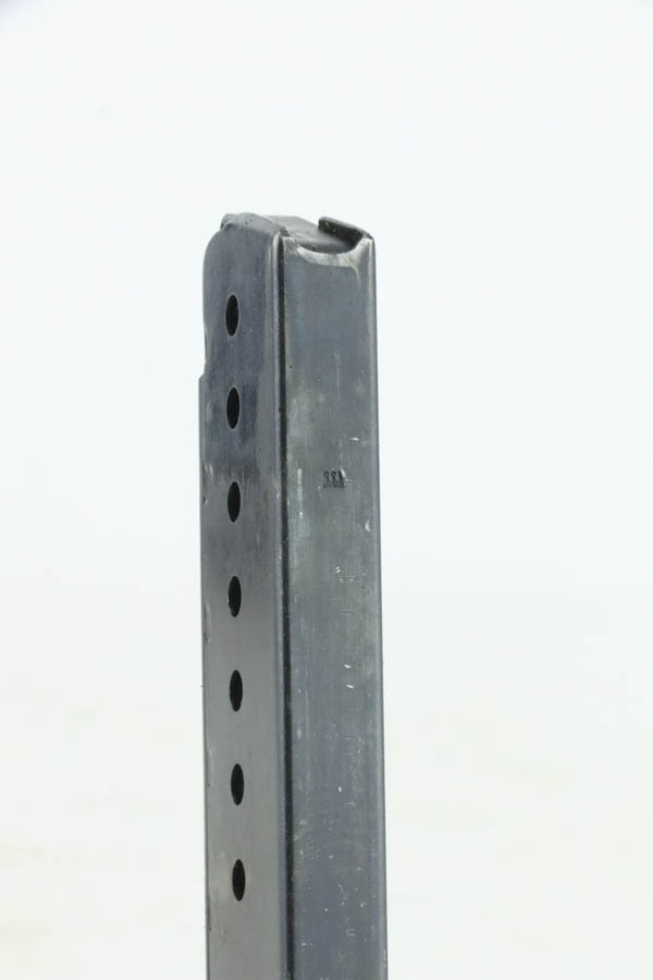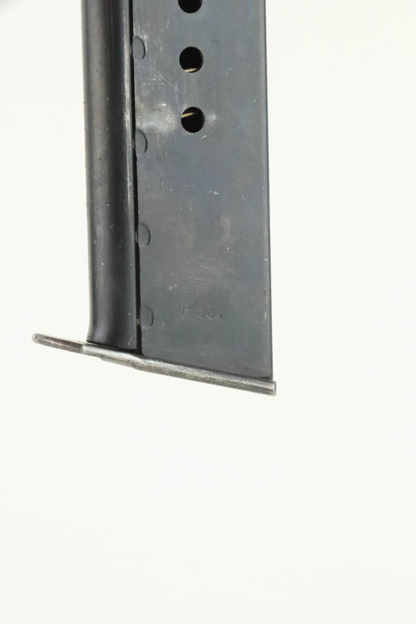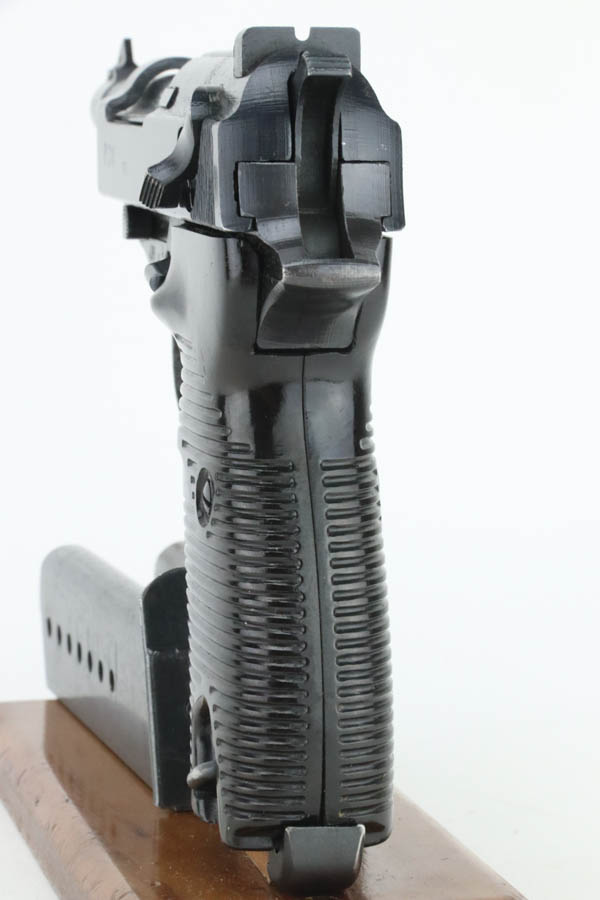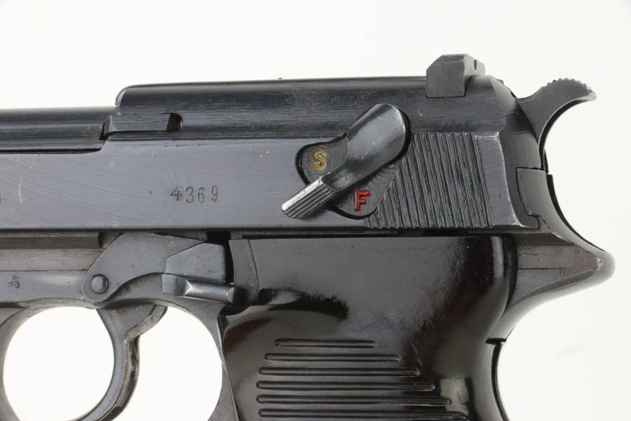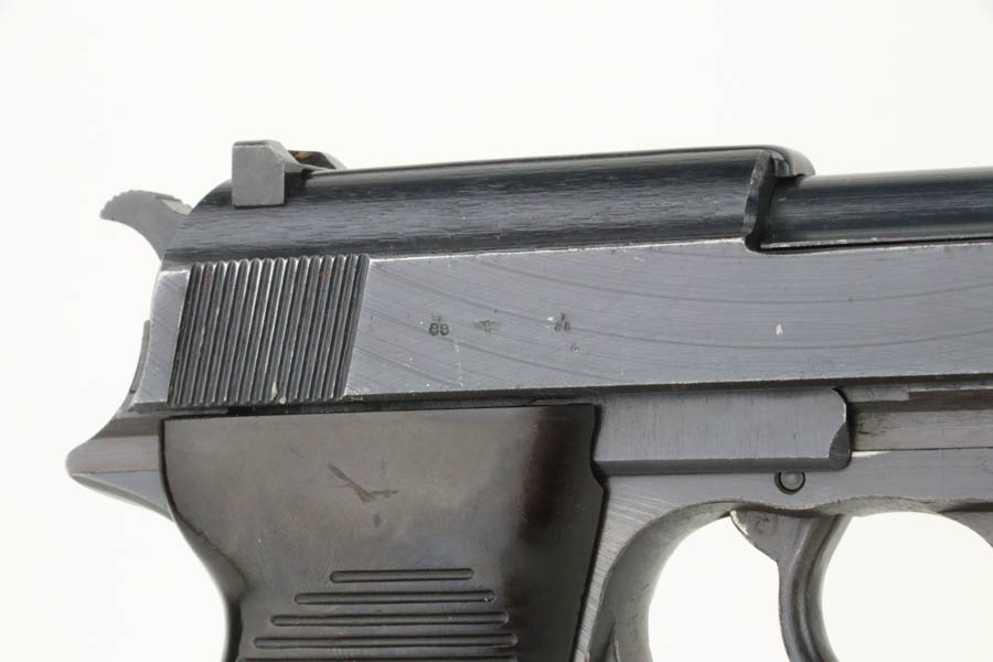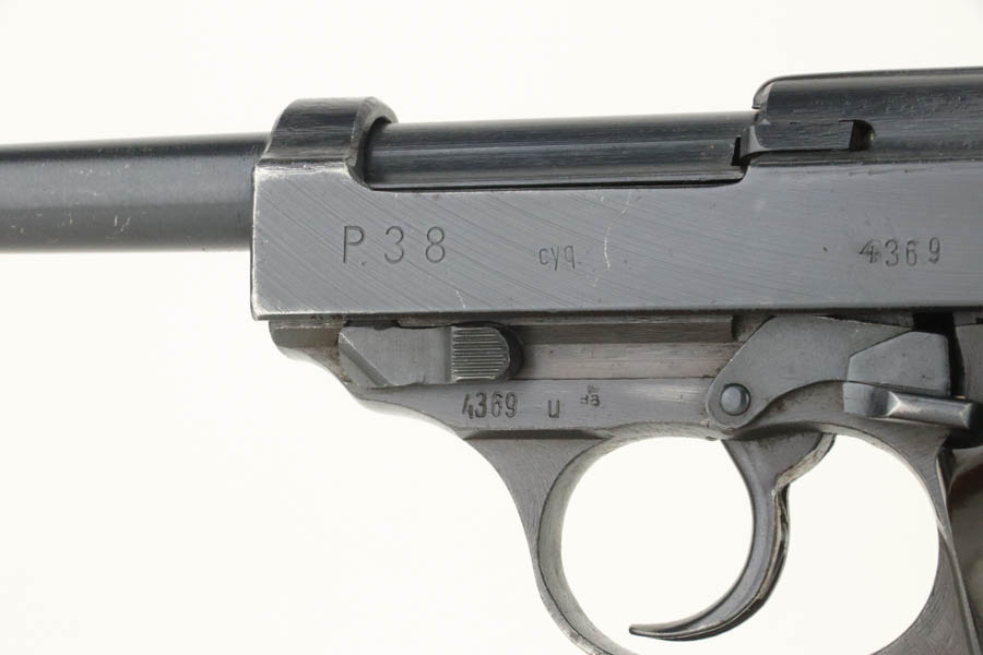 7/23/24 – This is a minty example of a Spreewerk P.38 issued to the Nazi military in September of 1944. All matching and has the proper “Eagle 88” military acceptance proofs. It comes as a rig with one “Eagle 135” marked Mauser magazine, one un-marked magazine, and a 1943-dated black leather hard shell holster (the leather is a bit dry cracking). The gun itself has retained about 97% of its original finish with just hints of wear around the muzzle and on the high edges and a hint of thinning on the front strap. Fitted with period-correct blackish-brown bakelite grips. Minty bore. De-cocker is functional.